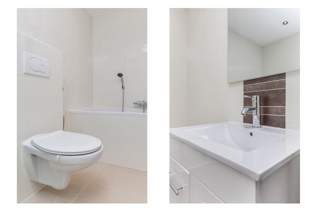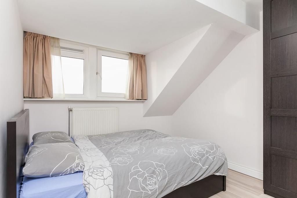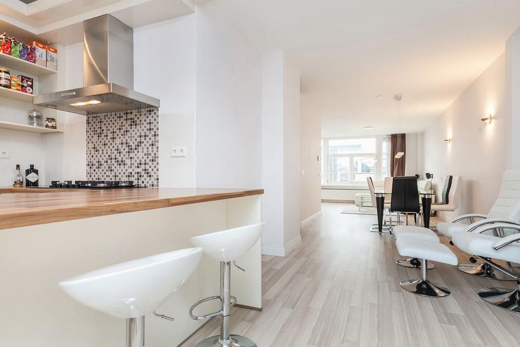 Op de overloop bevindt zich de moderne toiletruimte, een garderobe, meterkast en toegang tot de woonkamer. De ruime en lichte woonkamer is strak afgewerkt. Sfeerbepalend is tevens de moderne half open keuken met toegang tot het balkonnetje aan de achterzijde. In de U-vormige keukenopstelling zijn de vaatwasser, de 5-pits gas-op-glas kookplaat en oven ingebouwd. Extra kastruimte vindt u in het schiereiland met eetbar. De gehele verdieping is voorzien van een nette laminaatvloer. Vanuit de woonkamer leidt een vaste trap naar de slaapverdieping.