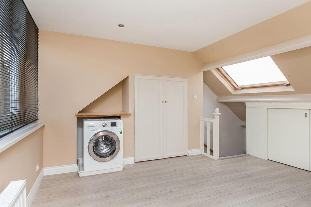 Lichte en ruime zolder met laminaatvloer, 2 Velux dakramen aan de voorzijde en kunststof dakkapel aan de achterzijde. Er is extra bergruimte gecreëerd onder de schuine dakzijde aan de voorkant. Tevens bevindt zich hier de opstelling voor wasmachine/droger en is de cv-installatie weggewerkt in een kastruimte.