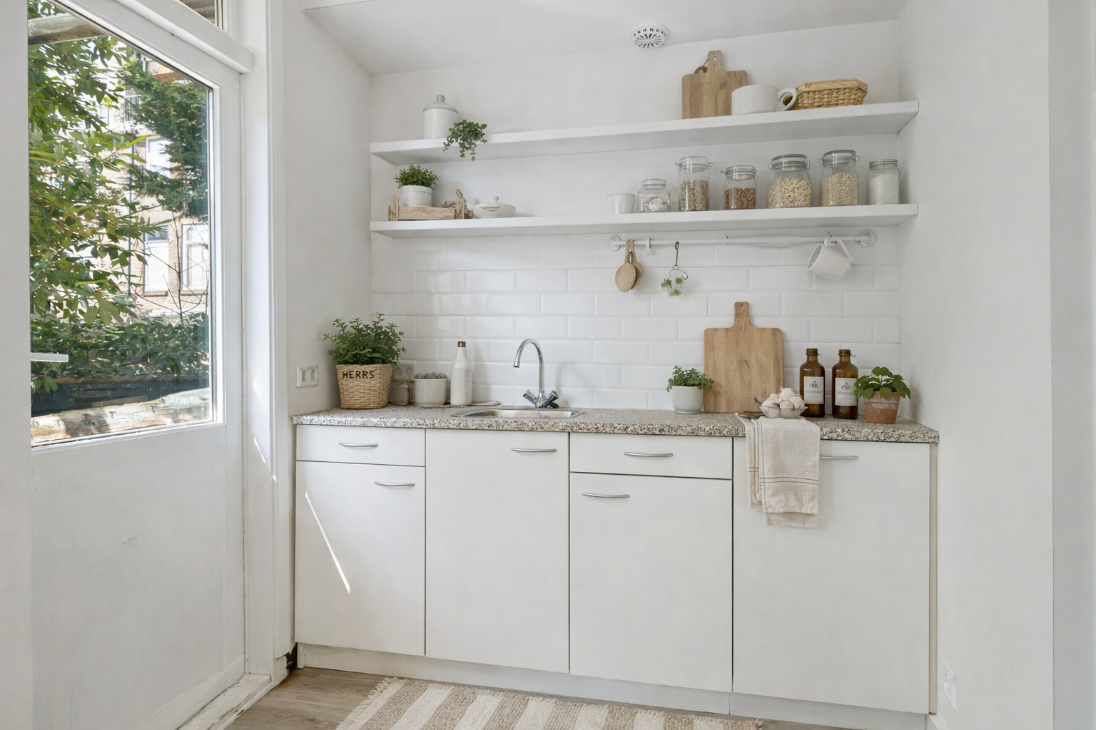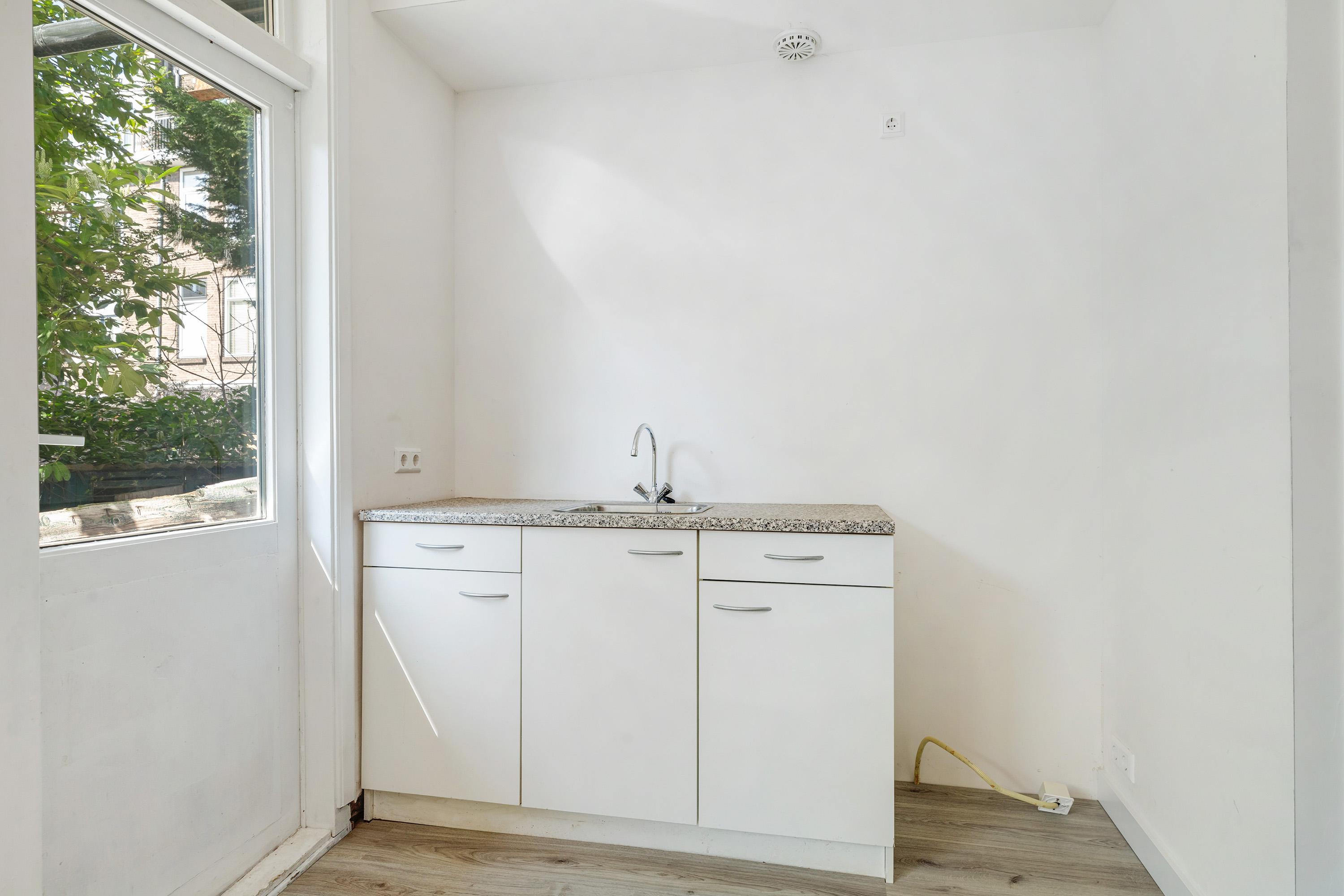 De slaapkamer bevindt zich aan de voorzijde van de woning, de badkamer ligt centraal in de woning en beschikt over een douche en toilet, aan de achter zijde bevindt zich de lichte woonkamer met open keuken wat het hart van de woning vormt (tevens bied de woonkamer een extra bergruimte die beschikt over een wasmachineaansluiting). Via de deur in de open keuken stap je zo de heerlijke achtertuin in, perfect om na werk nog even te genieten van de zon.