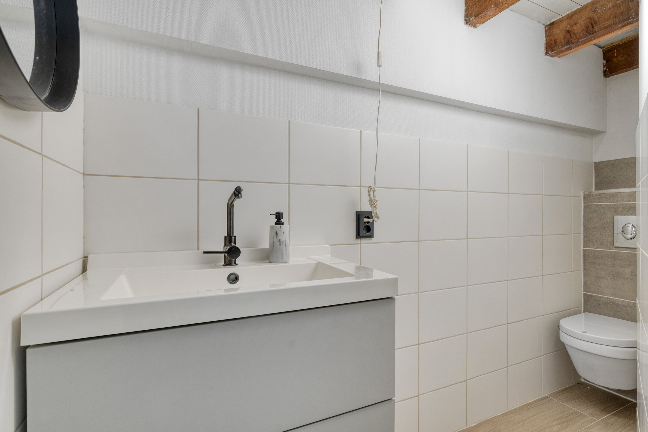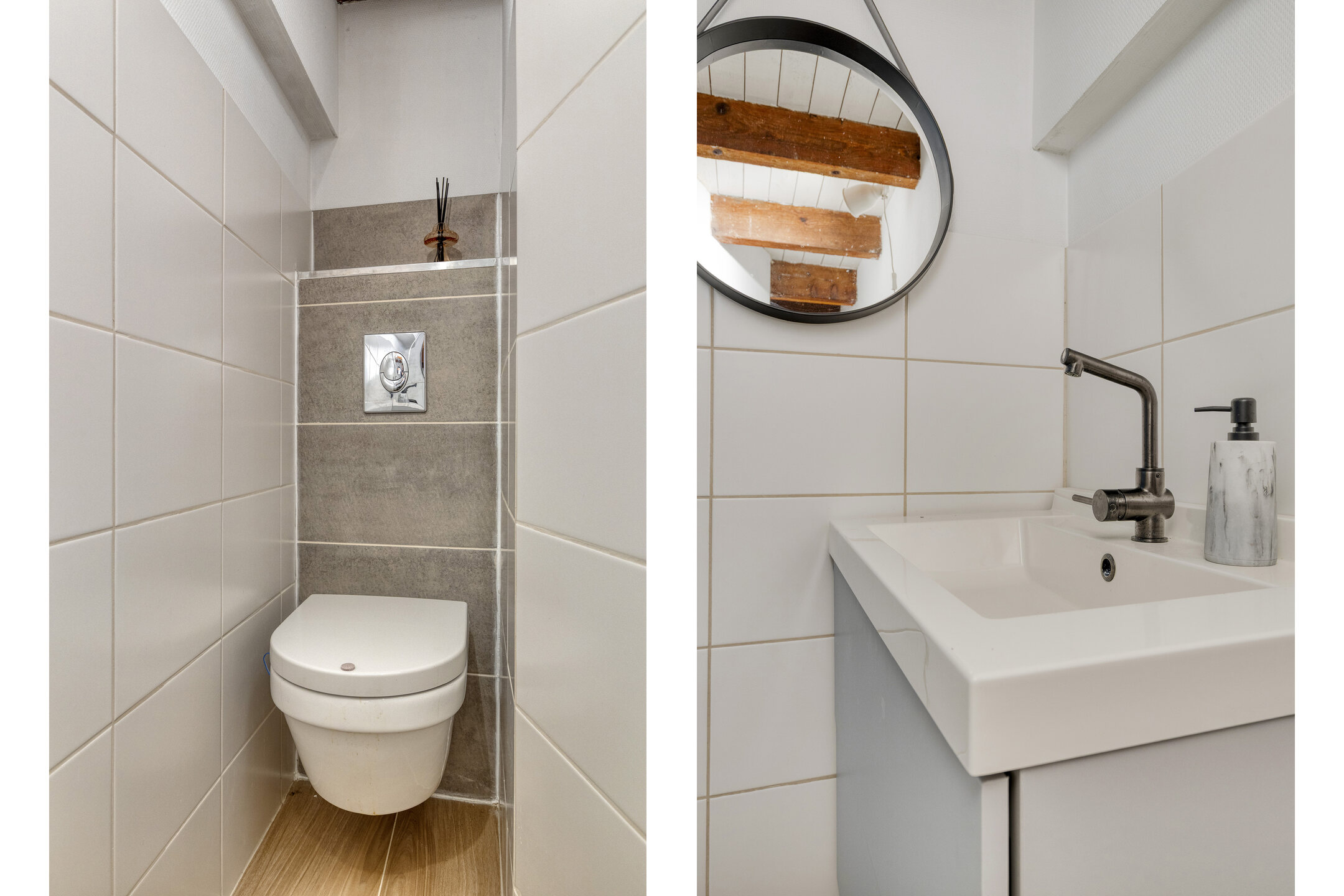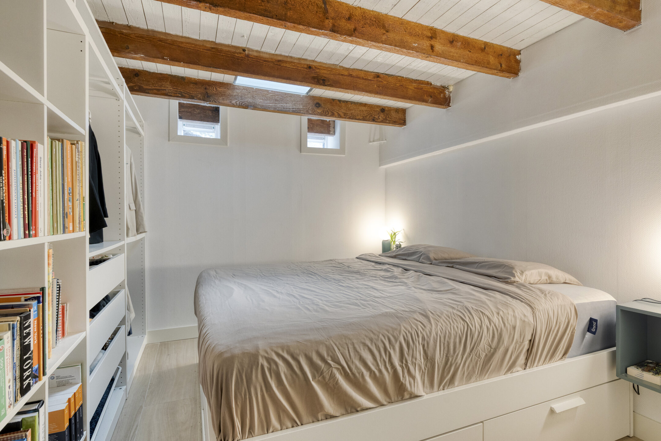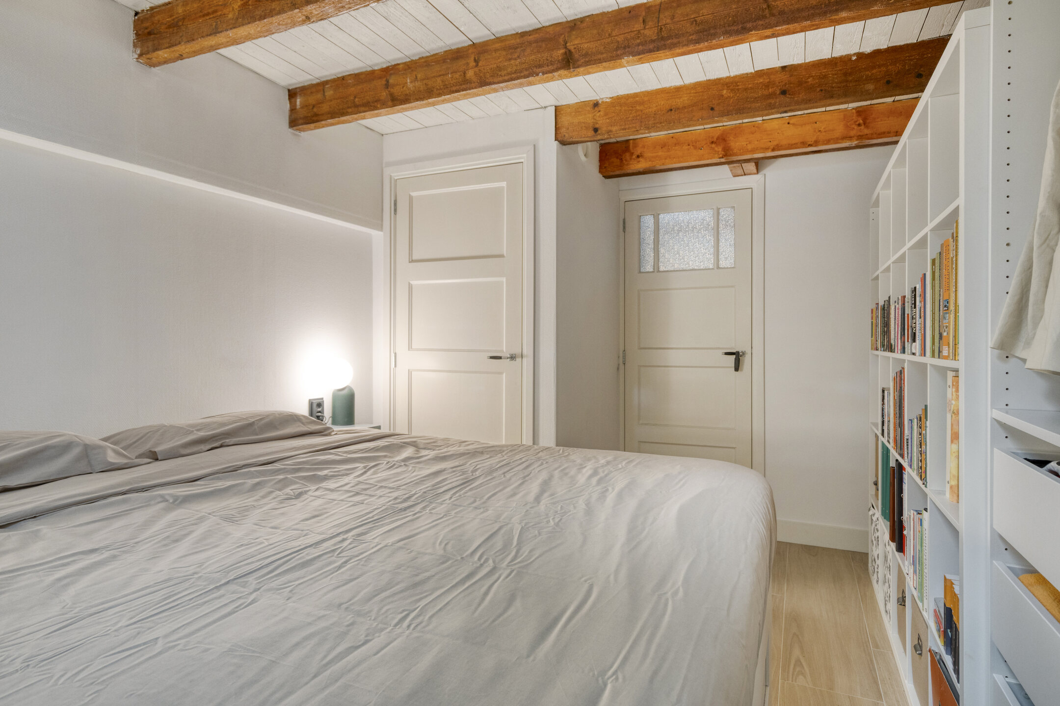 Bereikbaar via de woonkamer en voorzien van tegelvloer met vloerverwarming en een sfeervol balkenplafond. Hier bevinden zich drie slaapkamers: één aan de voorzijde met vaste kast en de unit van de mechanische ventilatie, en twee slaapkamers aan de achterzijde. Tevens een tweede toilet met wandcloset en wastafelmeubel.