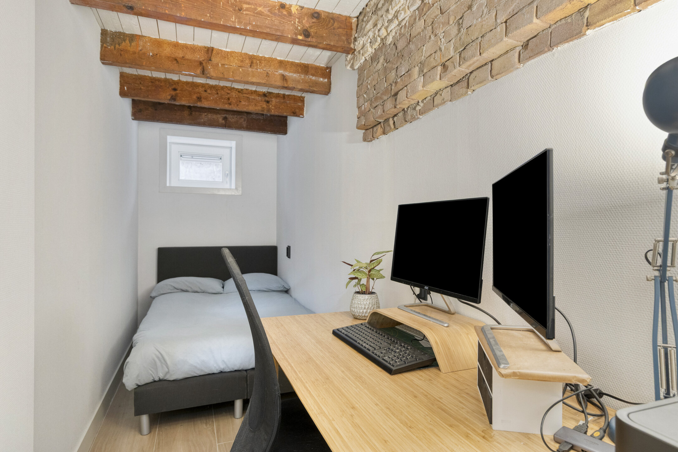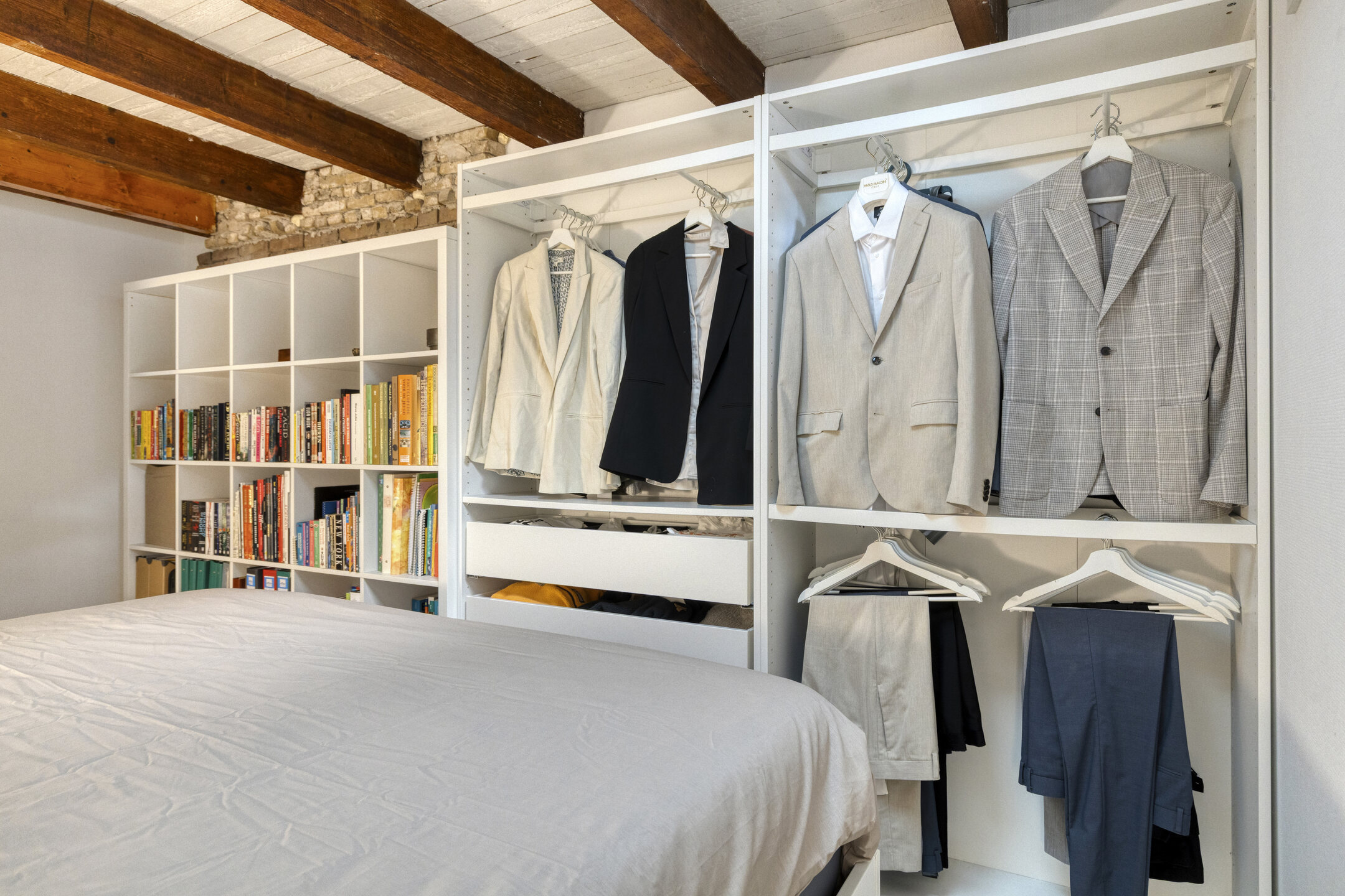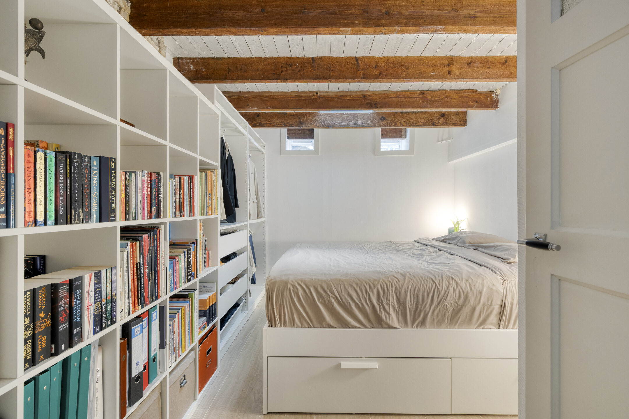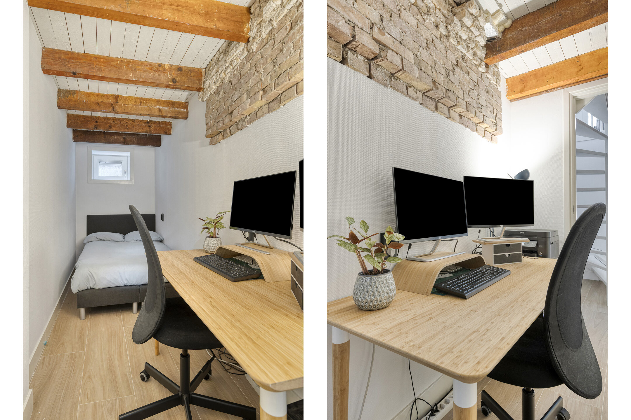 Bereikbaar via de woonkamer en voorzien van tegelvloer met vloerverwarming en een sfeervol balkenplafond. Hier bevinden zich drie slaapkamers: één aan de voorzijde met vaste kast en de unit van de mechanische ventilatie, en twee slaapkamers aan de achterzijde. Tevens een tweede toilet met wandcloset en wastafelmeubel.