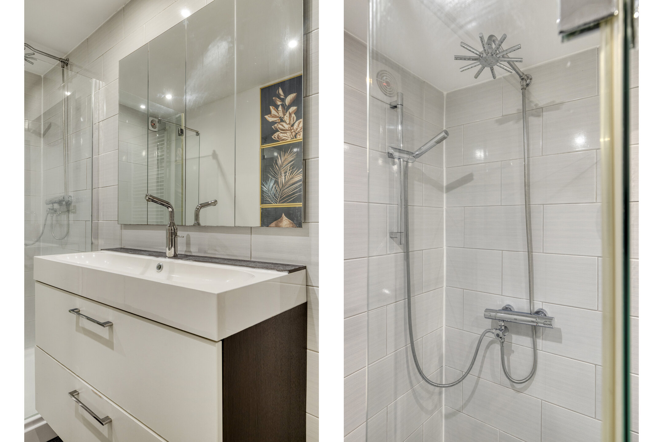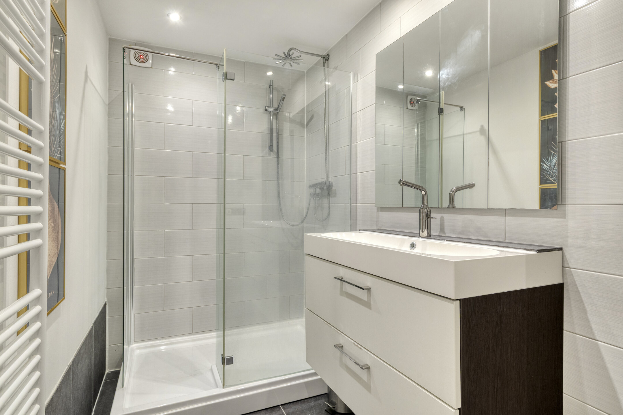 Praktische verdieping met bergruimte, aansluiting voor de wasmachine en een badkamer met ruime douche, wastafelmeubel, handdoekenradiator en mechanische afzuiging.