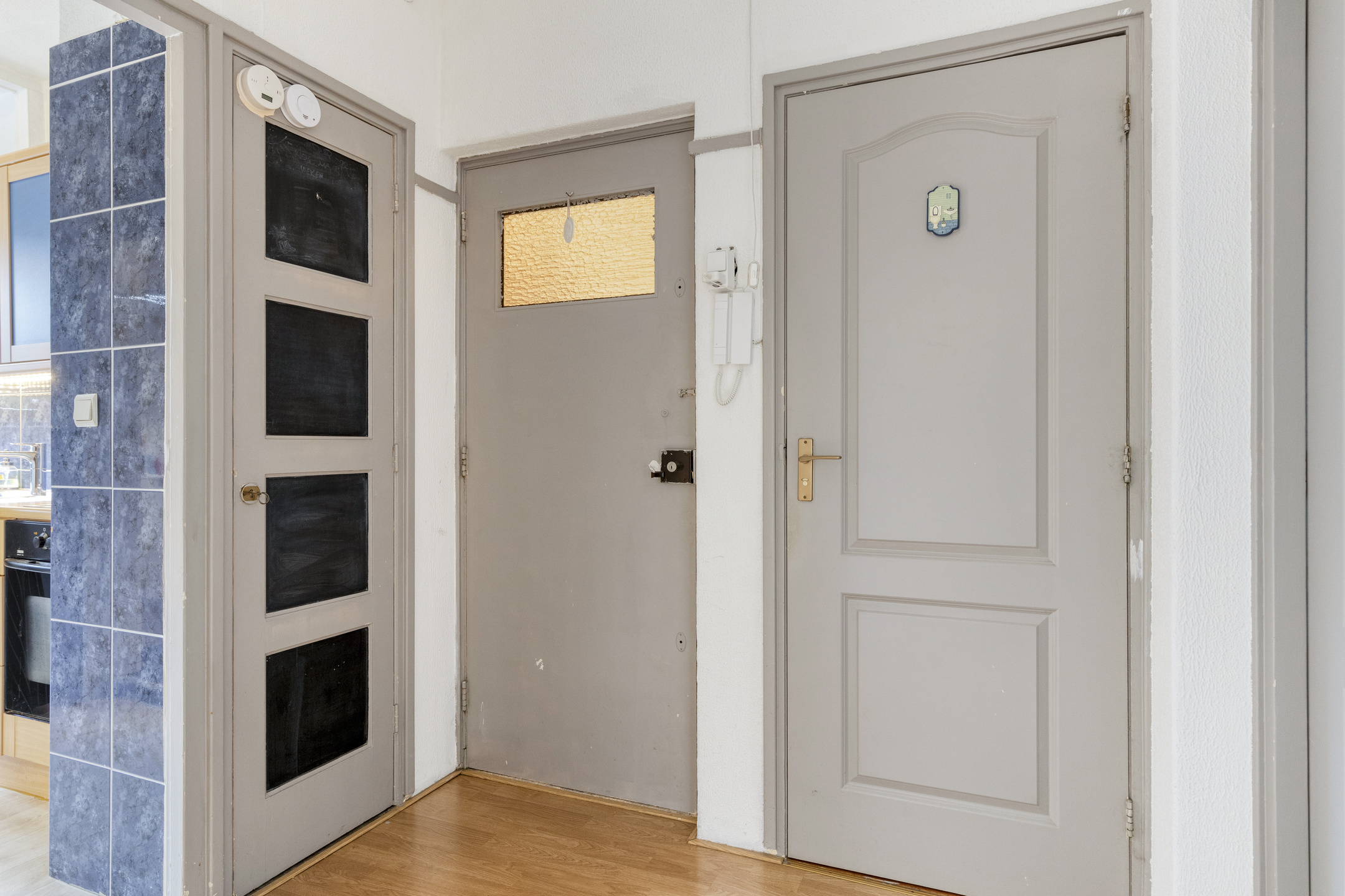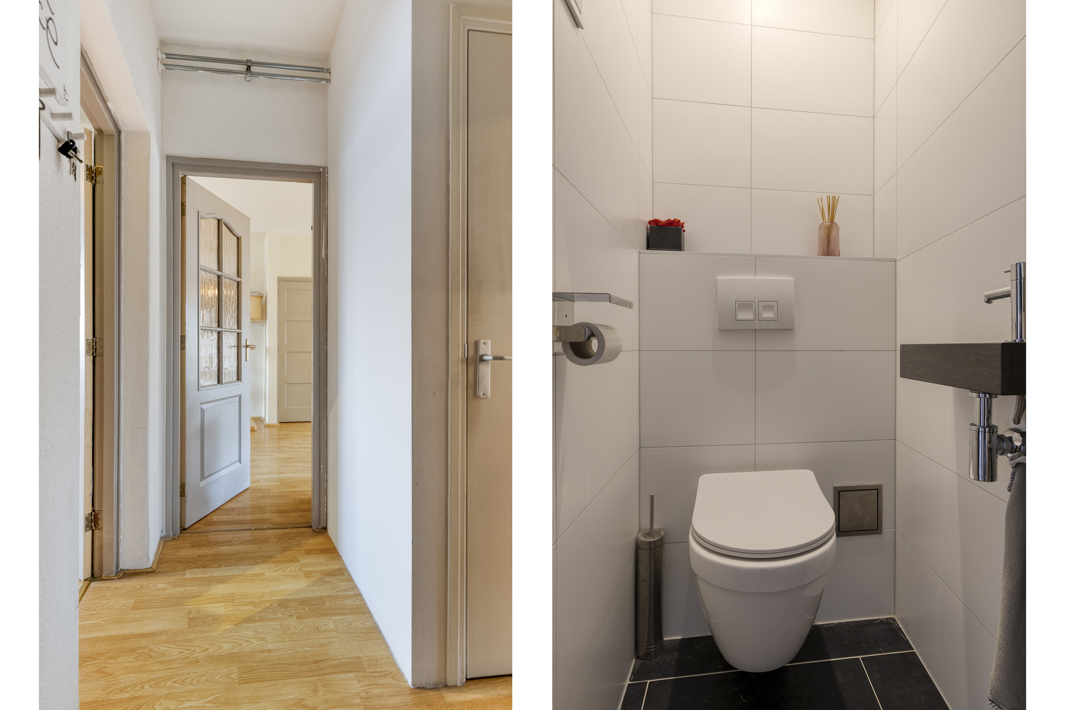 Entree/hal met toegang tot alle vertrekken. Hier bevinden zich tevens de meterkast en een aparte wasruimte – praktisch en netjes weggewerkt. Het geheel betegelde toilet is uitgevoerd met een wandcloset en fonteintje. De woning beschikt over twee goed bemeten slaapkamers, beide met een prettige lichtinval en diverse indelingsmogelijkheden.