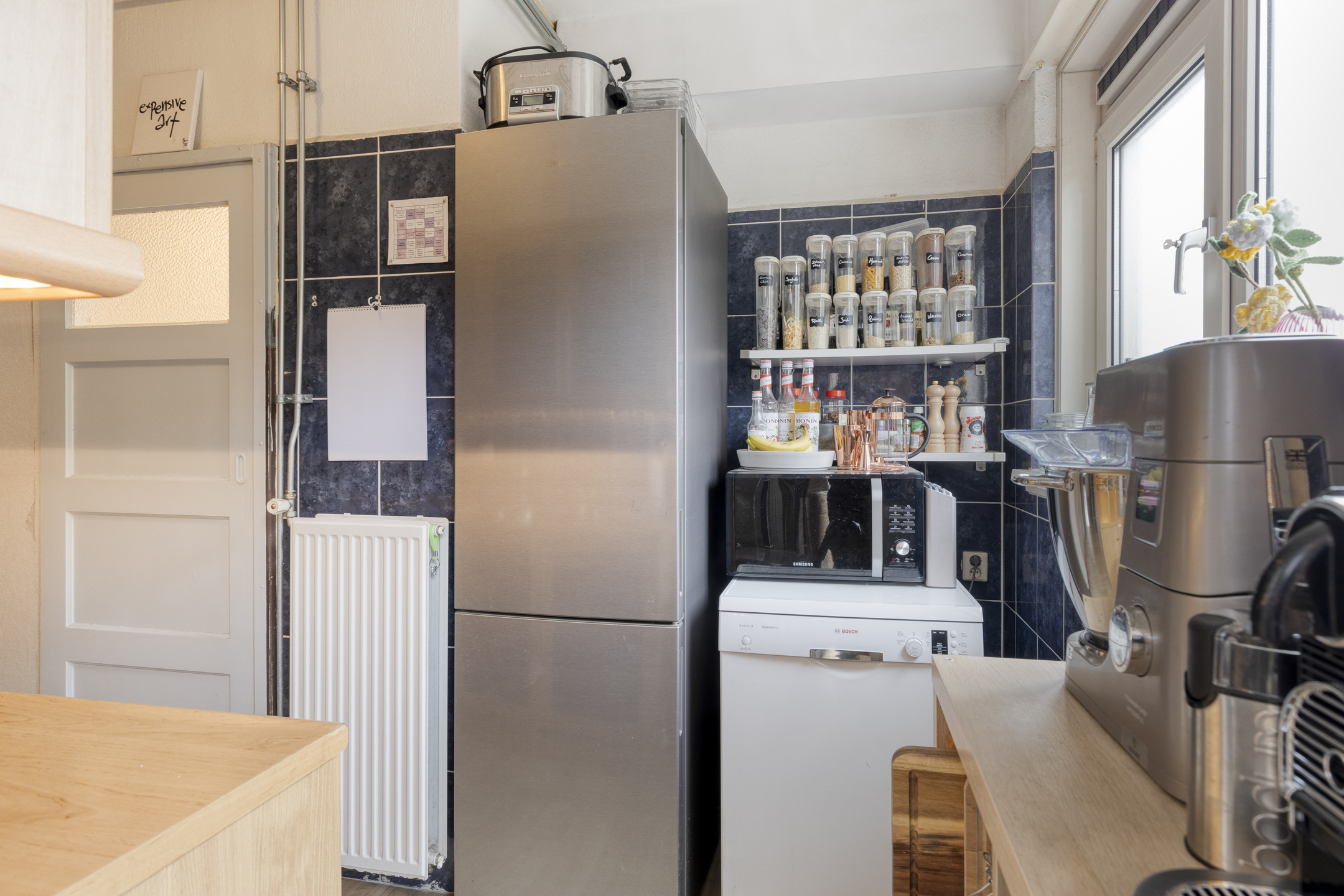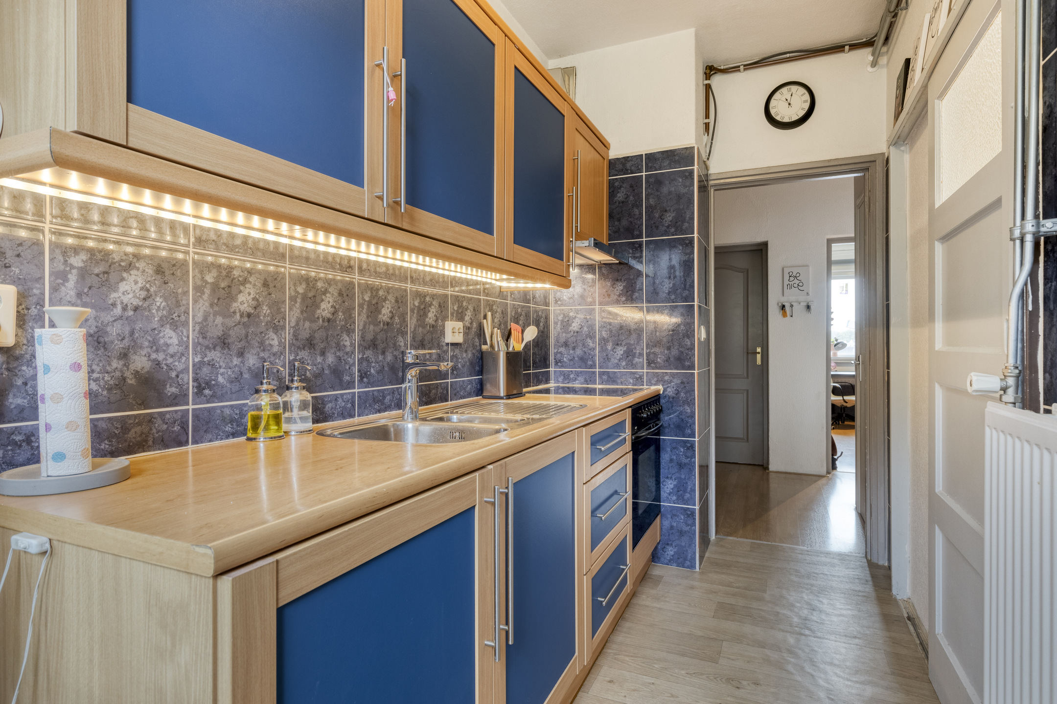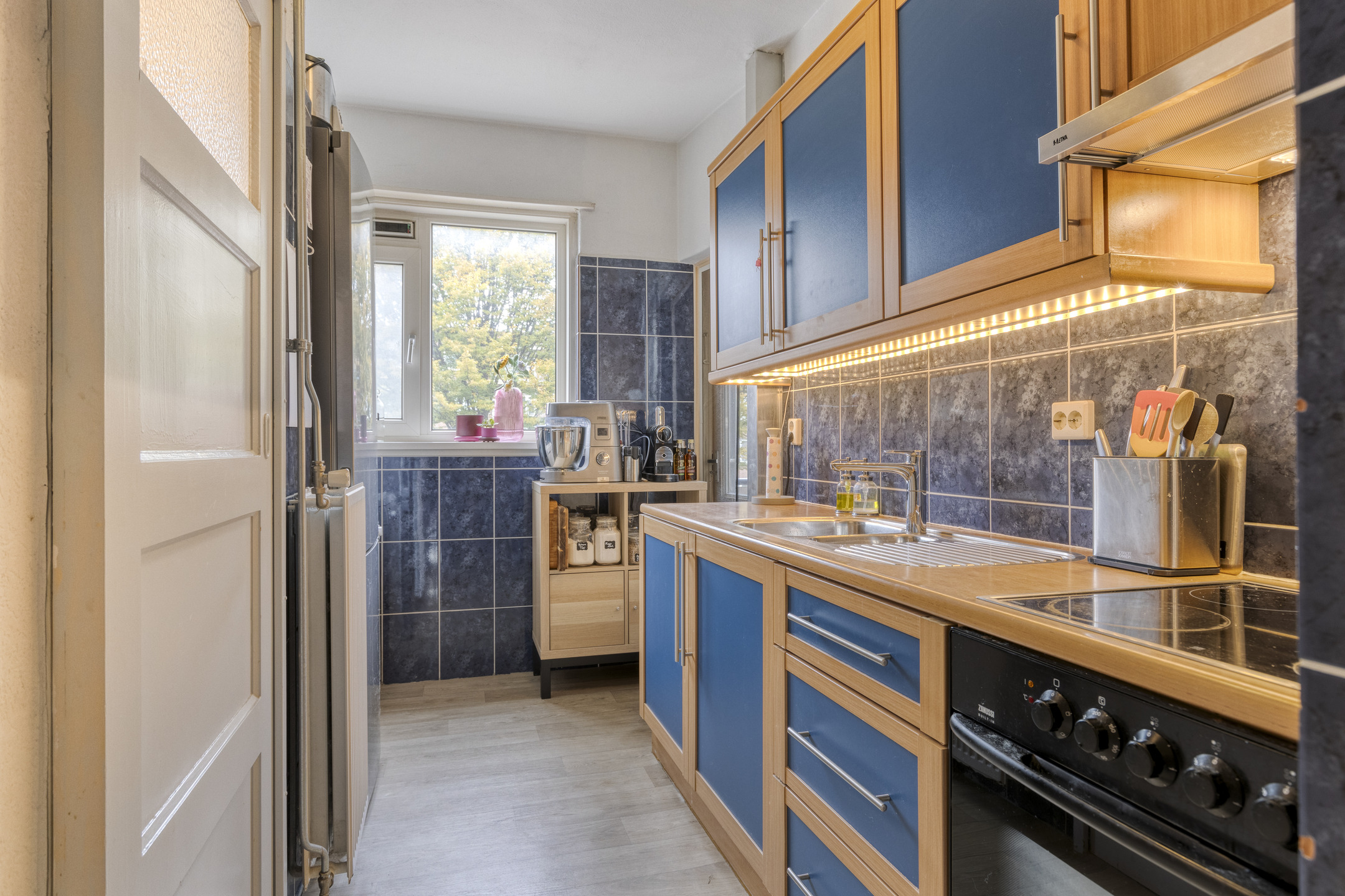 De dichte keuken is opgesteld in een nette wandopstelling en voorzien van een keramische kookplaat, vlakscherm afzuigkap en oven. Vanuit de keuken is er toegang tot het kleine balkon aan de voorzijde, gelegen op het noorden – een fijne plek voor een kop koffie in de ochtendzon. Via de keuken is tevens de geheel fraai betegelde badkamer bereikbaar, welke is voorzien van een douche, modern wastafelmeubel en mechanische ventilatie. De lichte doorzonwoonkamer is ruim van opzet en beschikt over een vaste kast. Dankzij de grote raampartijen aan zowel de voor- als achterzijde geniet je hier van een heerlijke hoeveelheid daglicht. Vanuit de woonkamer stap je zo het ruime balkon aan de achterzijde op, gunstig gelegen op het zonnige zuiden – perfect om van de middag- en avondzon te genieten.