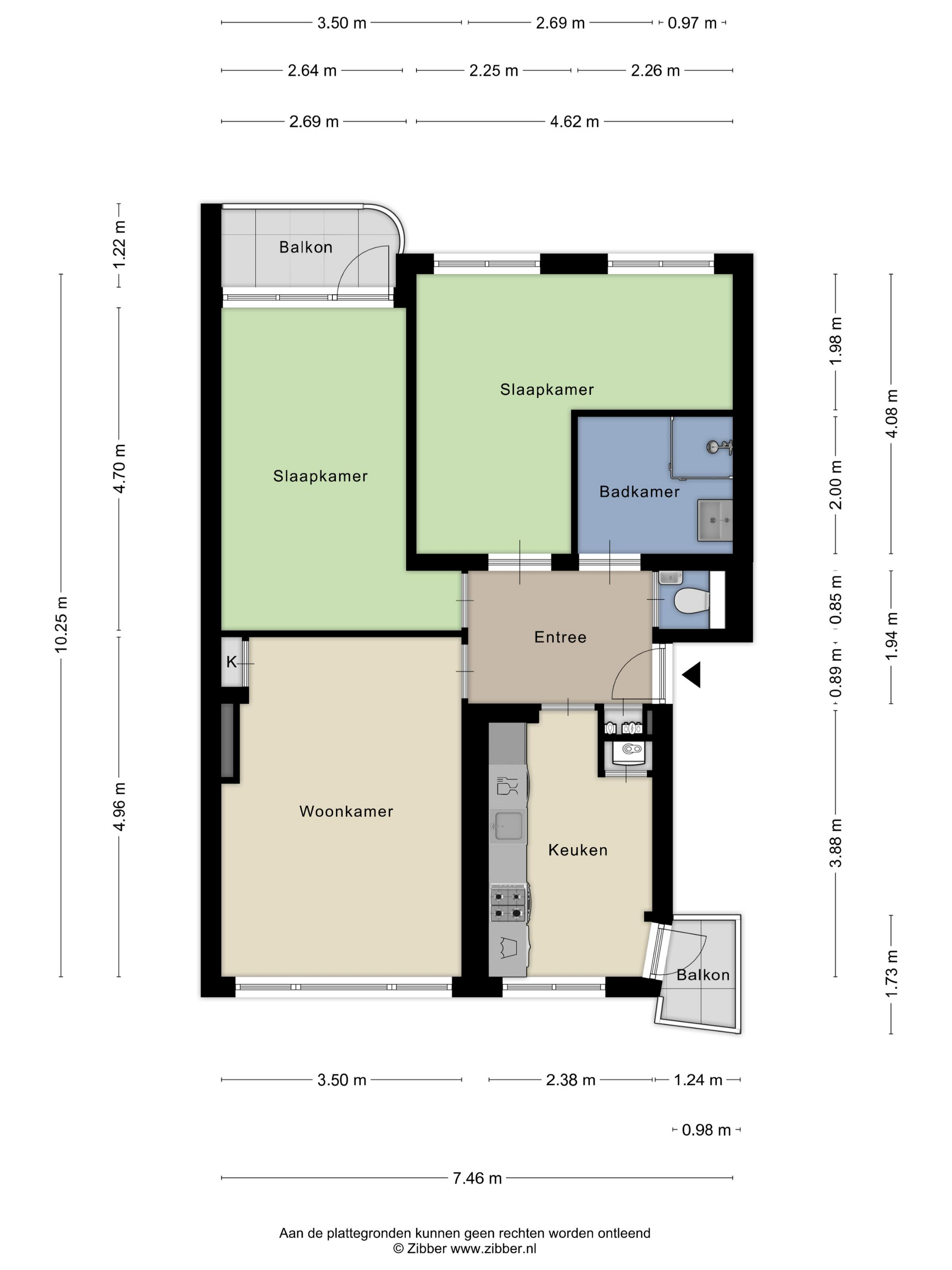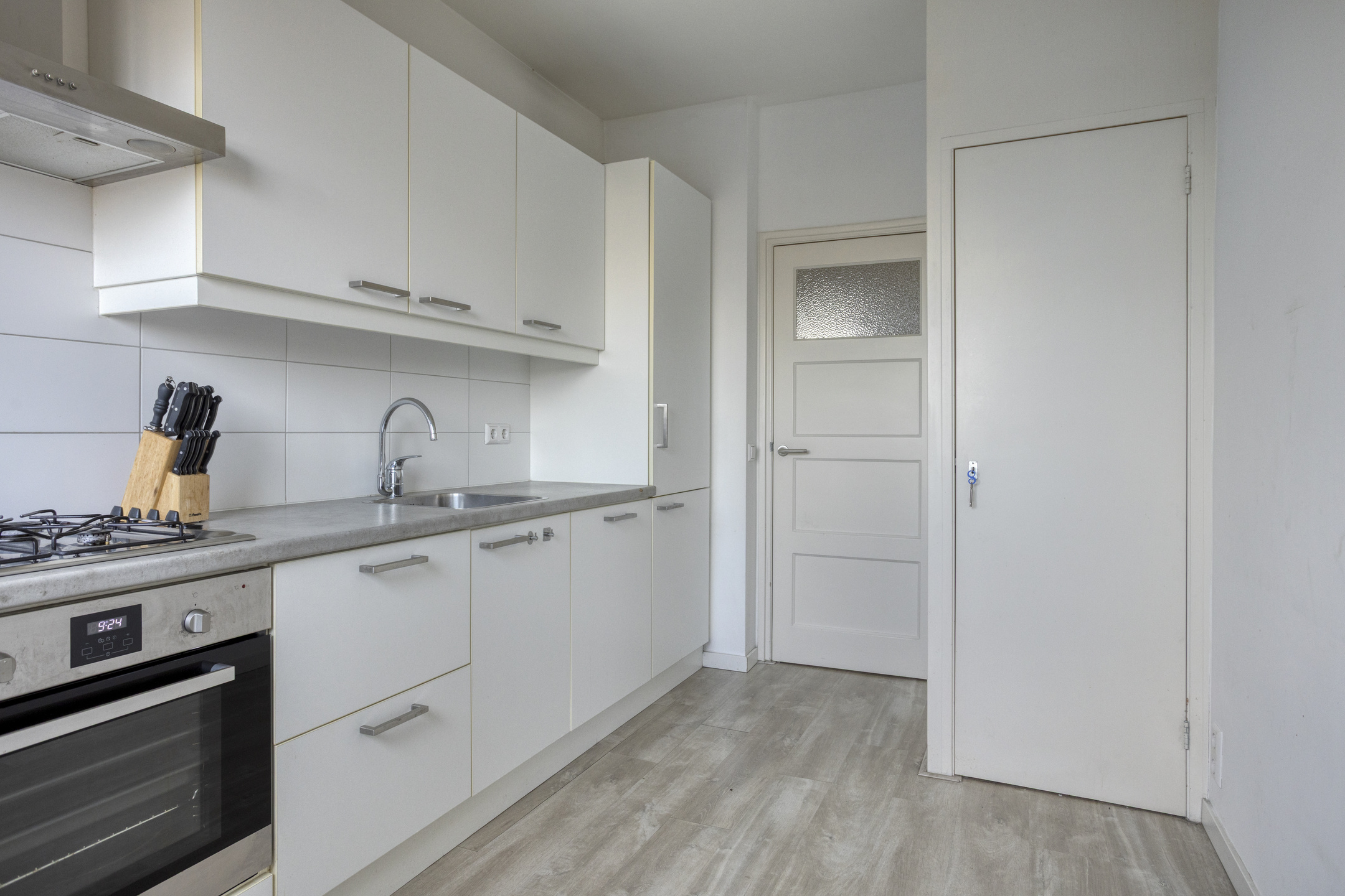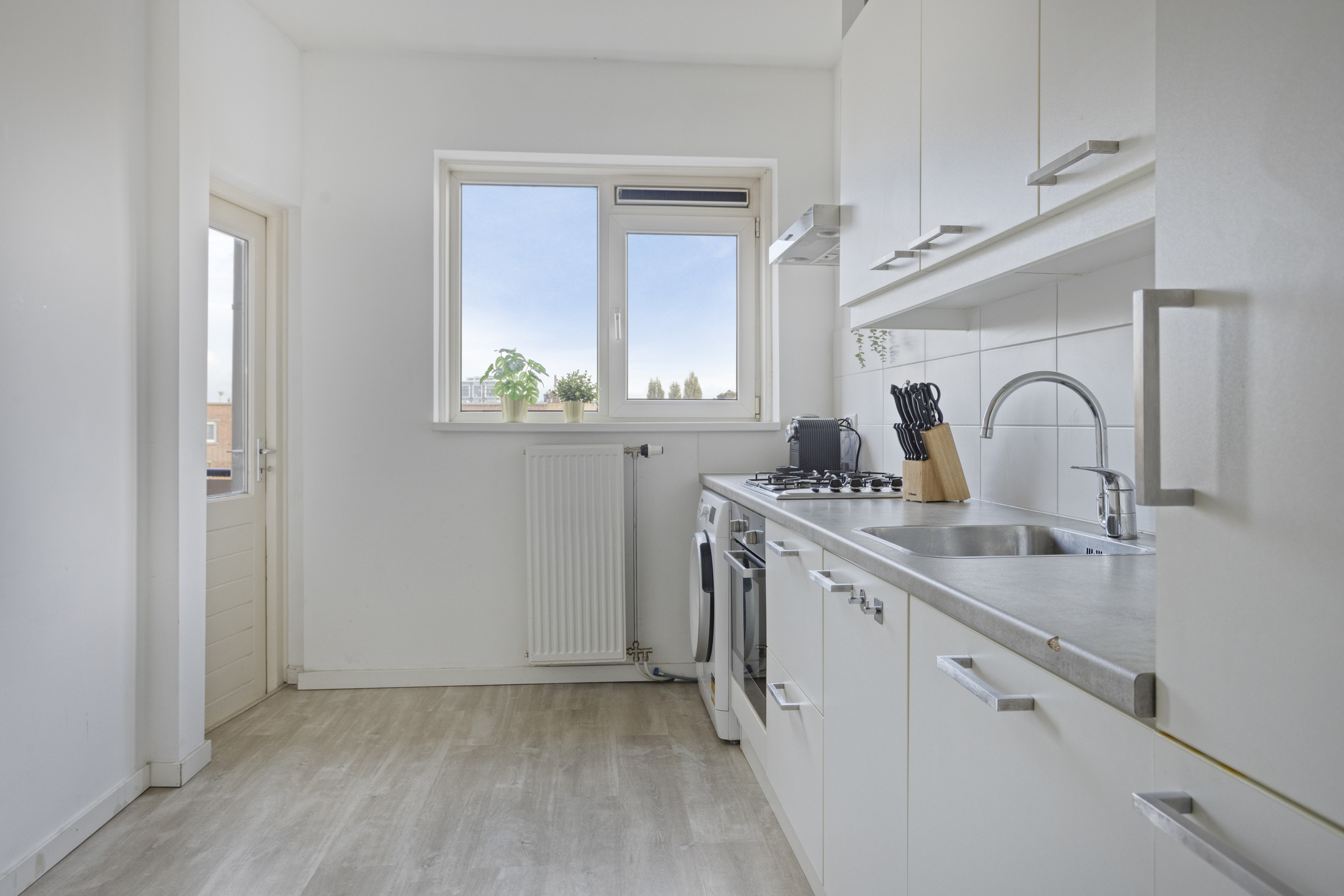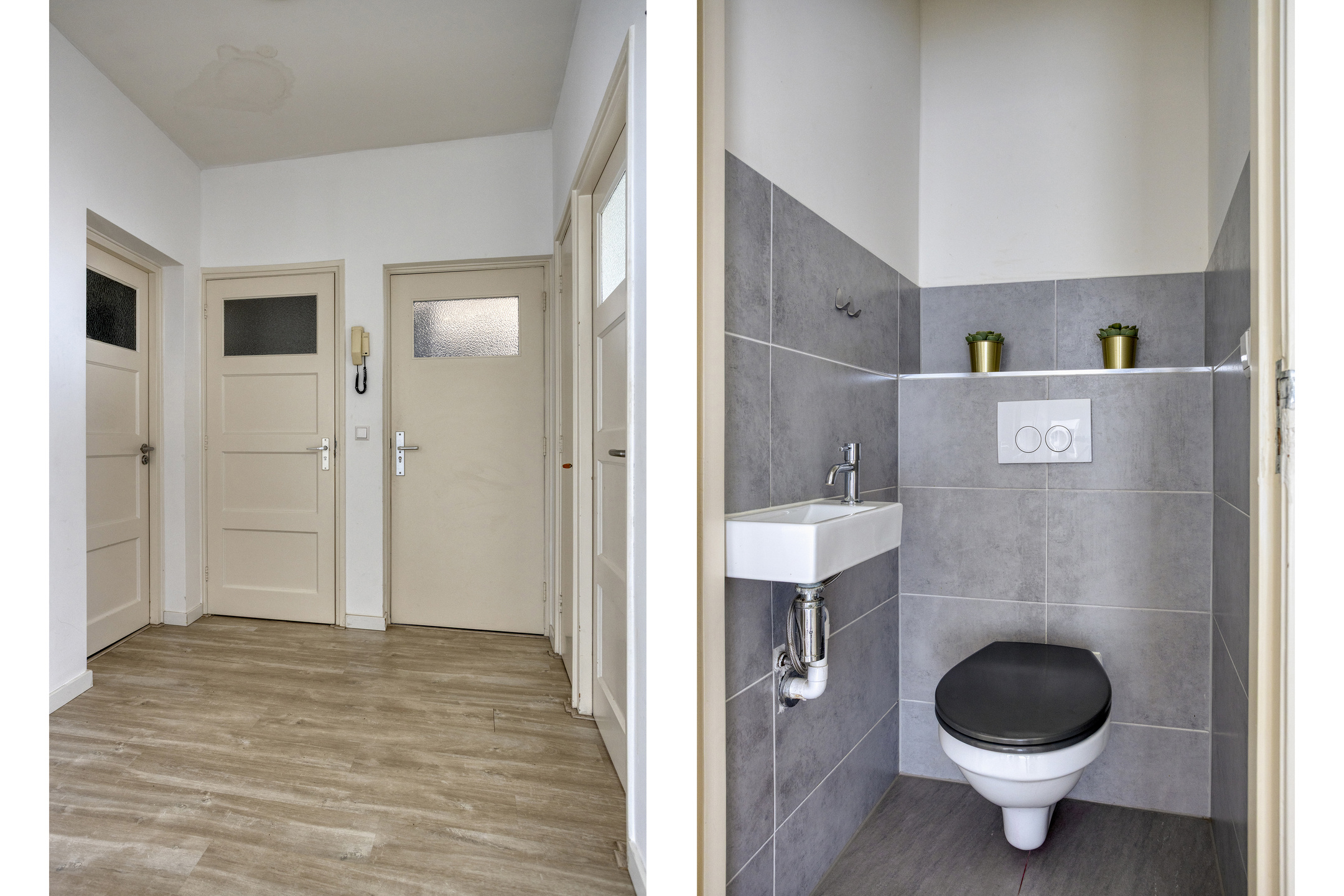 Entree, hal met toegang tot alle vertrekken. Hier bevindt zich tevens de meterkast, praktisch en netjes weggewerkt in een vaste kast. De lichte woonkamer is ruim van opzet en beschikt over een vaste kast voor extra opbergruimte. Dankzij de grote raampartij geniet je hier van een heerlijke hoeveelheid daglicht. De keuken is opgesteld in een nette wandopstelling en voorzien van inbouwapparatuur, o.a. een 4-pits gaskookplaat, afzuigkap, oven, vaatwasser, koel-/vriescombinatie en aansluiting voor de wasmachine. Vanuit de keuken is er toegang tot het kleine balkon aan de voorzijde, gelegen op het noorden. De woning beschikt over twee riante slaapkamers, beiden gelegen aan de achterzijde van de woning. De linker slaapkamer geeft toegang tot het ruime balkon aan de achterzijde, gunstig gelegen op het zonnige zuiden, perfect om van de middag- en avondzon te genieten. De rechter slaapkamer beschikt over een praktisch ingericht hoekje dat zich perfect leent als werkplek, leeshoek of kaptafel, een fijne toevoeging aan de ruimte. De moderne badkamer is voorzien van een inloopdouche, wastafelmeubel met spiegel, designradiator en mechanische ventilatie. Separaat bevindt zich de betegelde toiletruimte, uitgevoerd met een wandcloset en fonteintje.
