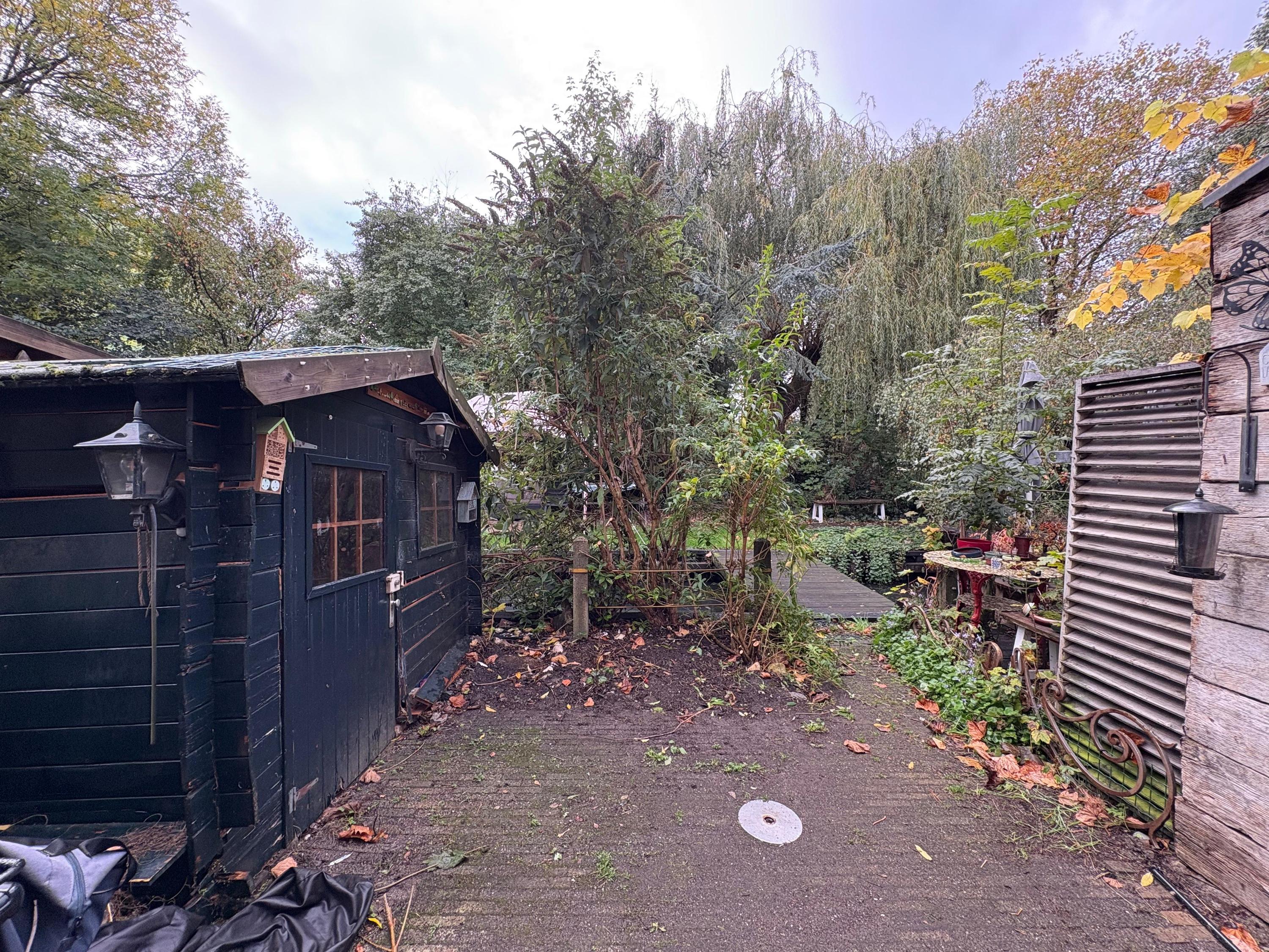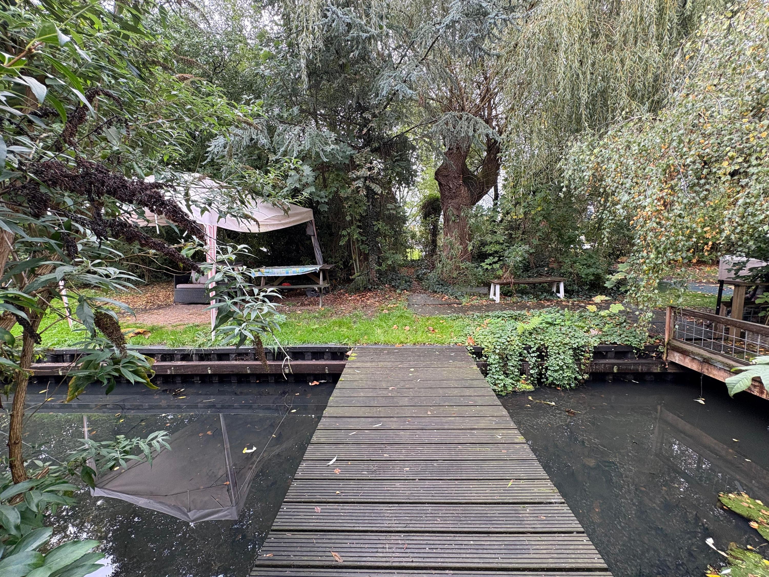 De achtertuin is gelegen op het zuiden, met sierbestrating, diversiteit aan groen en heeft een vlonder over het water heen.