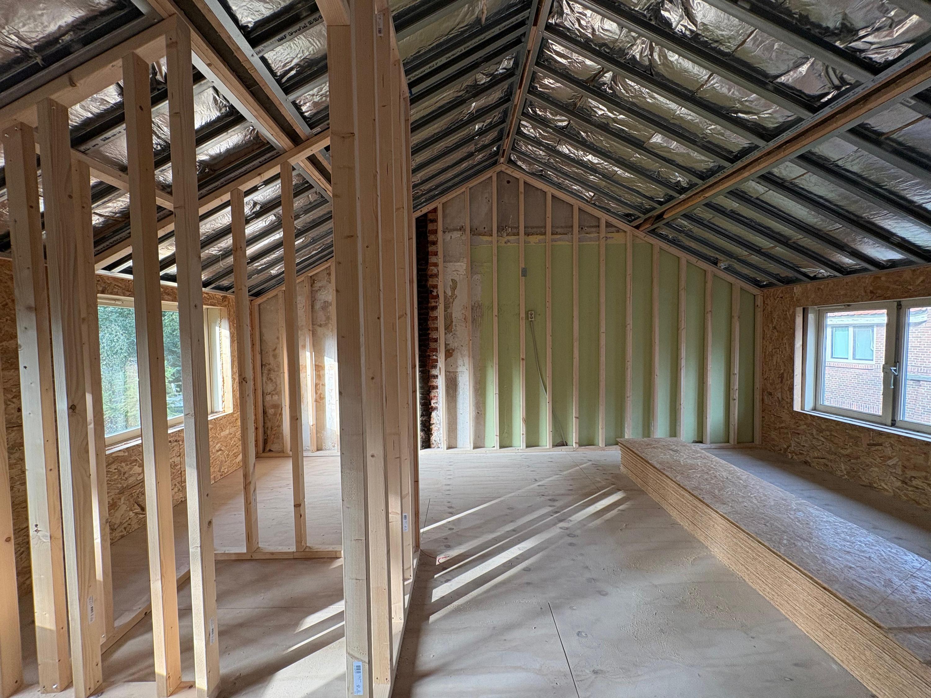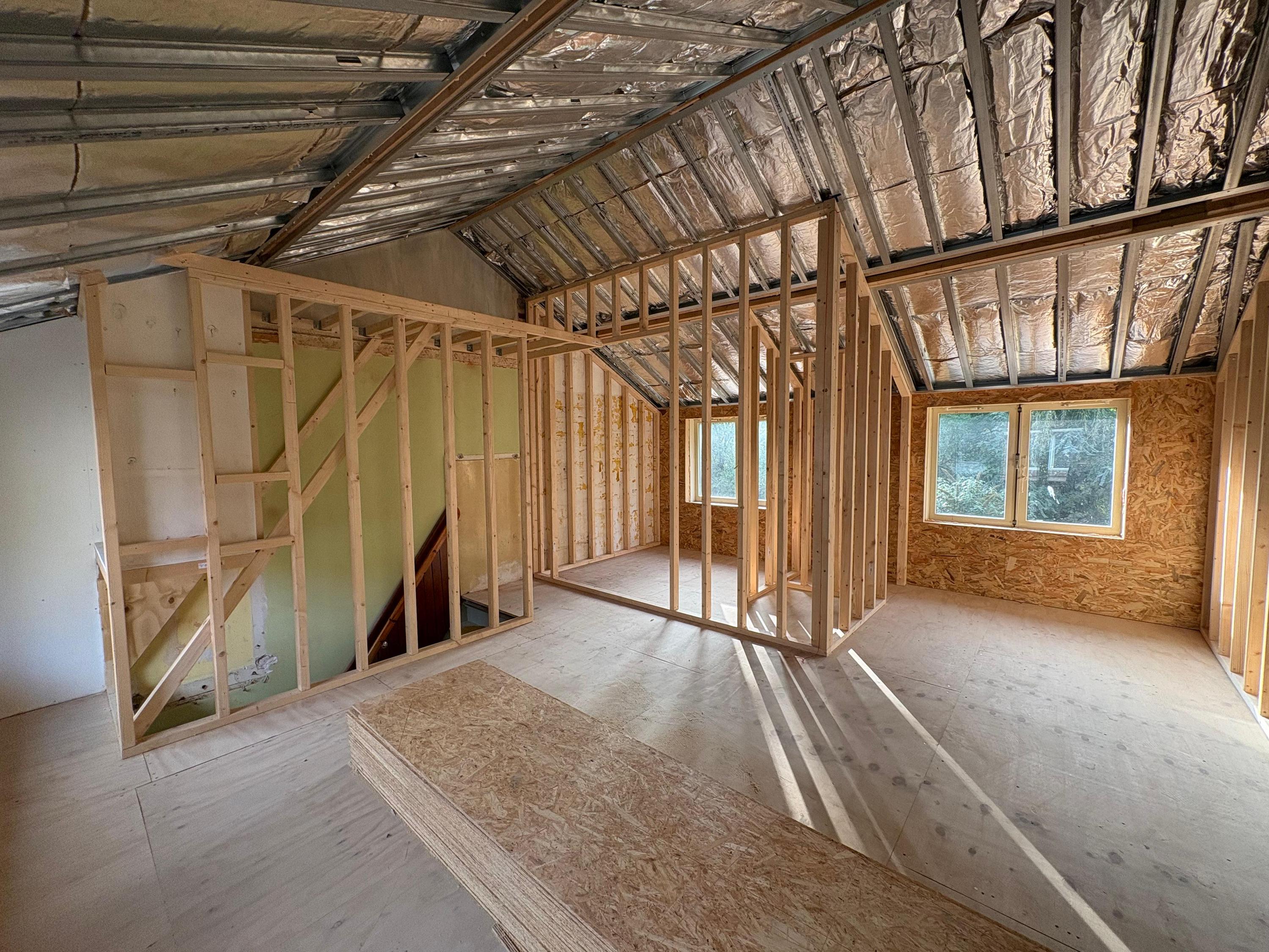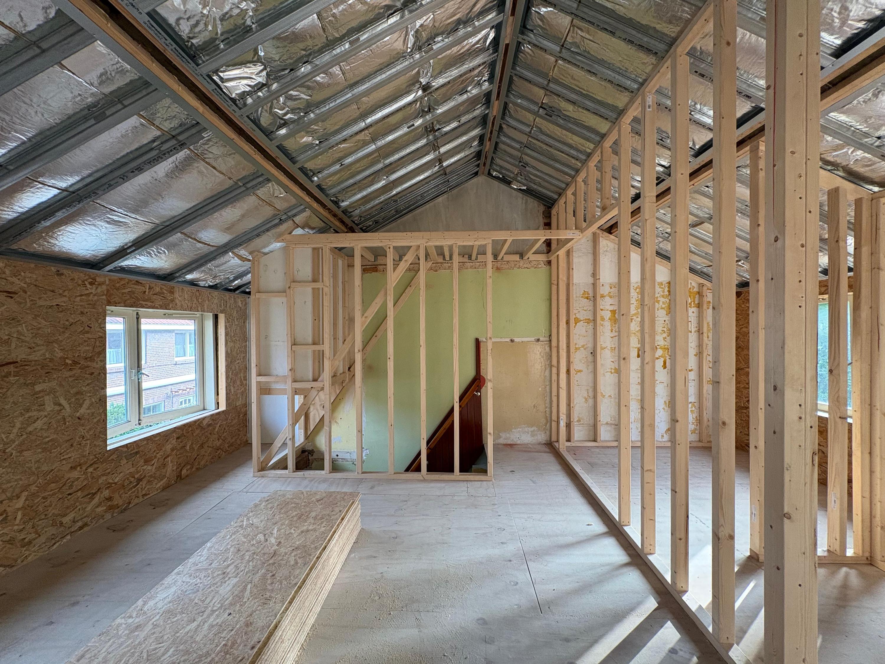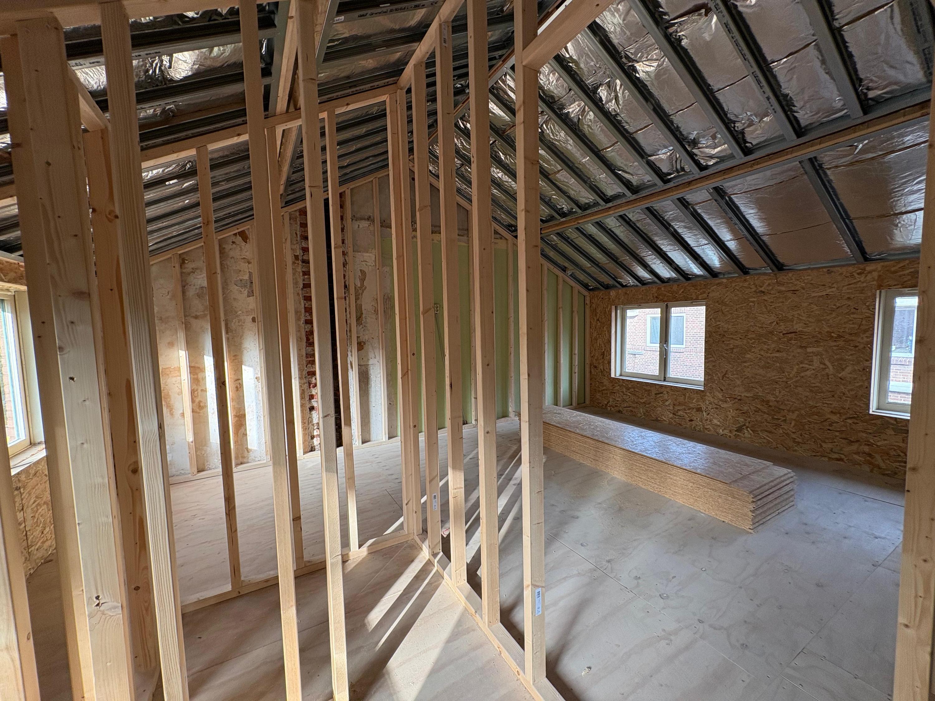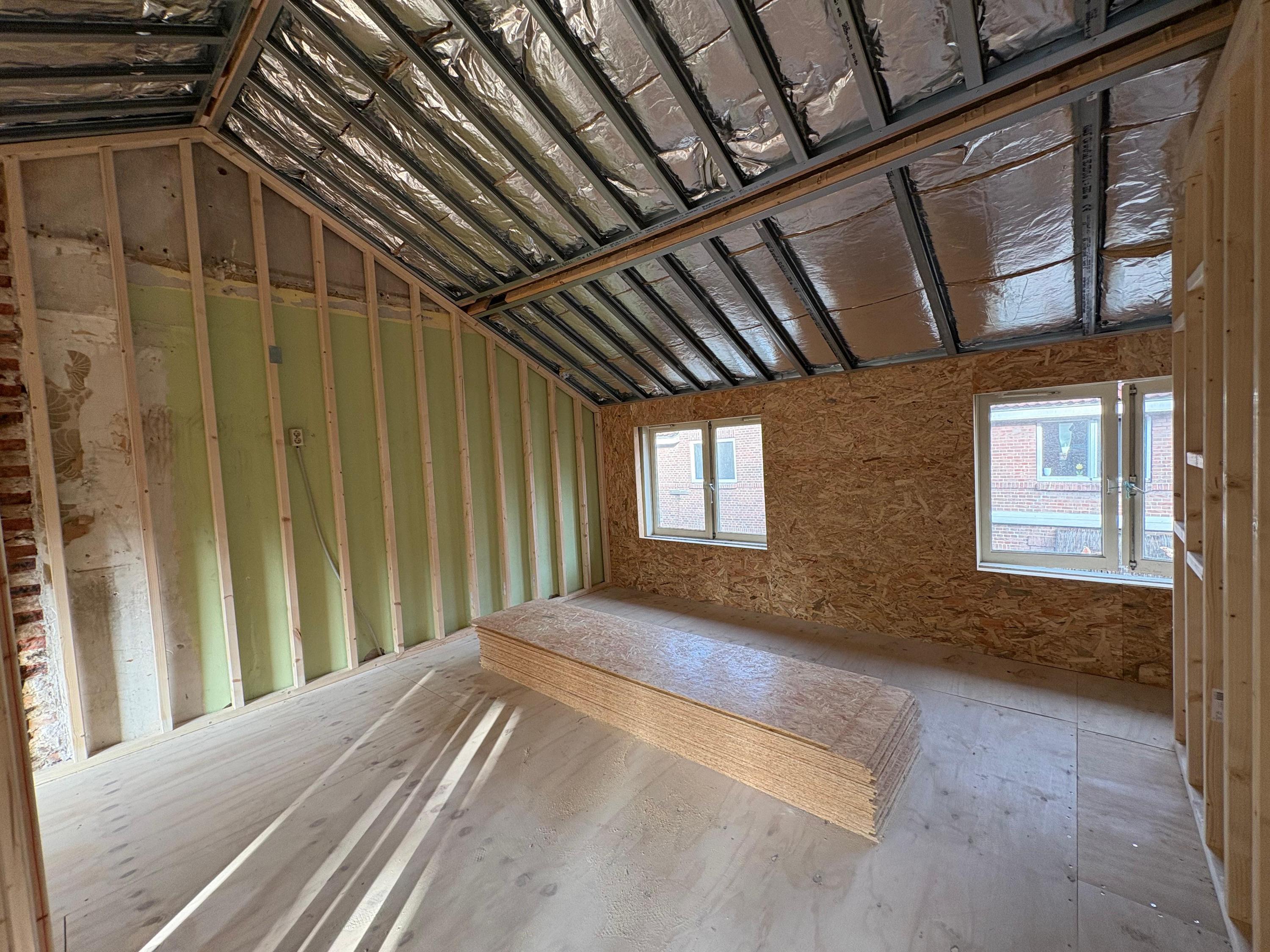 De eerste verdieping biedt een mooie basis om verder op te bouwen. De houten constructie is al geplaatst, de rest wacht nog op jouw creatieve invulling. Maak hier precies de ruimte die jij voor ogen hebt! Dankzij de ramen aan zowel de voor- als achterzijde geniet de ruimte van veel natuurlijke lichtinval.