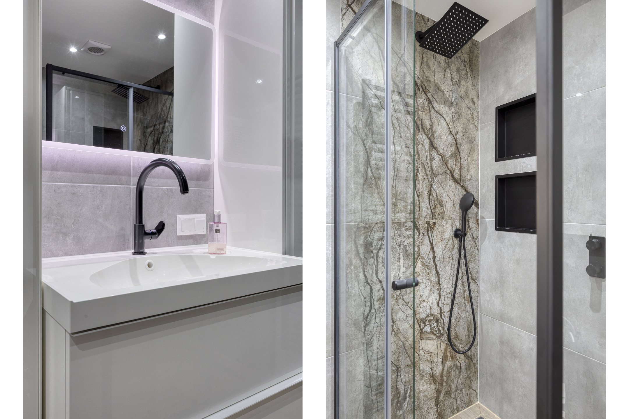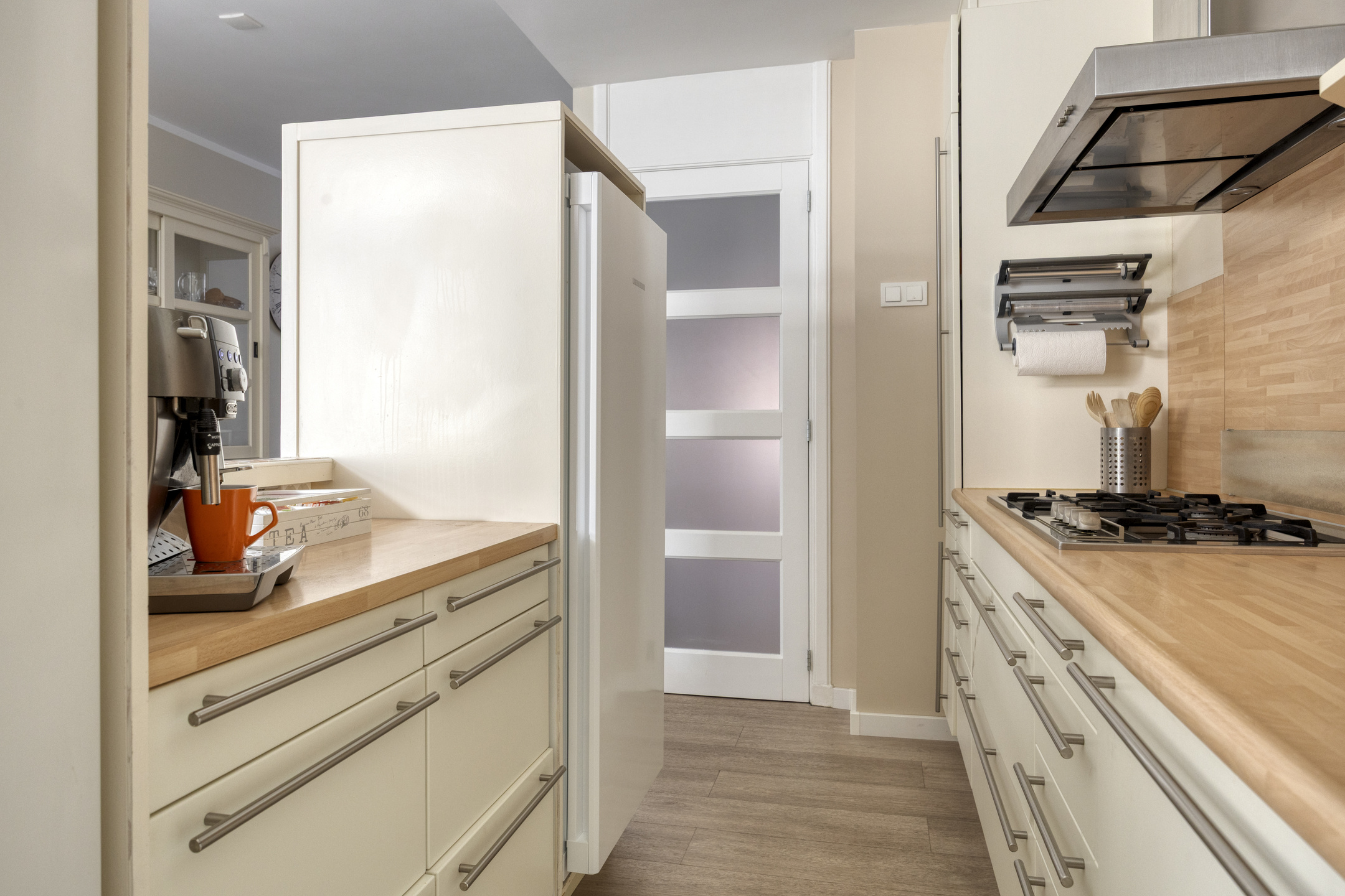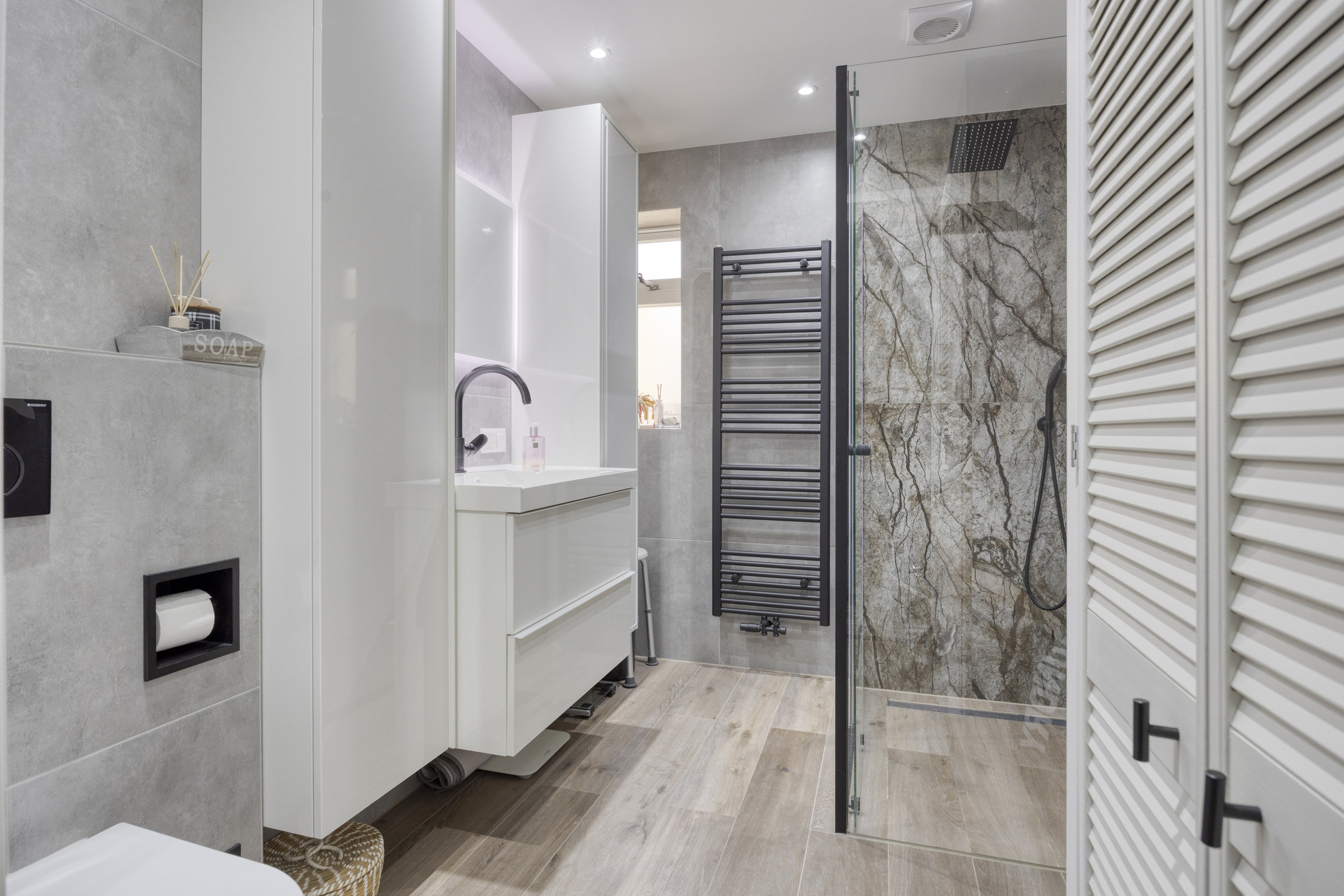 De luxe, recent vernieuwde badkamer is een echte eyecatcher: geheel betegeld en uitgerust met een tweede wandcloset, stijlvol badmeubel, handdoekenradiator, royale inloopdouche, vloerverwarming en mechanische ventilatie. Daarnaast is er een aparte en ruime wasruimte met aansluitingen voor wasmachine en droger. De gehele verdieping is strak afgewerkt met gestuukte wanden en plafonds.
