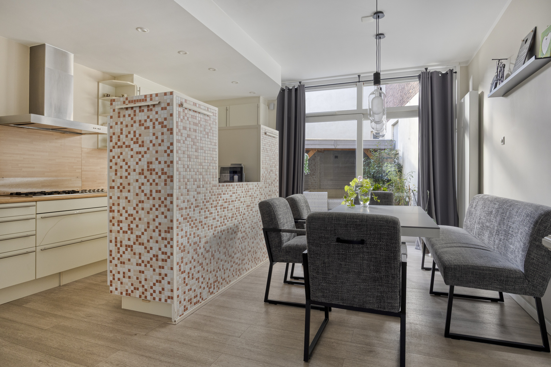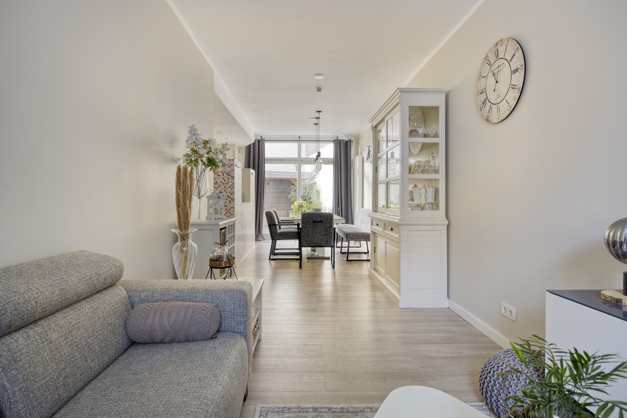 De ruime hal biedt toegang tot een praktische bergkast onder de trap en een keurig toilet. Binnen tref je een sfeervolle en strak afgewerkte leefruimte met een moderne pvc-vloer en glad gestuukte wanden en plafonds. De open keuken is een echte blikvanger en voorzien van alle gemakken: een 5-pits gaskookplaat met RVS afzuigkap, apothekerskast, grote koelkast en vriezer, oven, magnetron en handige draaicarrousel. De lichte woonkamer heeft een prettige indeling met volop ruimte voor een royale zit- en eethoek, en biedt een mooie verbinding met de tuin via de brede schuifpui. Via de schuifpui stap je direct de zonnige tuin op het zuiden in, met een fraaie overkapping waar je het hele jaar door comfortabel buiten kunt zitten.