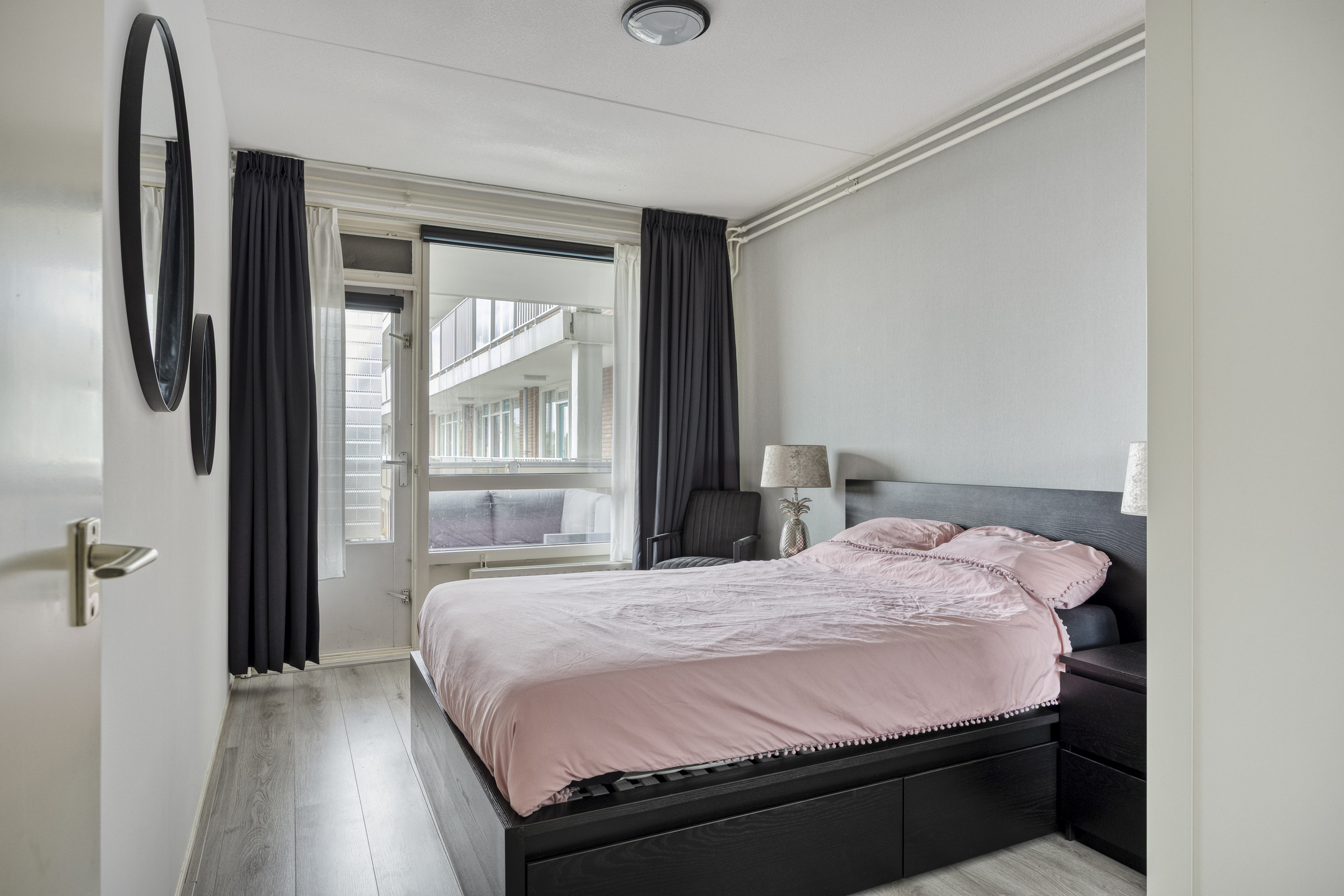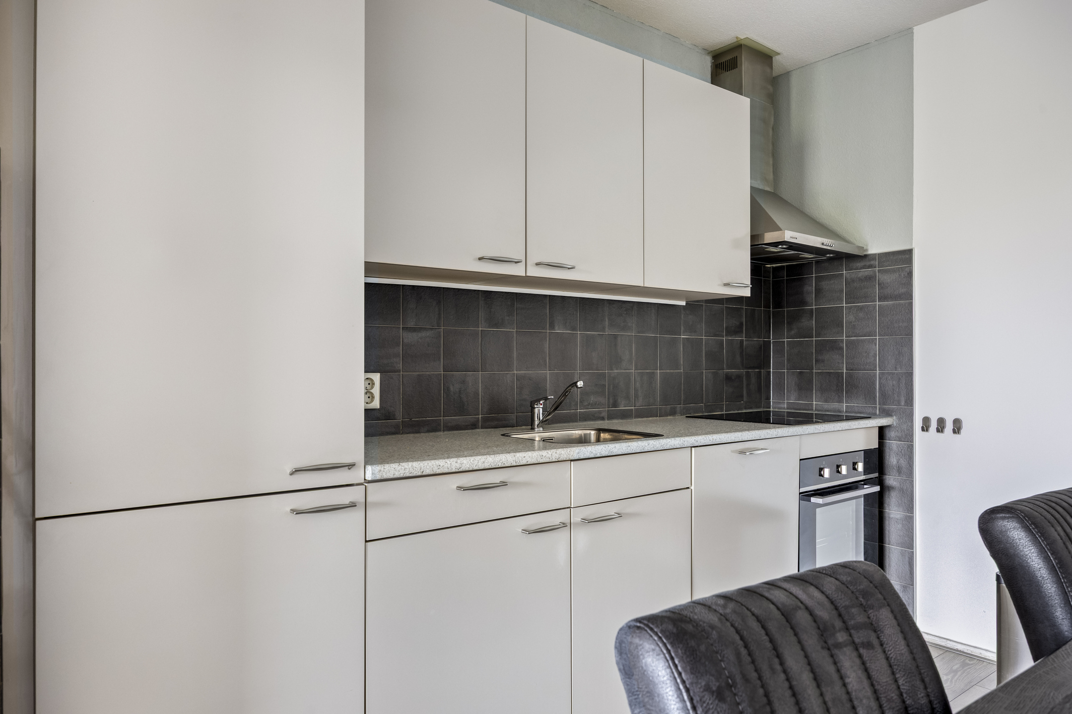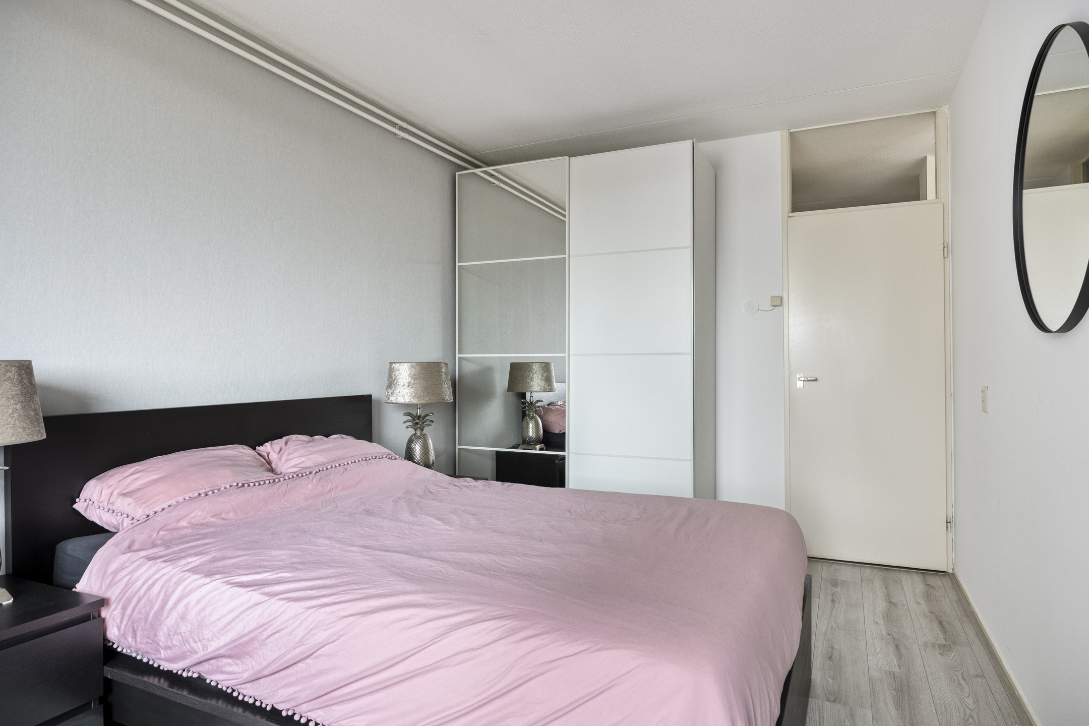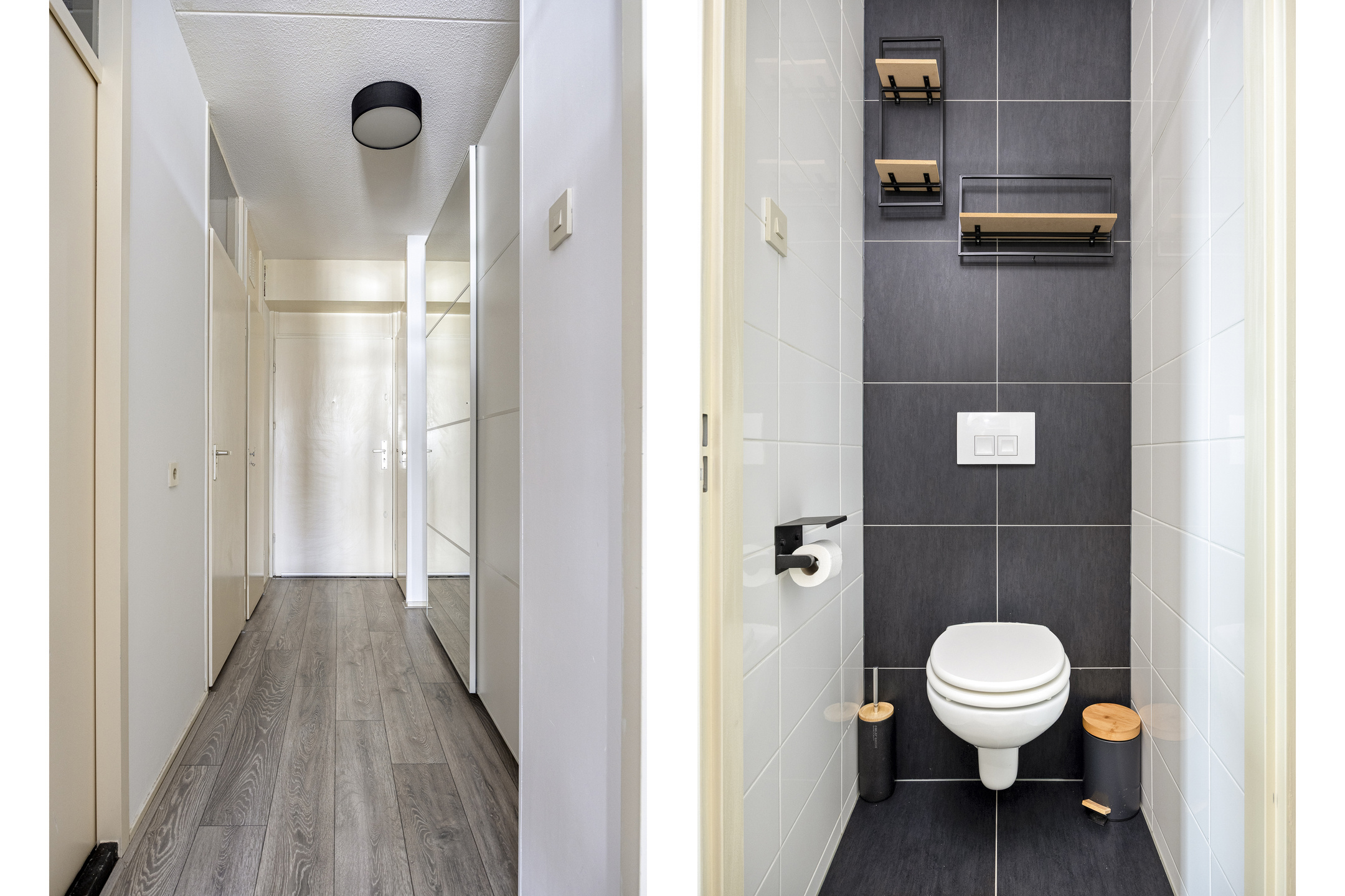Entree, hal met meterkast en toegang tot alle vertrekken. De woonkamer is gelegen aan de achterzijde van de woning en heerlijk licht door de grote raampartij. De ramen zijn voorzien van een elektrisch bedienbaar screen. De open keuken beschikt over diverse inbouwapparatuur zoals een koel-/vries combinatie, 4-zones inductiekookplaat, vaatwasser, afzuigkap en een oven. De slaapkamer van ca. 12 m² is gelegen aan de achterzijde van de woning en geeft toegang tot het balkon. De moderne badkamer is voorzien van een douche en een wastafelmeubel met spiegelkast. Separaat bevindt zich de toiletruimte en een inpandige berging, waarin de opstelplaats van de cv-combiketel, aansluiting voor wasmachine en droger zich bevinden.