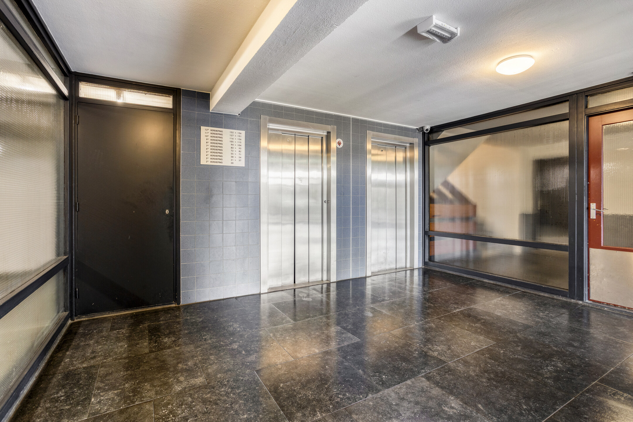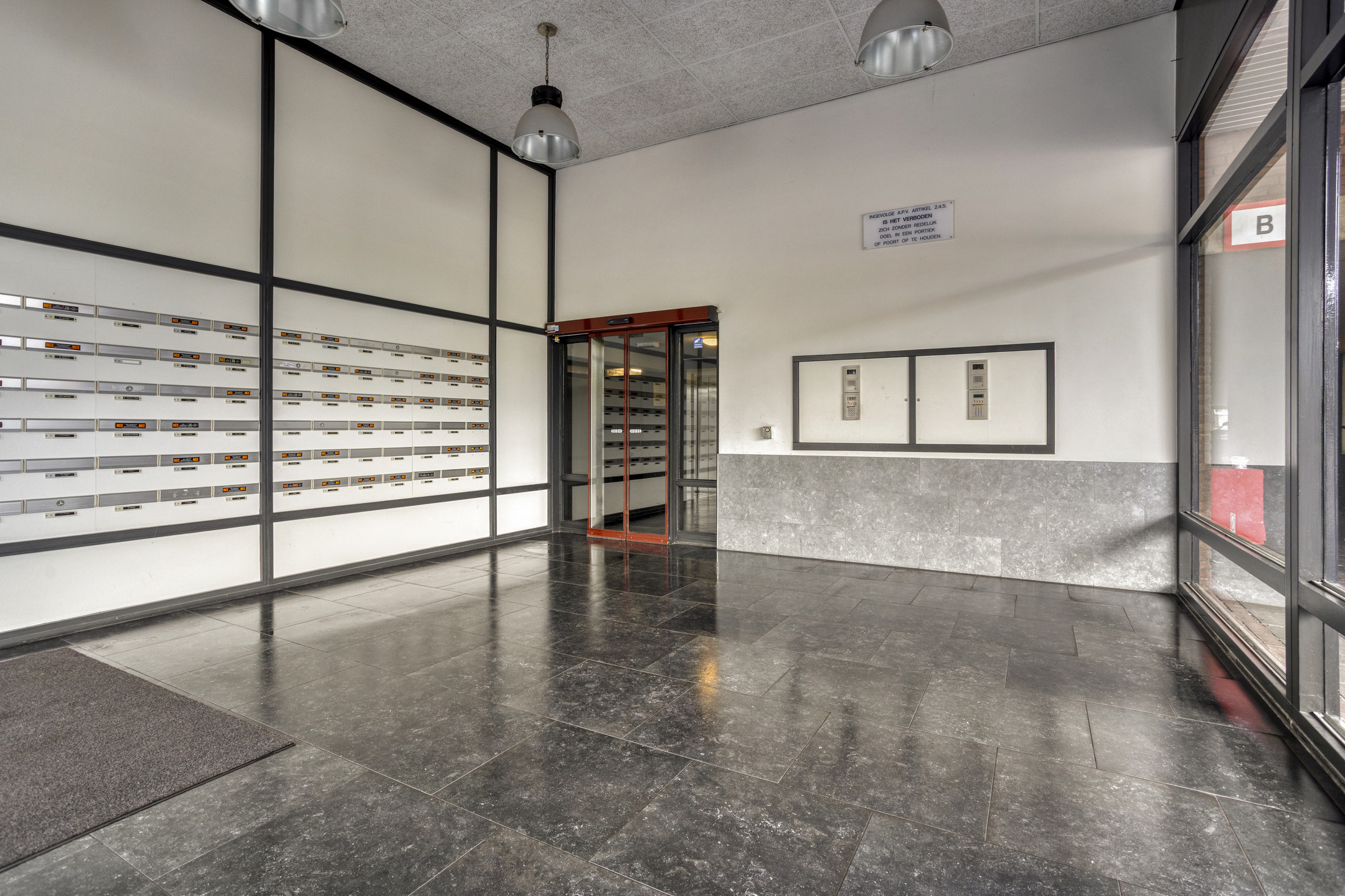 Afgesloten entree met bellentableau, brievenbussen, intercom, toegang tot de lift, trappenhuis en bergingen.