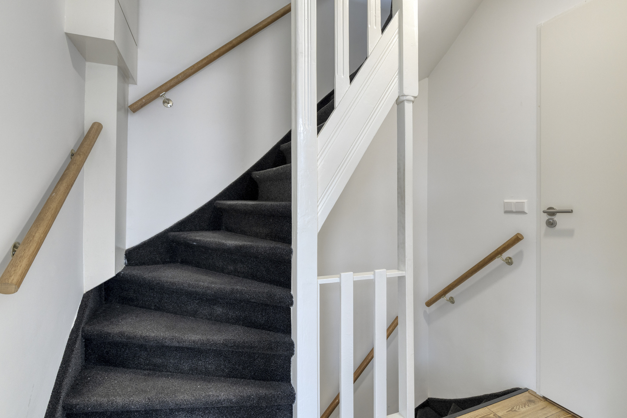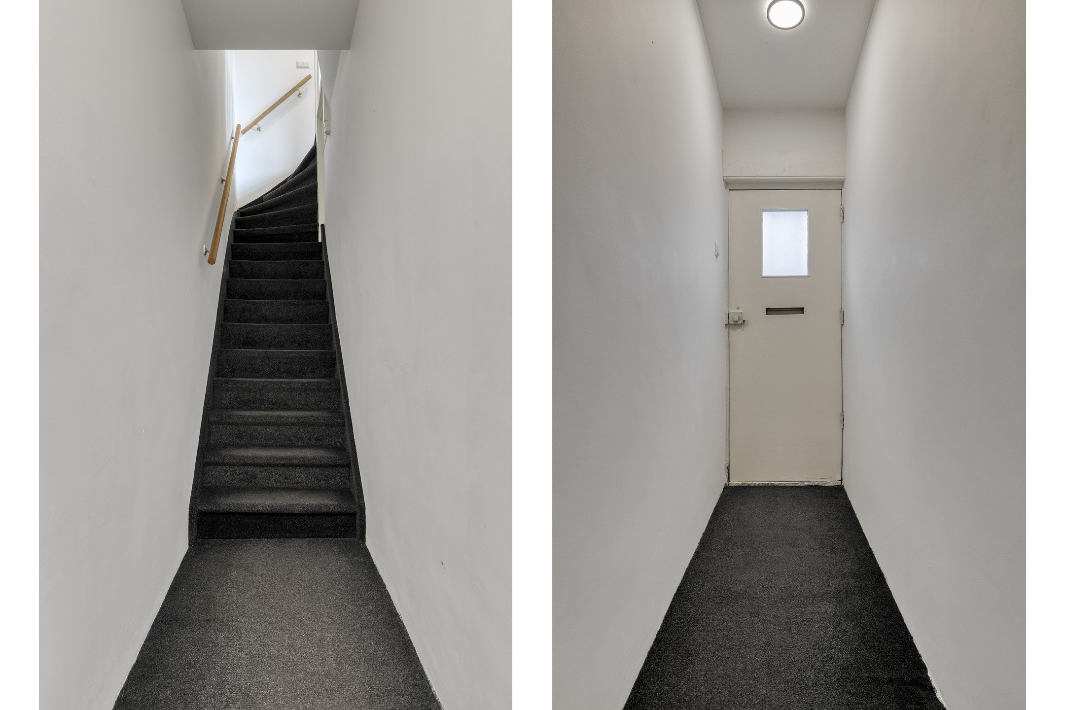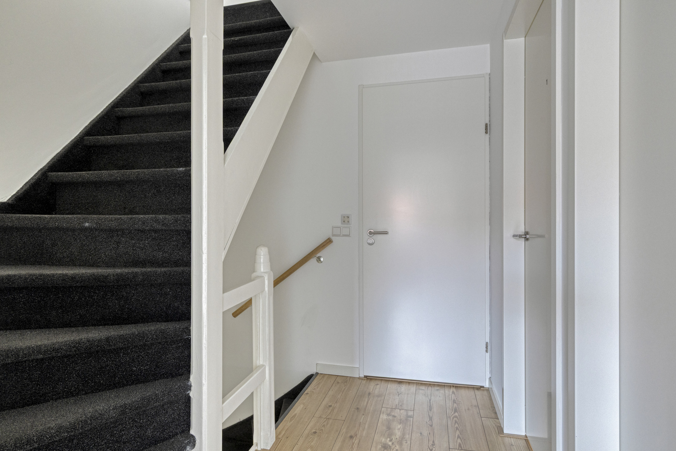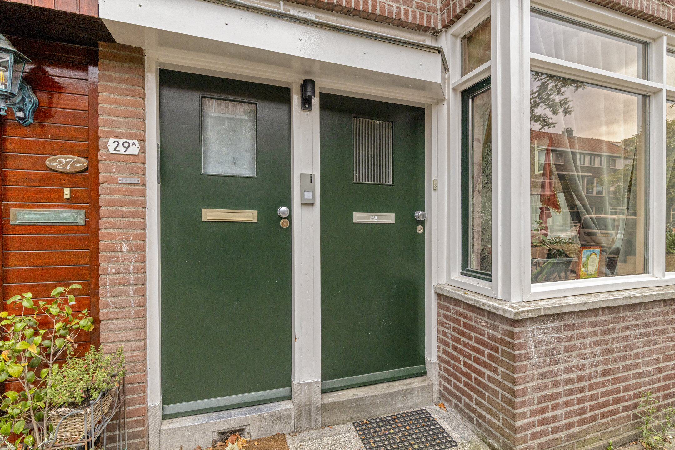 Eigen voordeur met trapopgang, wat direct een gevoel van privacy en zelfstandigheid geeft.