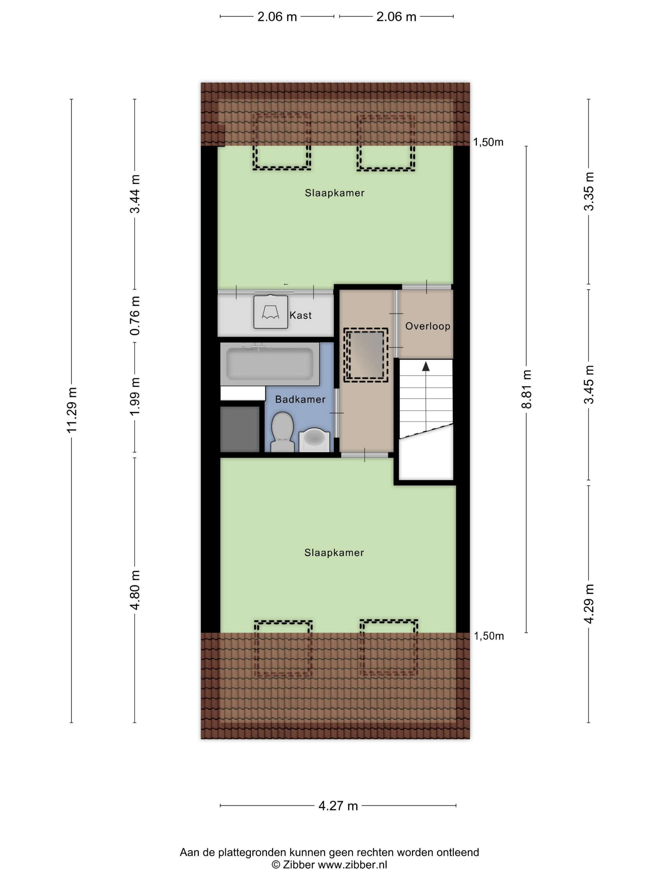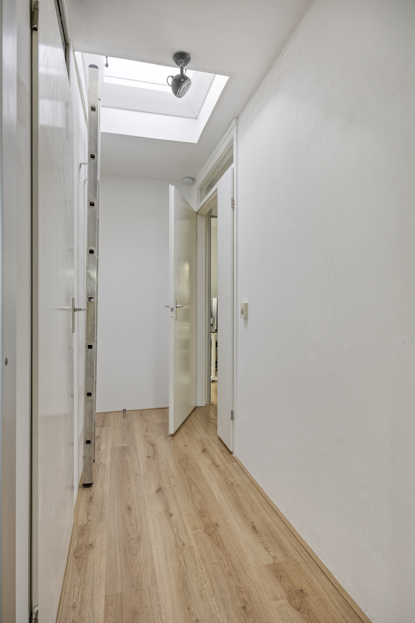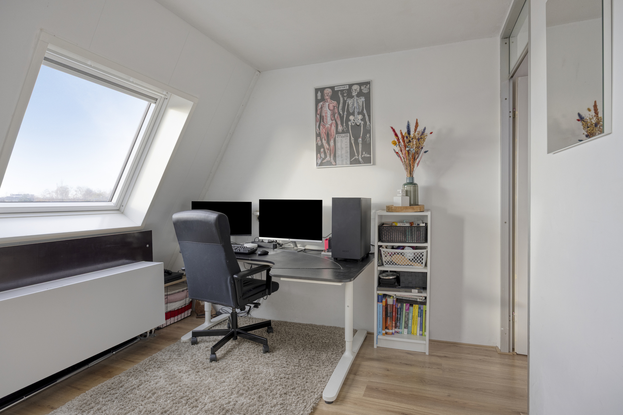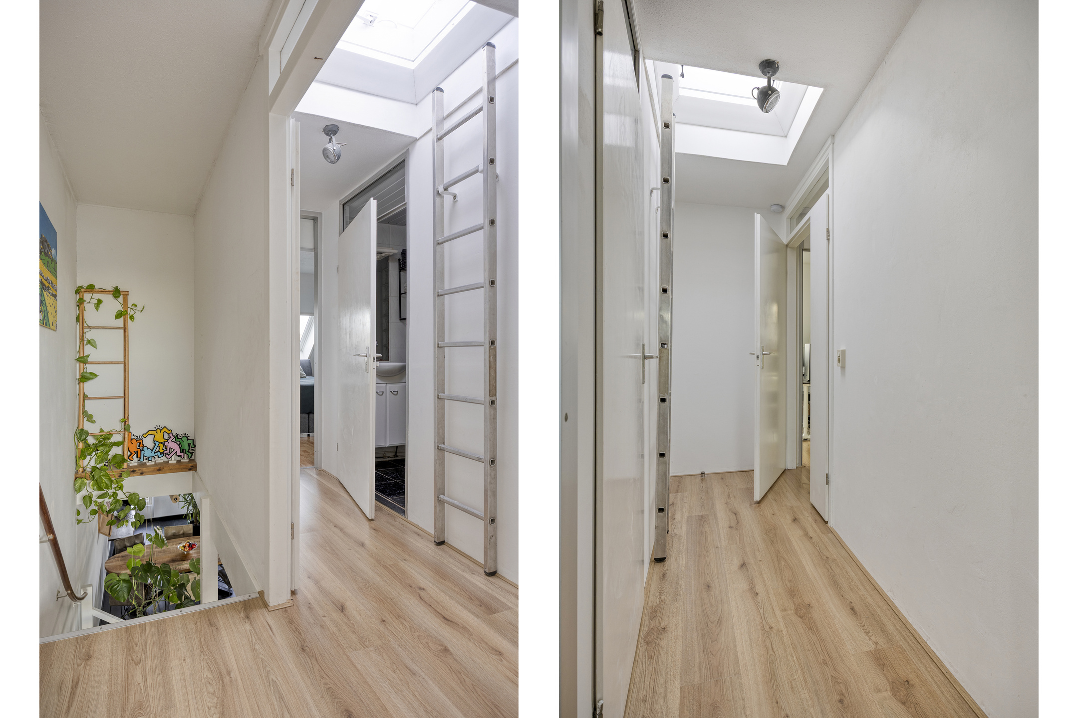 Op de overloop bevindt zich een lichtkoepel die zorgt voor extra daglicht. De ruime slaapkamer aan de achterzijde beschikt over twee kunststof Velux dakramen met driedubbele beglazing en een vaste kast. De badkamer is volledig uitgerust met een ligbad, tweede toilet en wastafelmeubel. Aan de voorzijde bevindt zich de tweede slaapkamer, eveneens voorzien van twee Velux dakramen met driedubbele beglazing, waardoor ook hier veel licht binnenvalt.