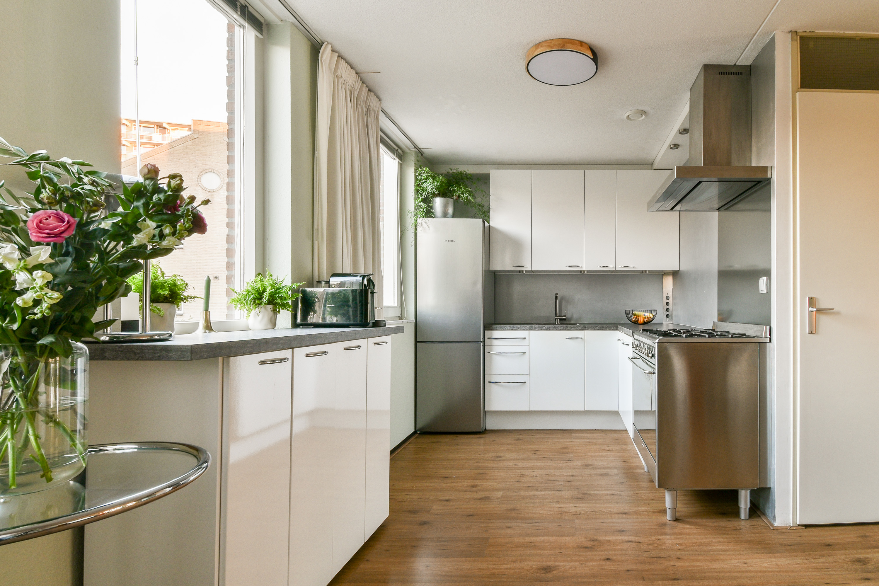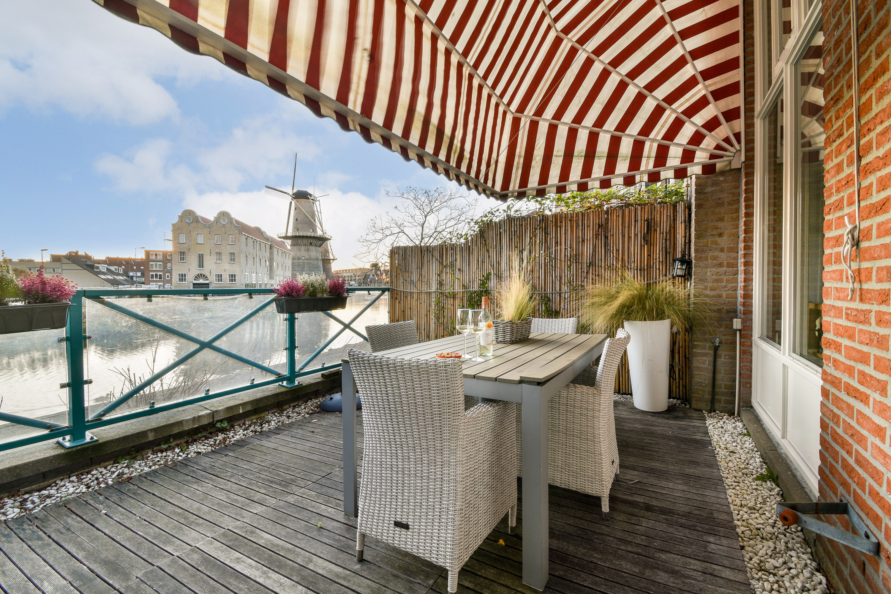Overloop met toegang tot de woonkamer en trapopgang naar de tweede verdieping. Een royale, lichte woonkamer met een indrukwekkende plafondhoogte van maar liefst 3,80 meter. De ruimte is afgewerkt met een laminaatvloer en beschikt over een grote glazen pui, waar altijd veel daglicht door naar binnen valt. Vanuit de woonkamer heb je een prachtig uitzicht over het water van de Noordvest en de karakteristieke historische molens ‘De Palmboom’ en ‘de Kameel’, een plaatje om elke dag van te genieten. Het zonneterras van ca. 18 m² ligt op het zuiden en is voorzien van een zonnescherm. Hier kun je heerlijk relaxen, genieten van het zonnetje en het uitzicht over het water. Via een klein trapje vanuit de woonkamer bereik je de woonkeuken, uitgerust met een koel-/vriescombinatie, vaatwasser, 5-pits gaskookplaat, afzuigkap en een oven. Een heerlijke ruimte waar koken en samen eten echt een plezier is!