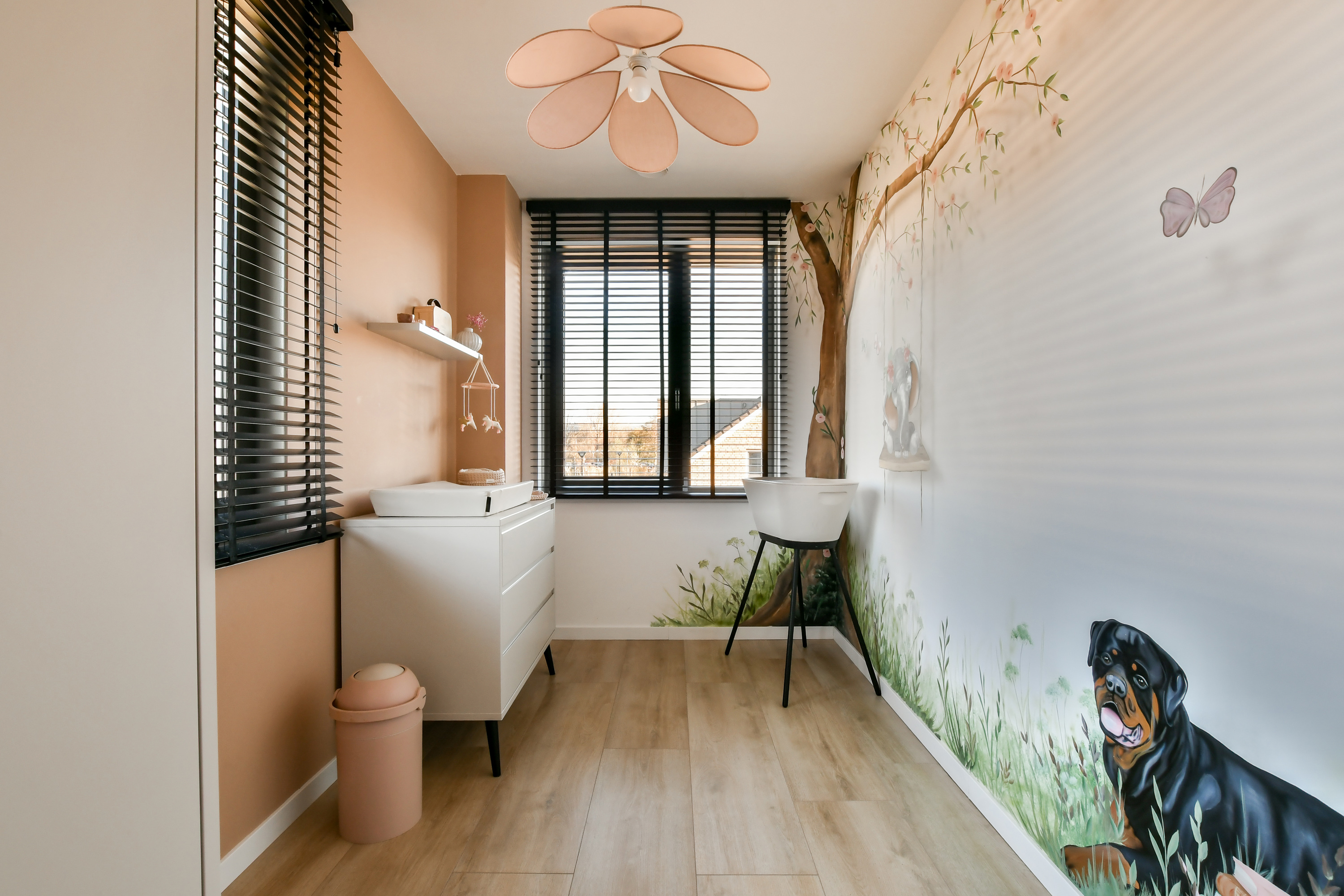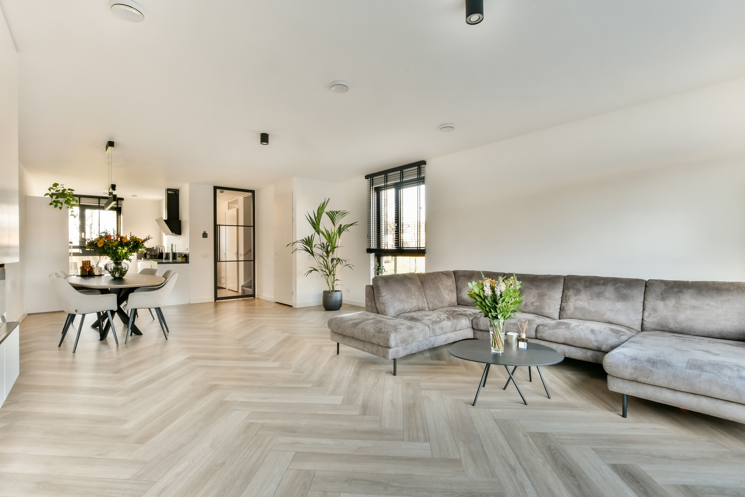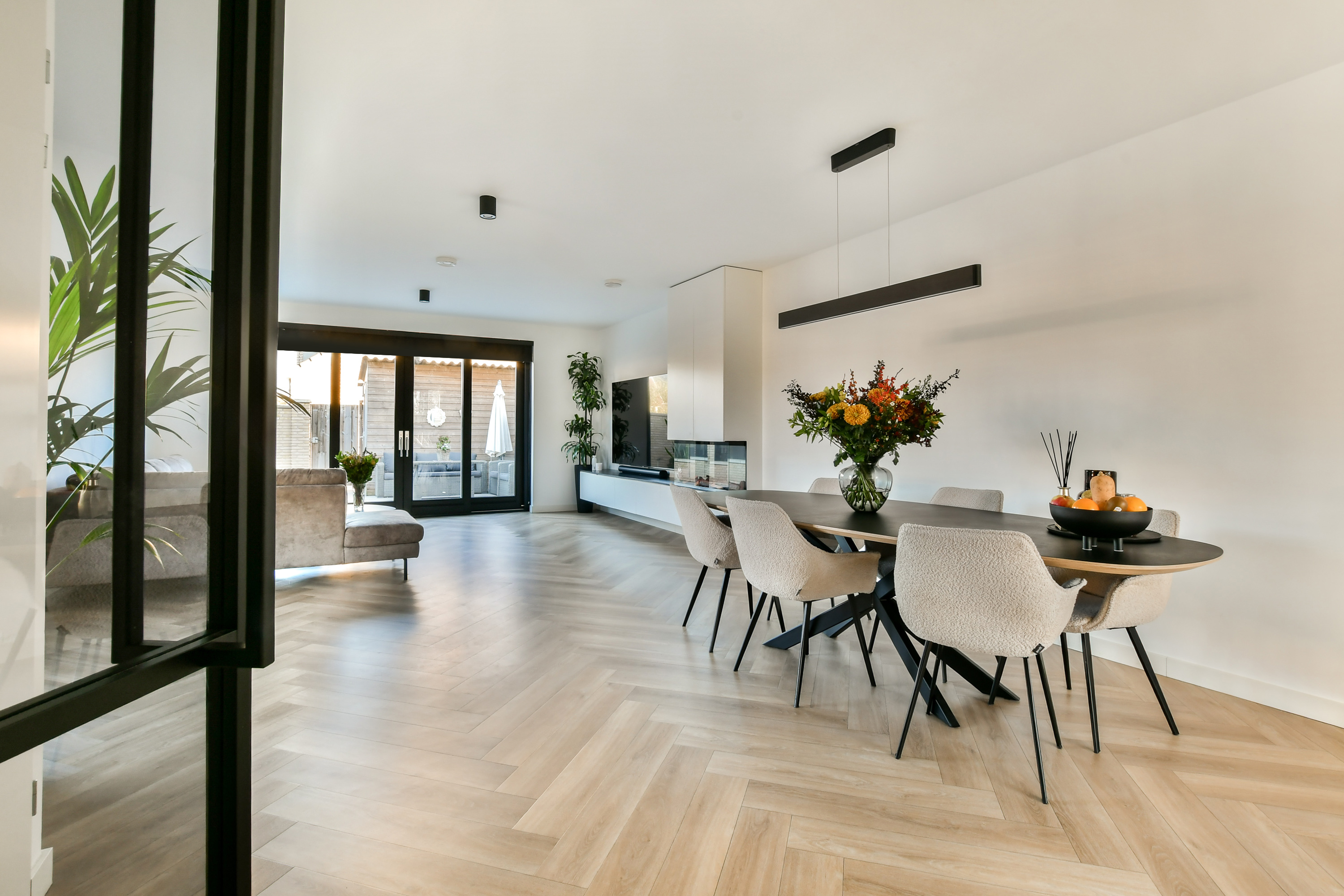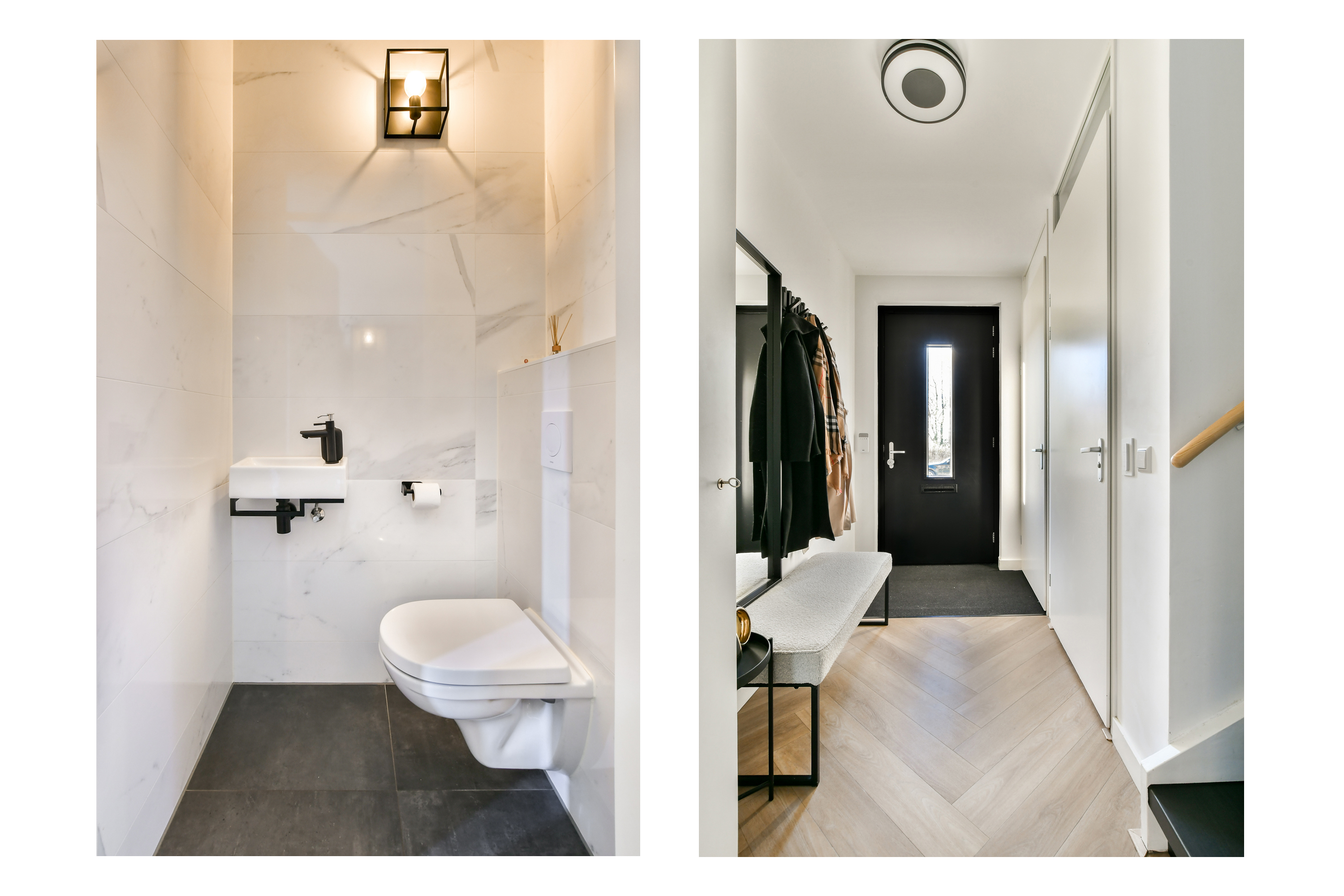 Ruime hal met modern toilet, meterkast, warmtepomp en trapopgang. De uitgebouwde woonkamer is heerlijk licht, dankzij extra raam aan de zijkant en schuifpui naar de tuin. De vloer is voorzien van pvc vloer visgraat motief met vloerverwarming én vloerkoeling – duurzaam en comfortabel.