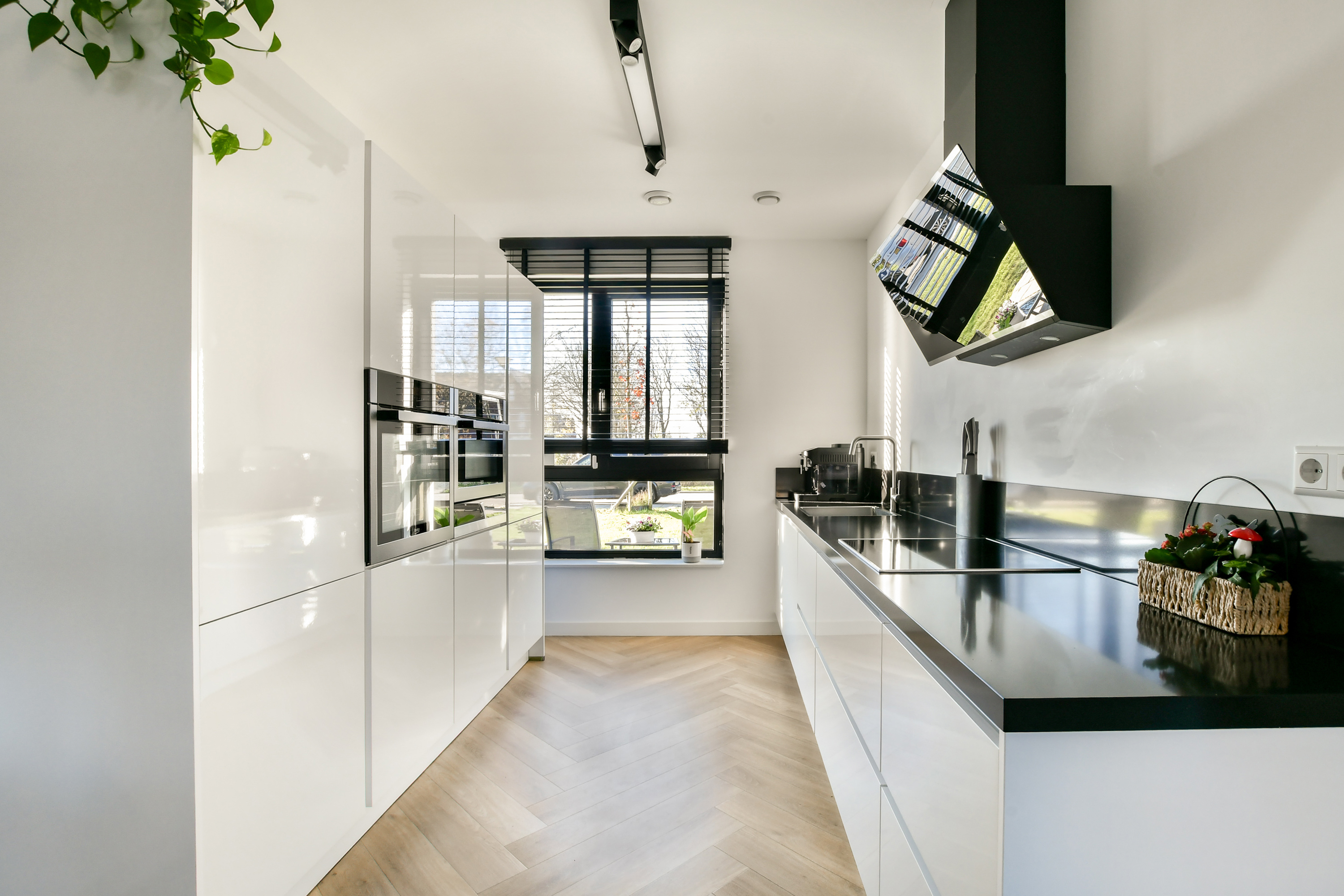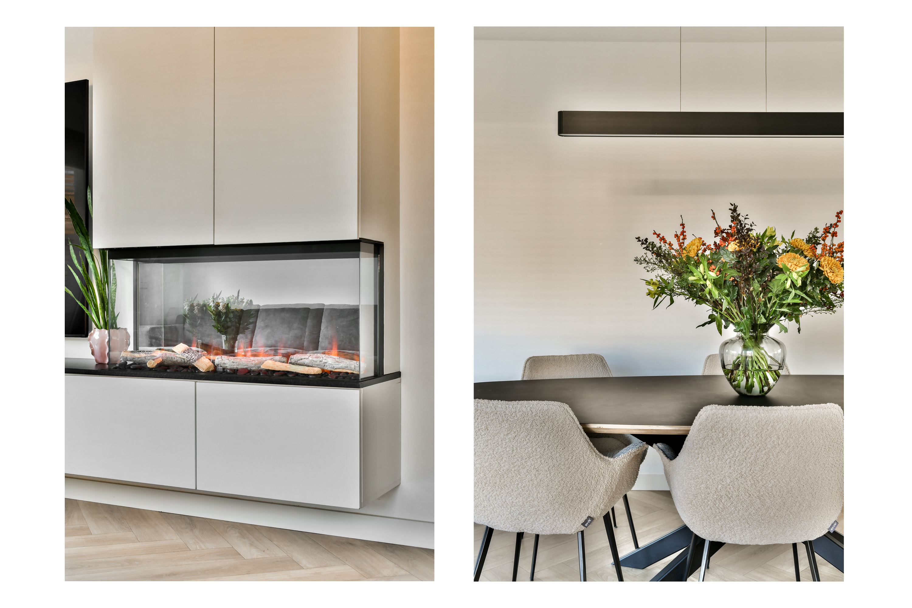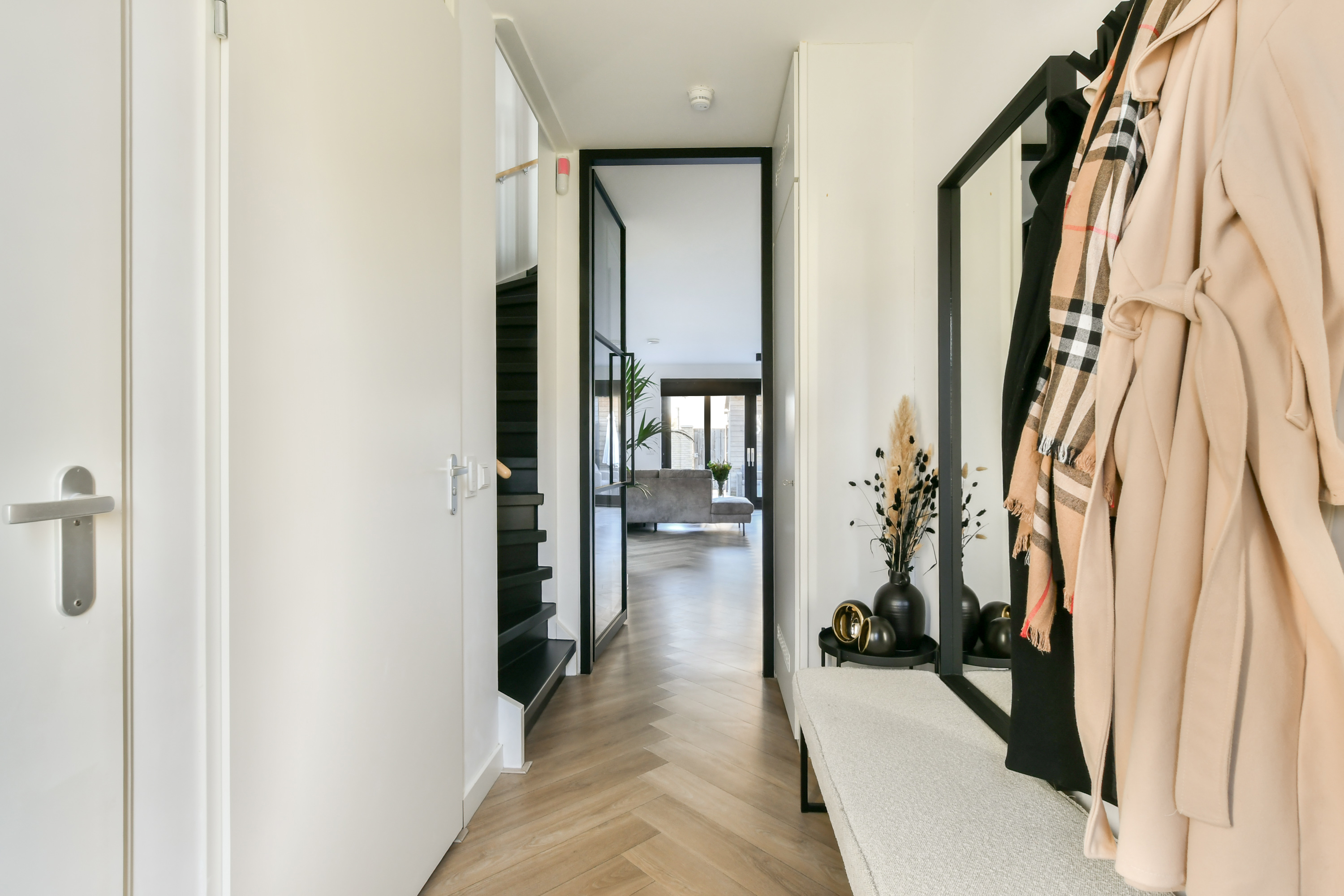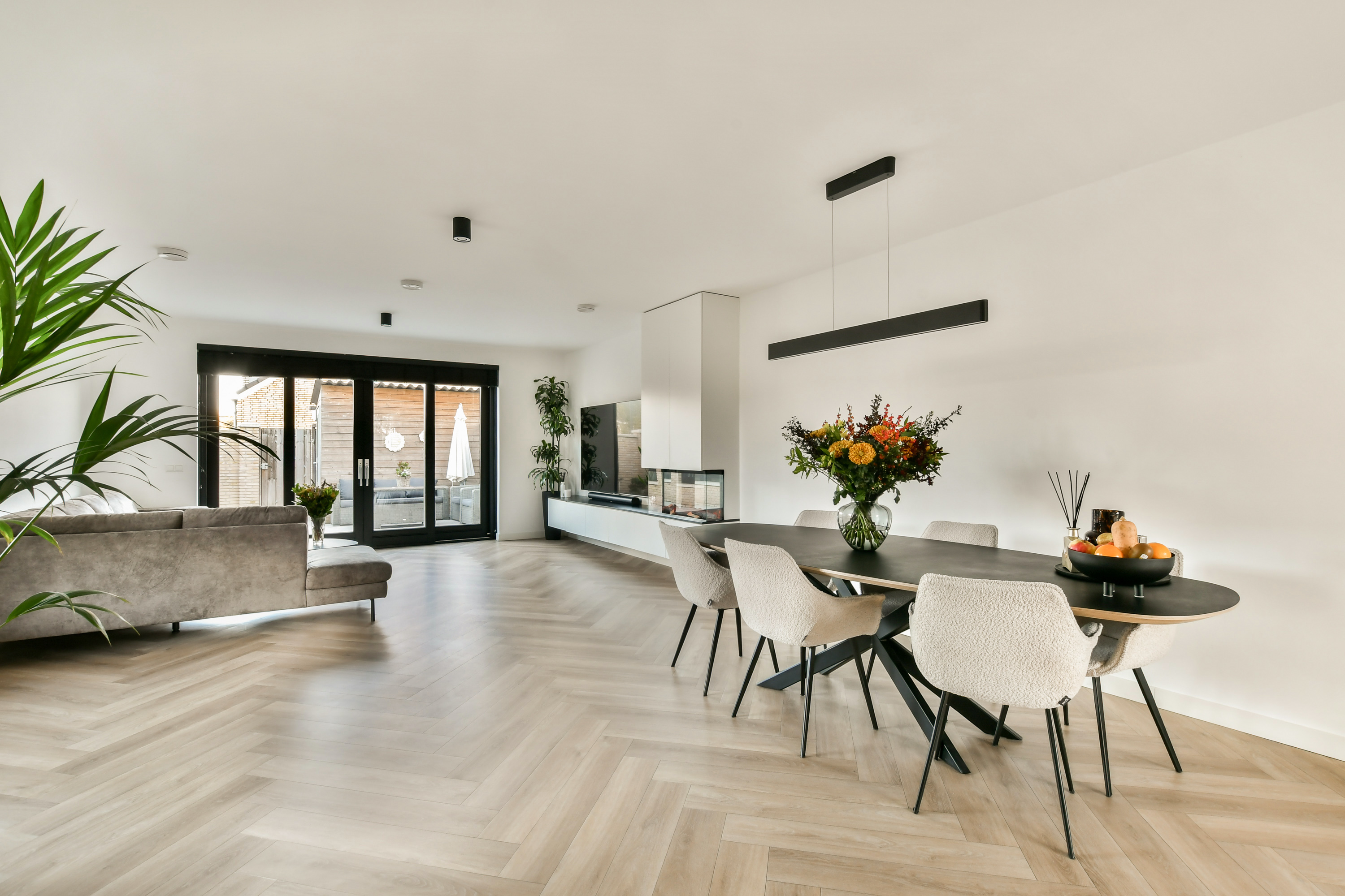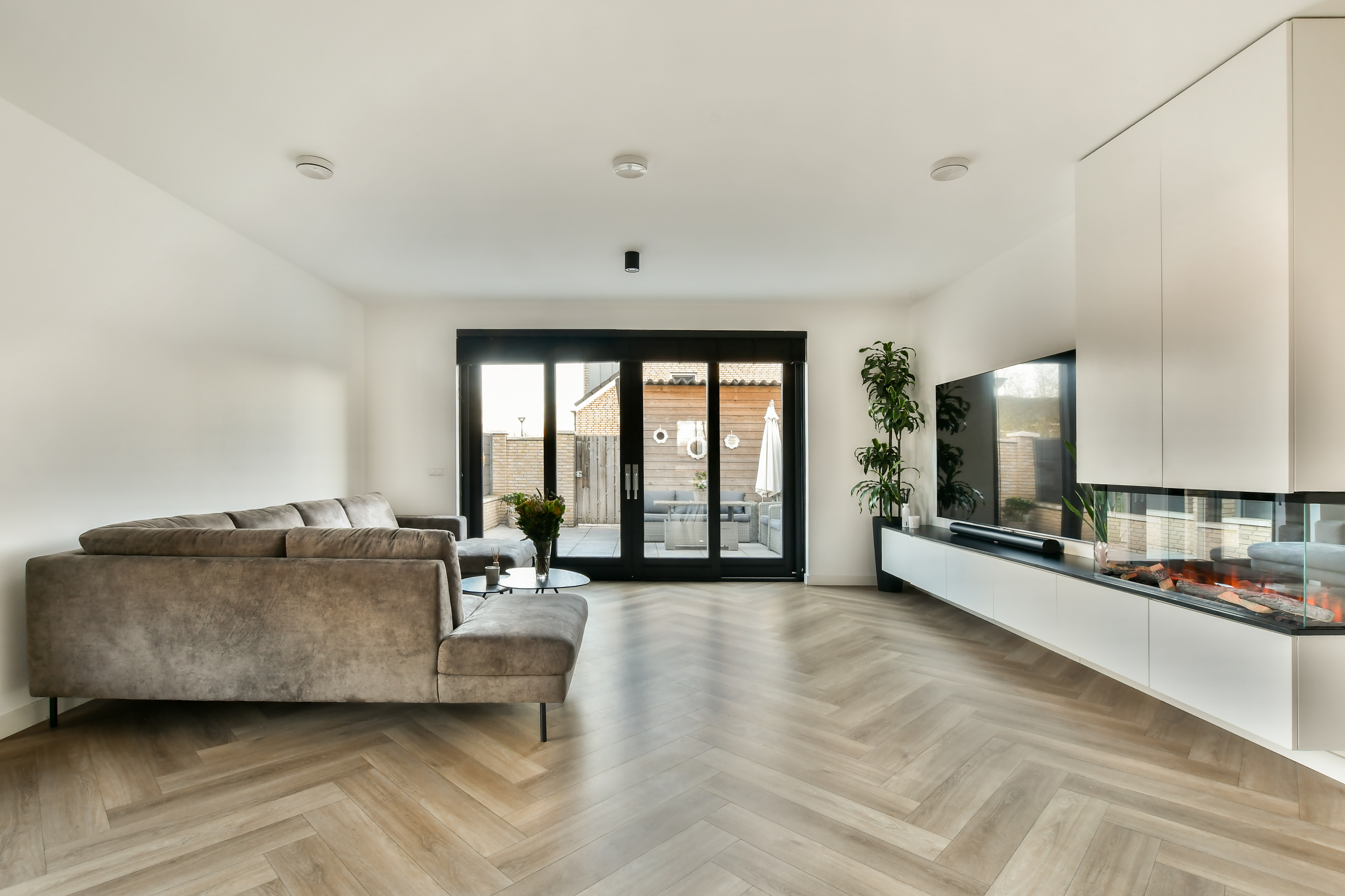 Ruime hal met modern toilet, meterkast, warmtepomp en trapopgang. De uitgebouwde woonkamer is heerlijk licht, dankzij extra raam aan de zijkant en schuifpui naar de tuin. De vloer is voorzien van pvc vloer visgraat motief met vloerverwarming én vloerkoeling – duurzaam en comfortabel.