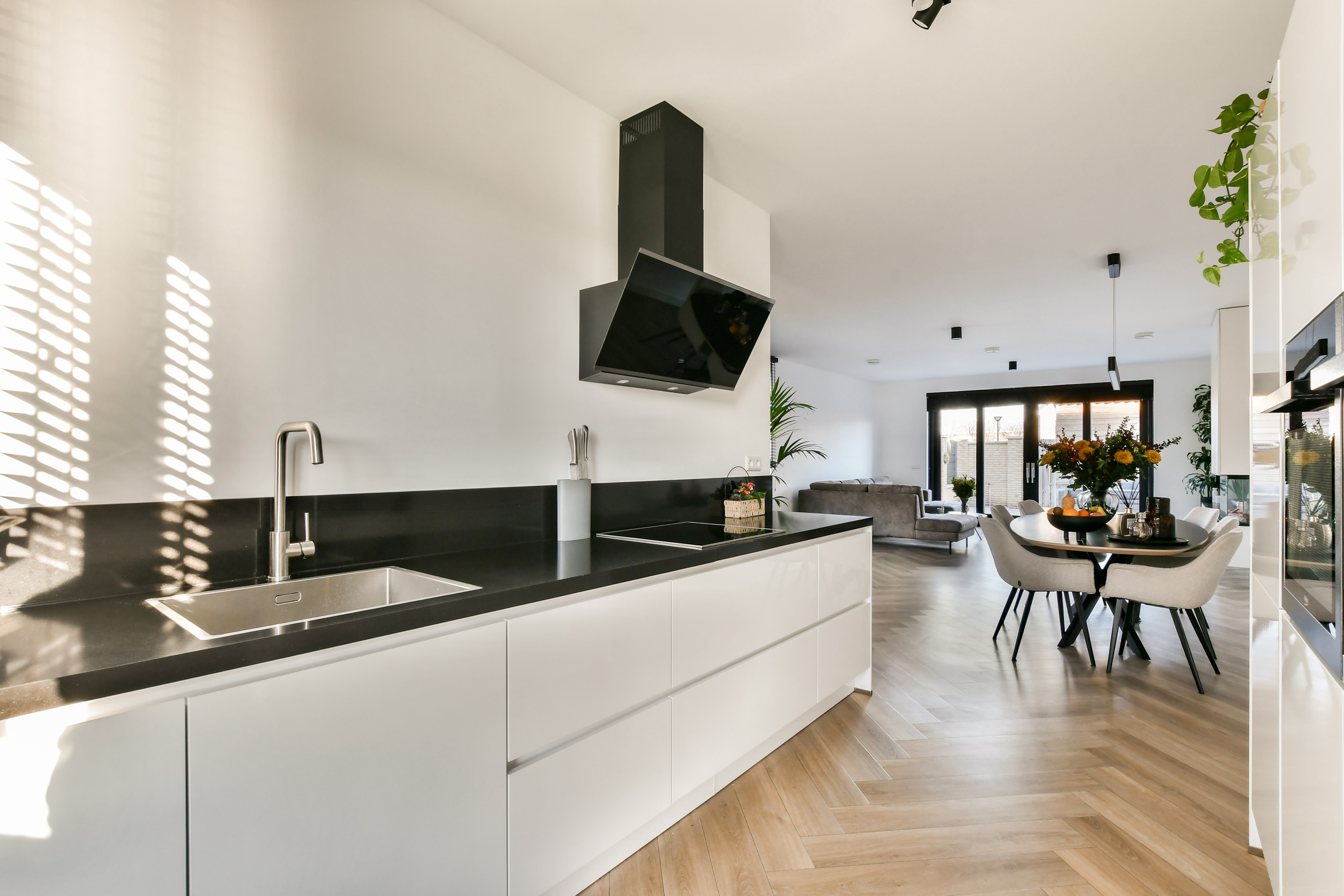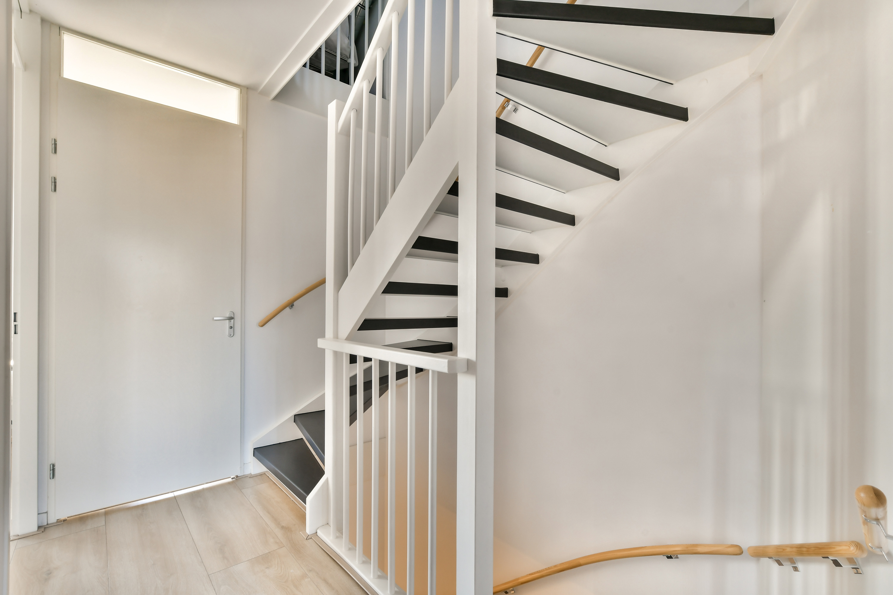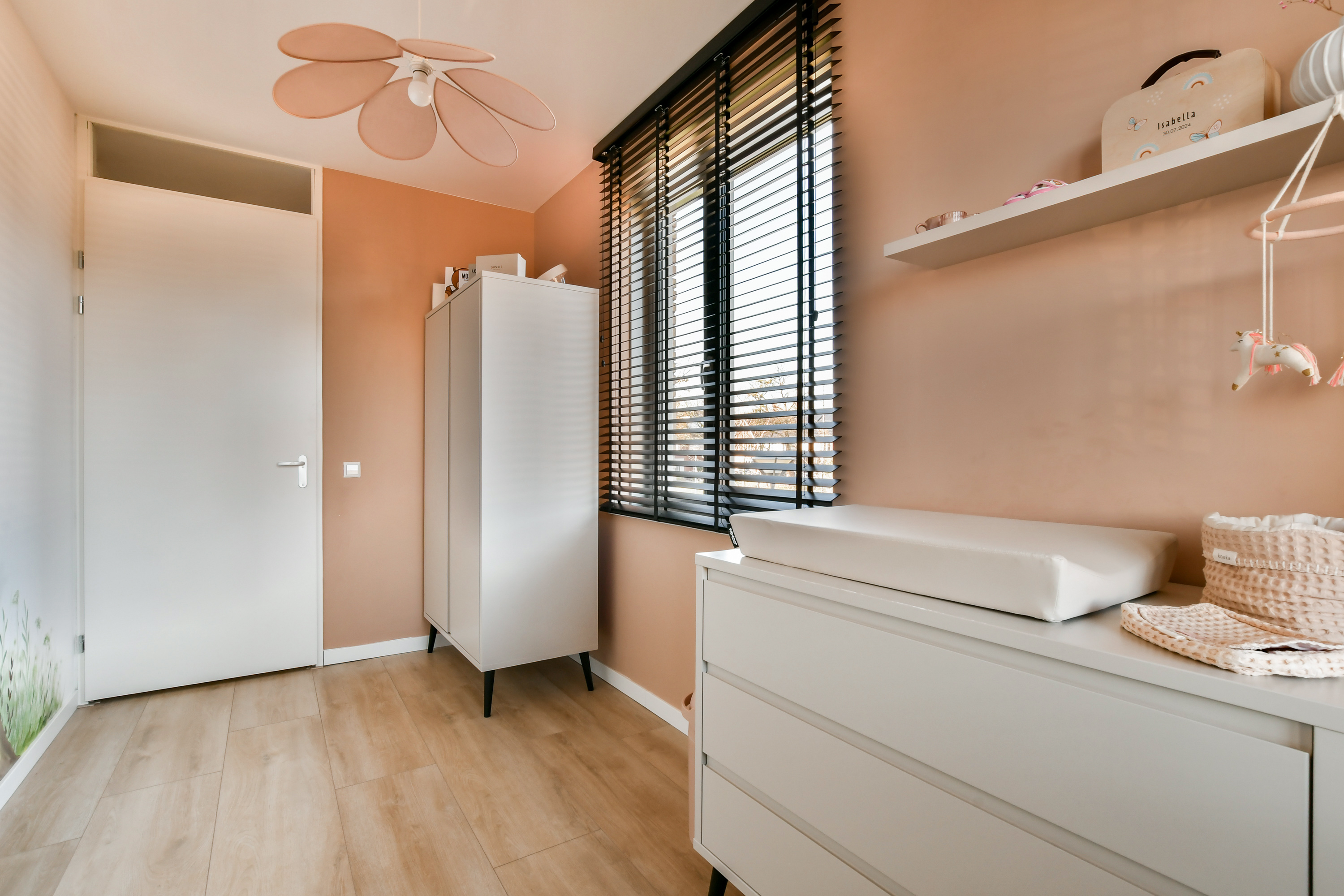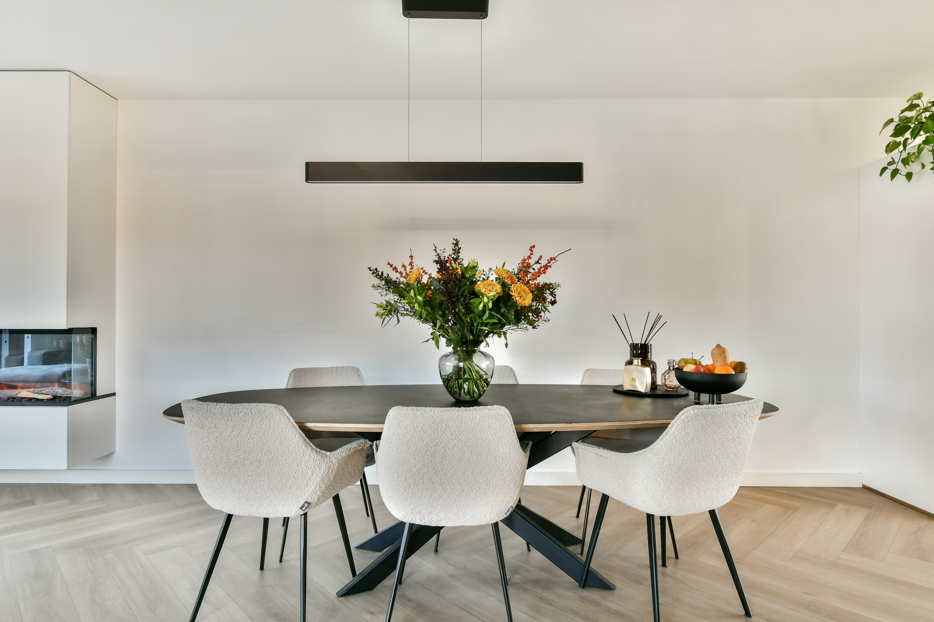 Ruime hal met modern toilet, meterkast, warmtepomp en trapopgang. De uitgebouwde woonkamer is heerlijk licht, dankzij extra raam aan de zijkant en schuifpui naar de tuin. De vloer is voorzien van pvc vloer visgraat motief met vloerverwarming én vloerkoeling – duurzaam en comfortabel.