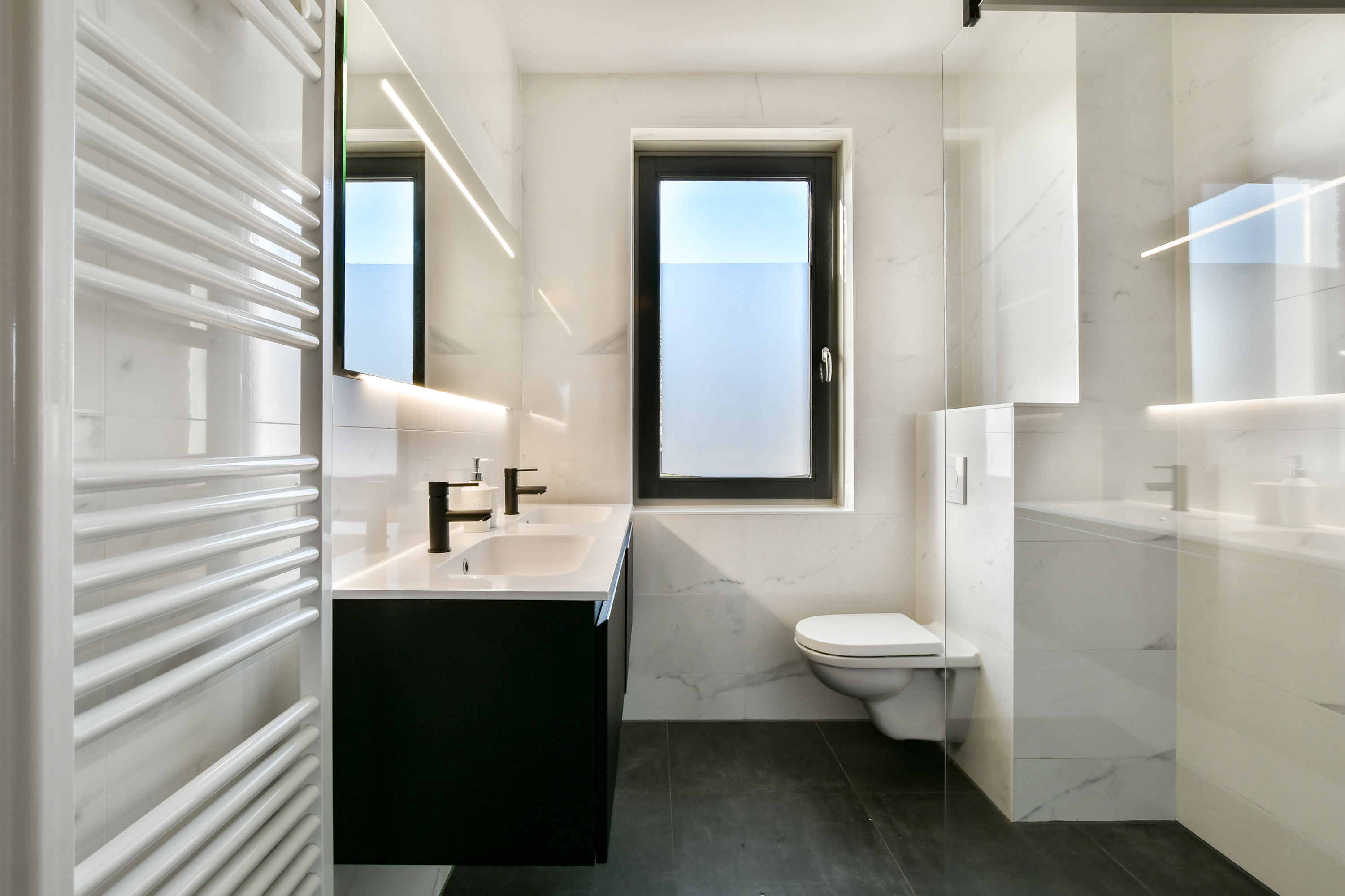 De overloop geeft toegang tot drie comfortabele slaapkamers en een luxe badkamer. Deze is modern ingericht met een inloopdouche, wastafelmeubel, tweede toilet en voorzien van vloerverwarming. Ook op deze verdieping is het comfort compleet met vloerverwarming en -koeling.