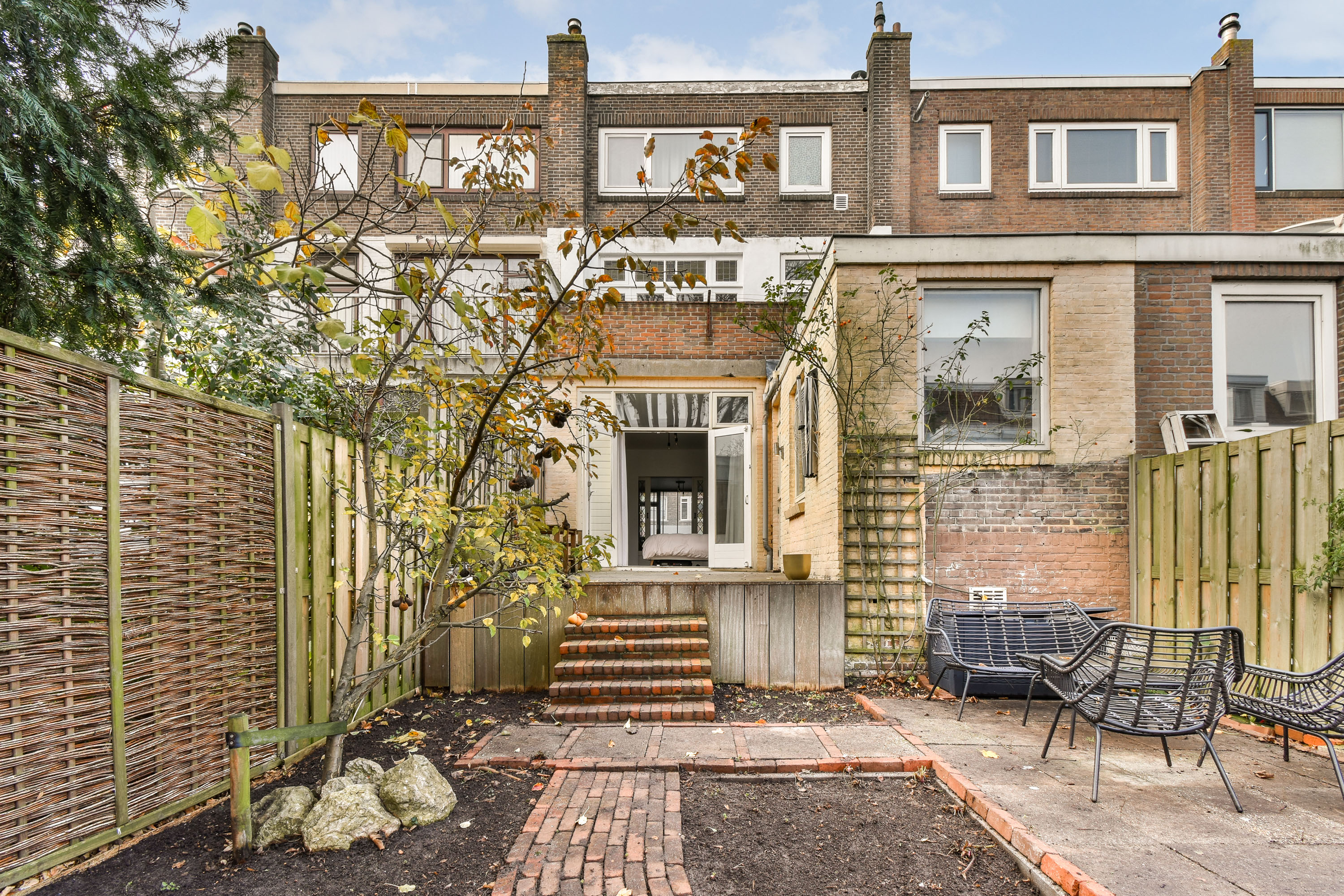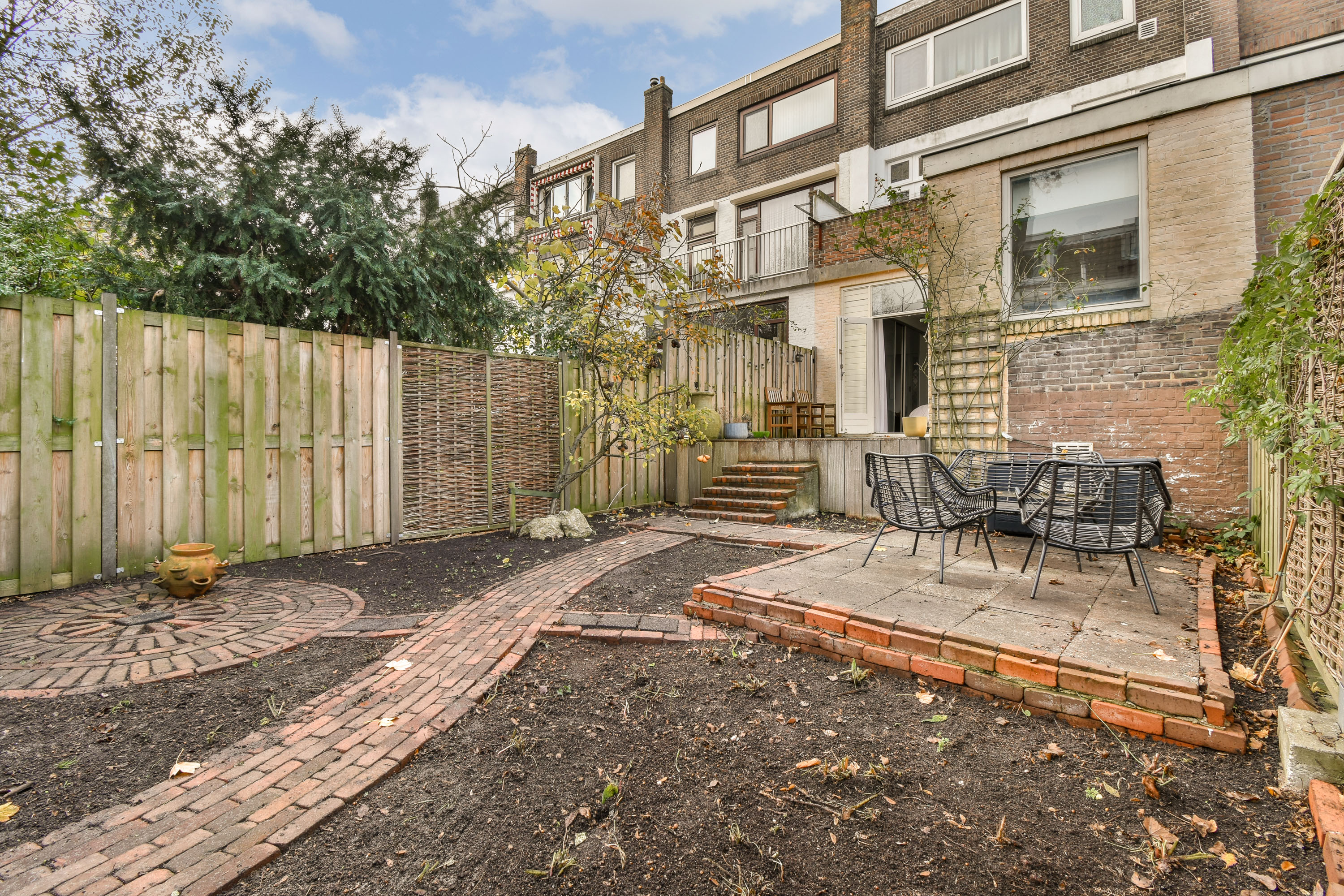 De fraai aangelegde achtertuin, ca. 7,5 meter diep en 5,7 meter breed, is een heerlijke plek om van het buitenleven te genieten. De tuin is voorzien van een hardhouten vlonderterras, diverse beplanting en een tweede terras achterin voor zowel zon als schaduw op elk moment van de dag. Dankzij de praktische achterom is de tuin niet alleen sfeervol, maar ook bijzonder functioneel.