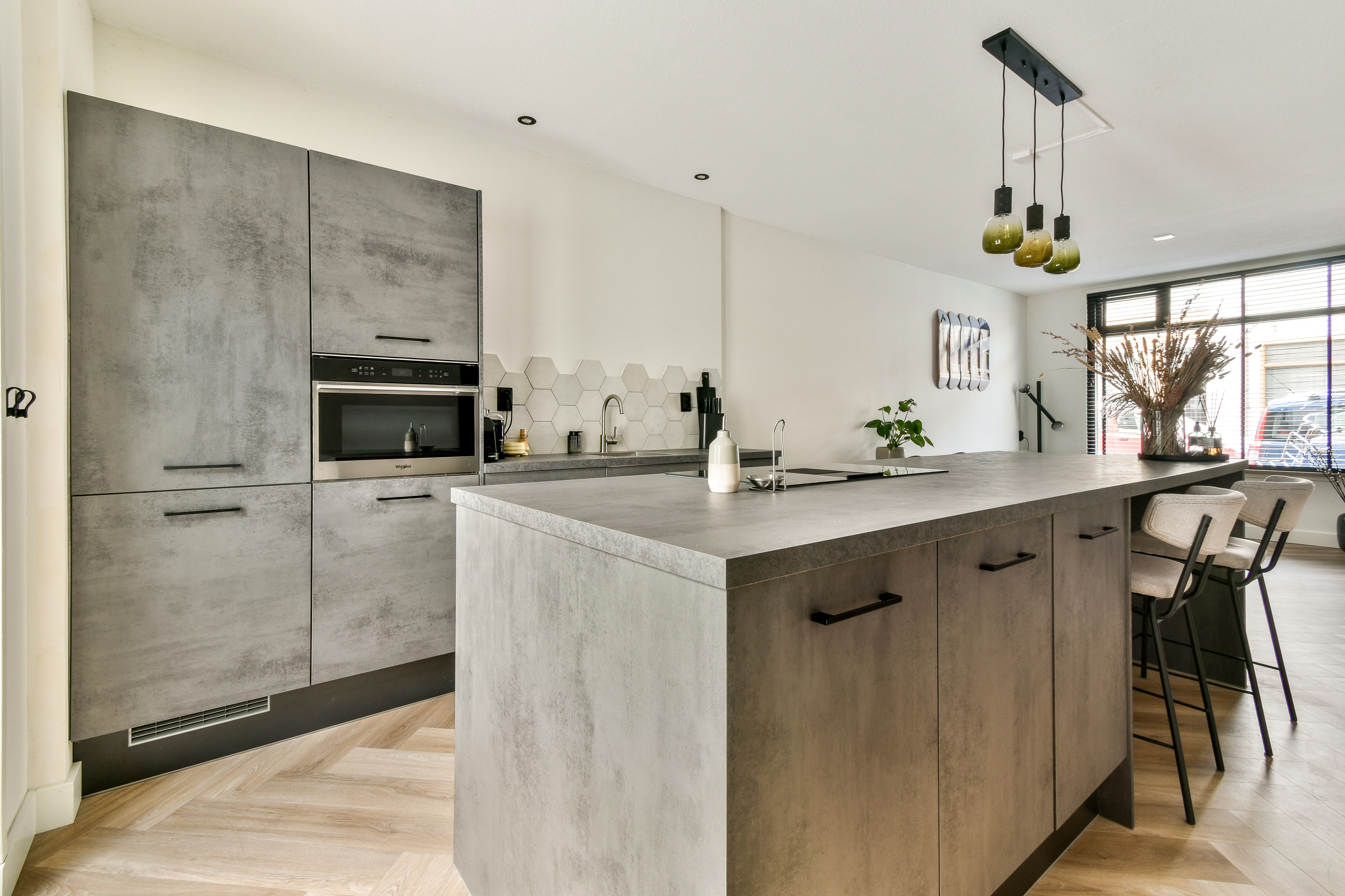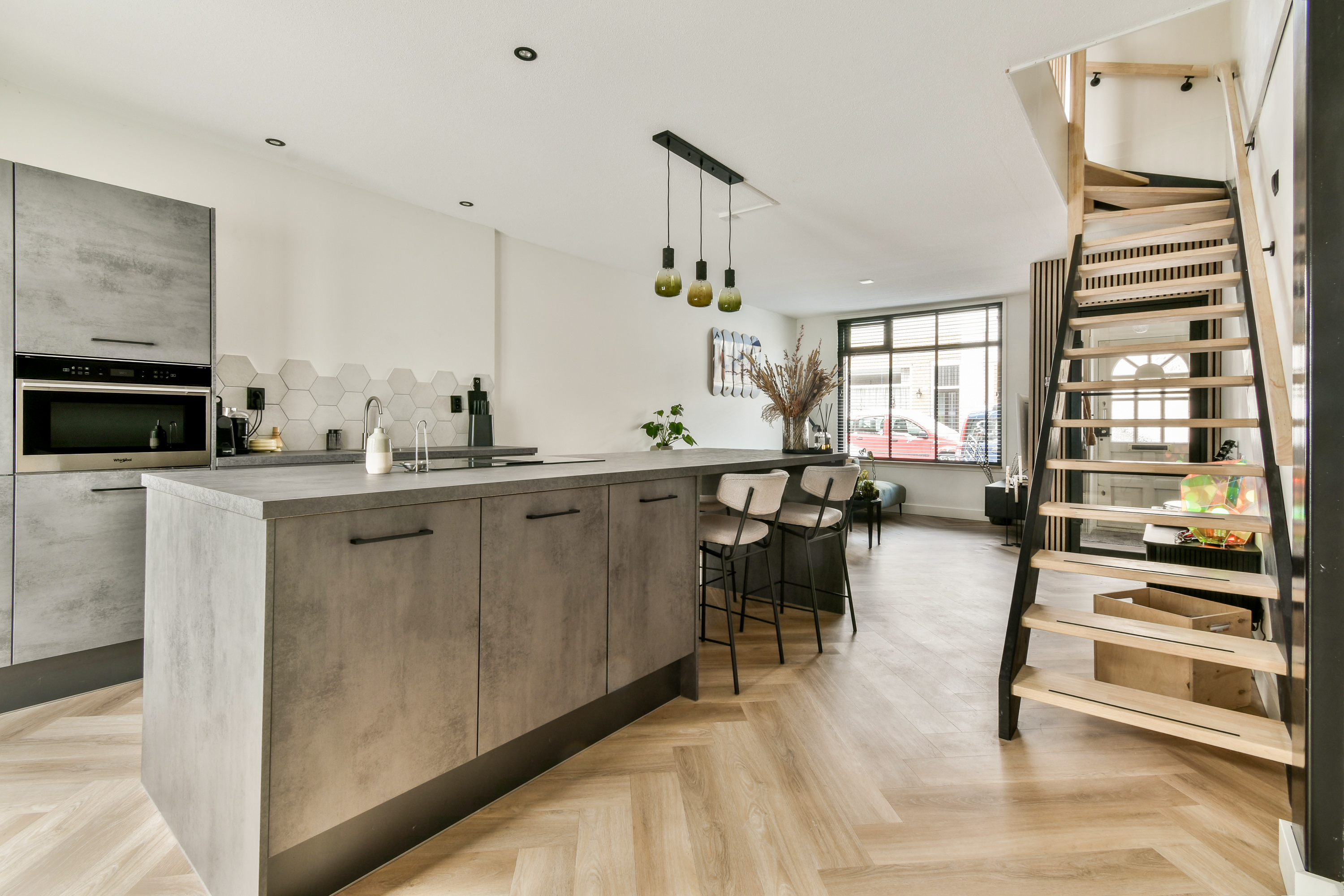 Geheel voorzien van een fraaie pvc visgraatvloer met vloerverwarming. Entree/hal met meterkast (eigen hoofdaansluiting, uniek in deze omgeving) en nieuwe groepenkast. De woonkamer is bereikbaar via een stijlvolle industriële houten deur en beschikt over een nieuwe hardhouten trap naar de eerste verdieping en een open keuken. De moderne keuken (2021) is voorzien van hoogwaardige Whirlpool inbouwapparatuur, waaronder een inductiekookplaat met geïntegreerde afzuiging, oven met magnetronfunctie, vaatwasser en koel-/vriescombinatie. Via openslaande deuren is er toegang tot de zonnige achtertuin op het zuidoosten, met achterom, buitenkraan en een aangebouwde stenen berging met elektra. Daarnaast is er een inpandige berging aanwezig. Het toilet is fraai afgewerkt met een Sanibroyeur en een fonteintje.