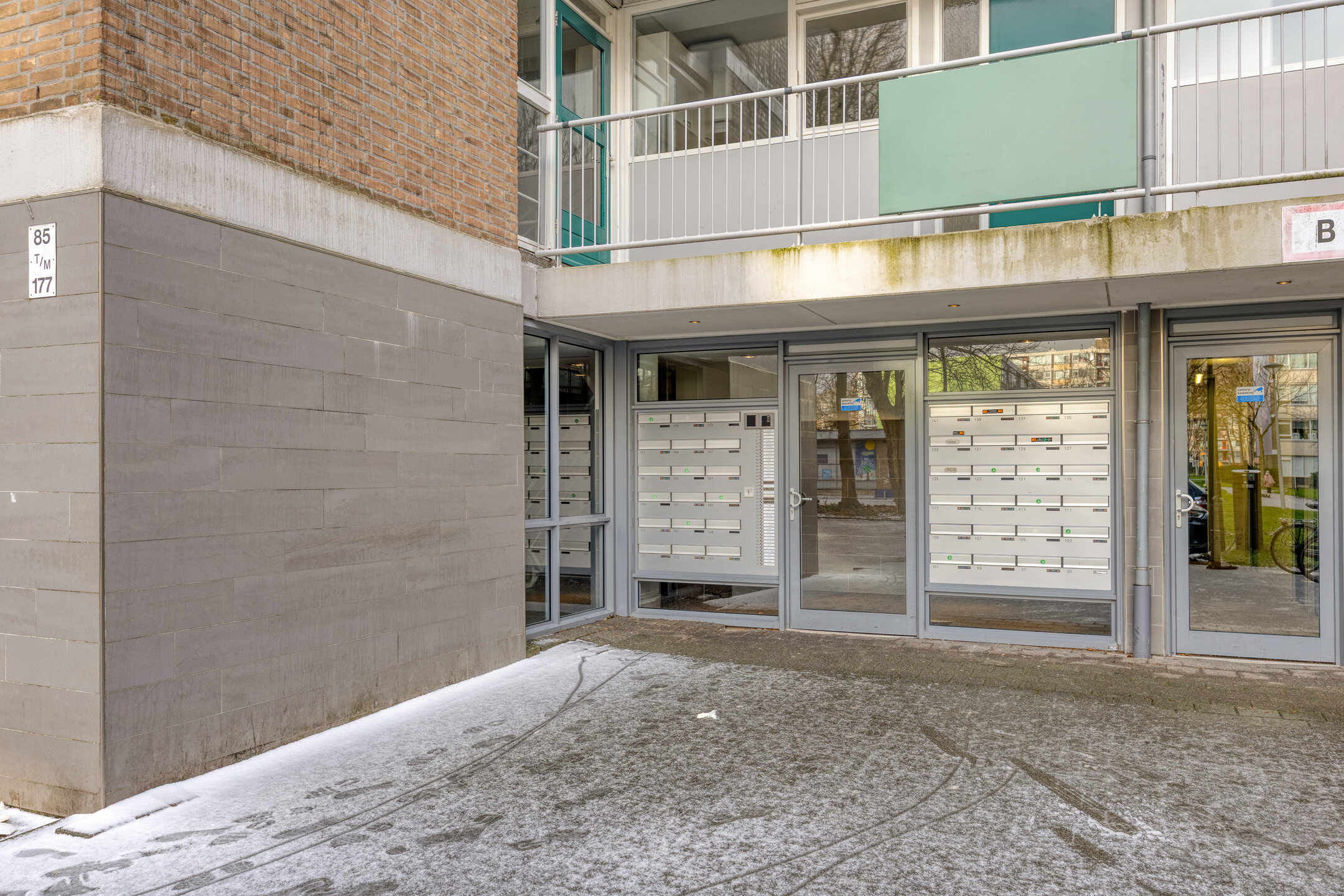 Afgesloten centrale entree met bellentableau en brievenbussen, lift en toegang tot de bergingen.