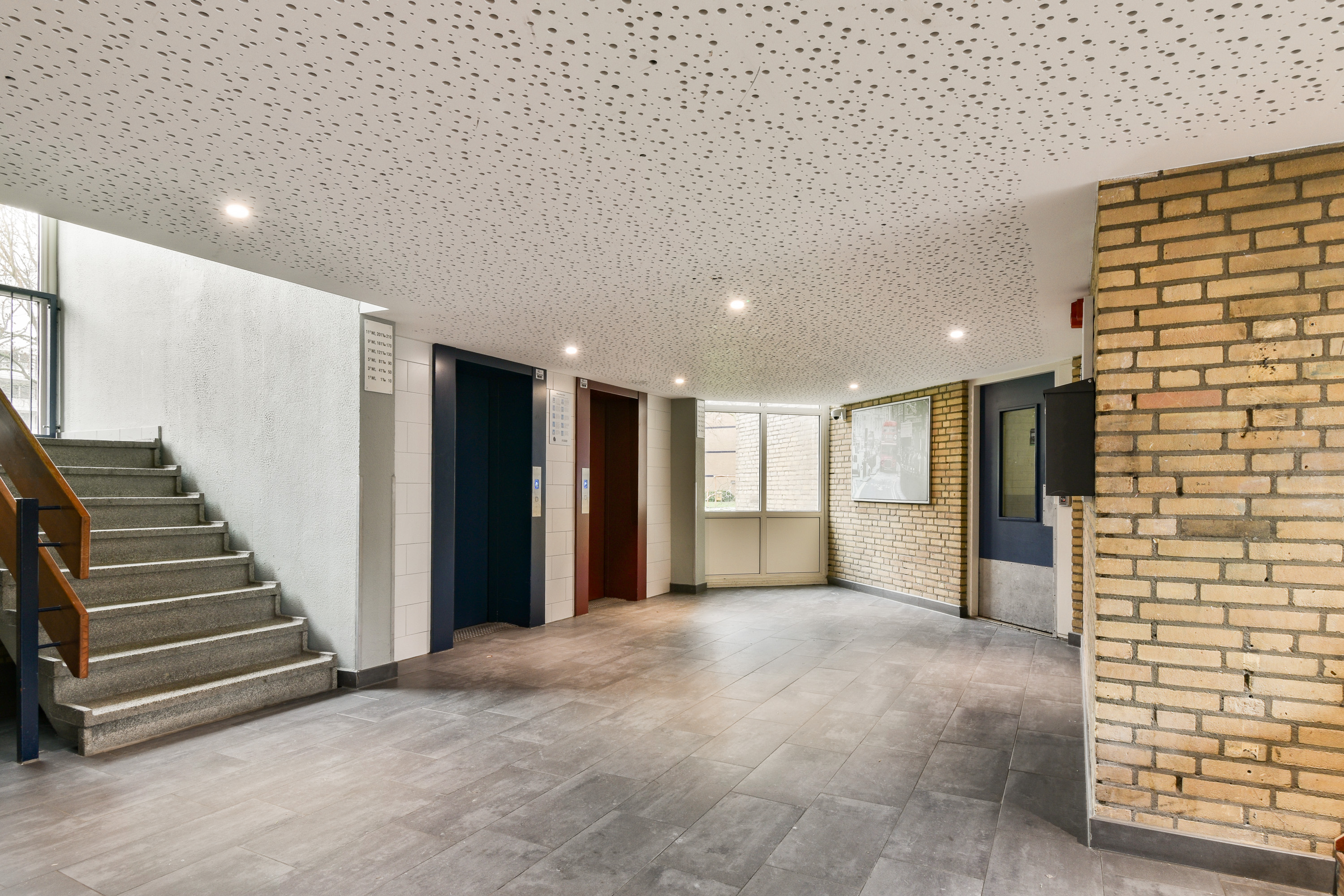 Centrale entree met bellentableau, brievenbussen, toegang tot de ondergelegen bergingen en het trappenhuis met liftinstallatie.