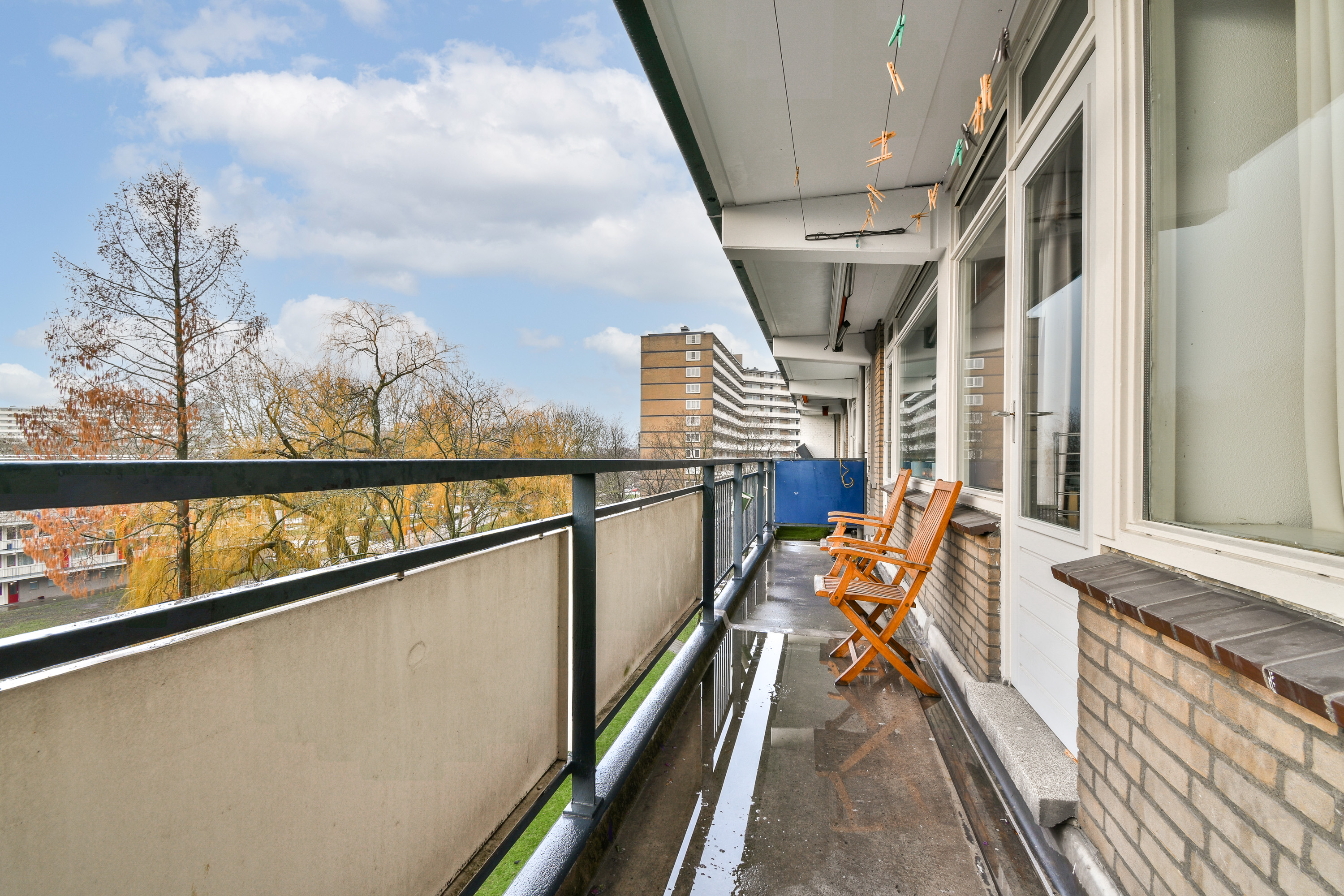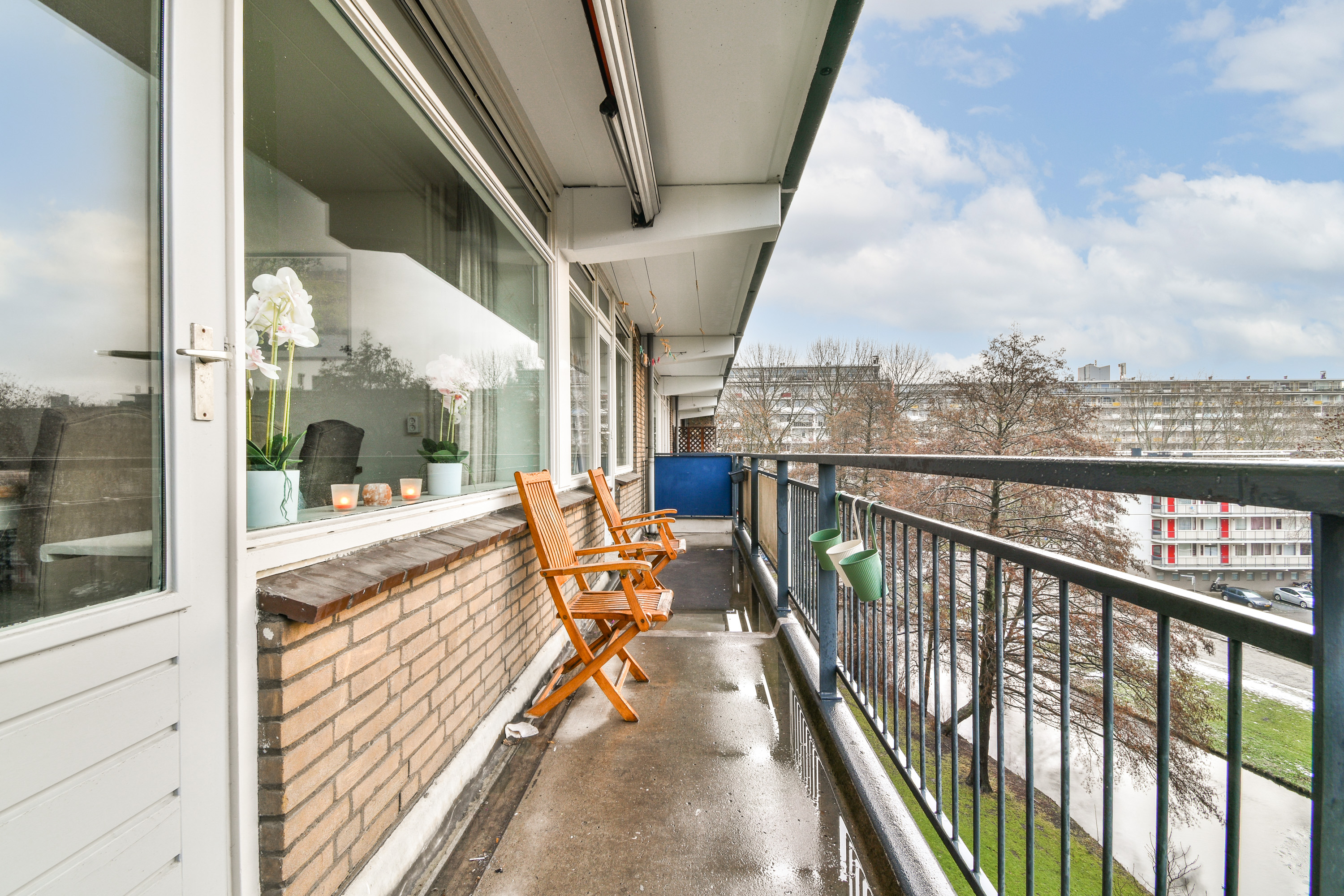 Gelegen op de 5e verdieping van een verzorgd complex in de geliefde wijk Schiedam-Noord (Groenoord) bevindt zich dit lichte 4 kamer appartement met vrij uitzicht over de singel. Het complex is voorzien van een lift, intercom en betreft een nette galerijflat. Het appartement beschikt over een zonnig balkon op het zuiden, waar u dankzij het aanwezige zonnescherm heerlijk kunt genieten van de zon. De woning is geheel voorzien van dubbel glas, wat bijdraagt aan een comfortabel woonklimaat. Tevens is het buitenschilderwerk recent uitgevoerd en is de dakbedekking in 2025 vernieuwd, wat zorgt voor een goed onderhouden gebouw. Op de begane grond bevindt zich een praktische berging, ideaal voor fietsen en extra opslag. De rustige ligging aan de achterzijde, grenzend aan de singel, maakt dit appartement extra aantrekkelijk voor wie houdt van groen en privacy, terwijl voorzieningen en uitvalswegen zich in de directe omgeving bevinden.