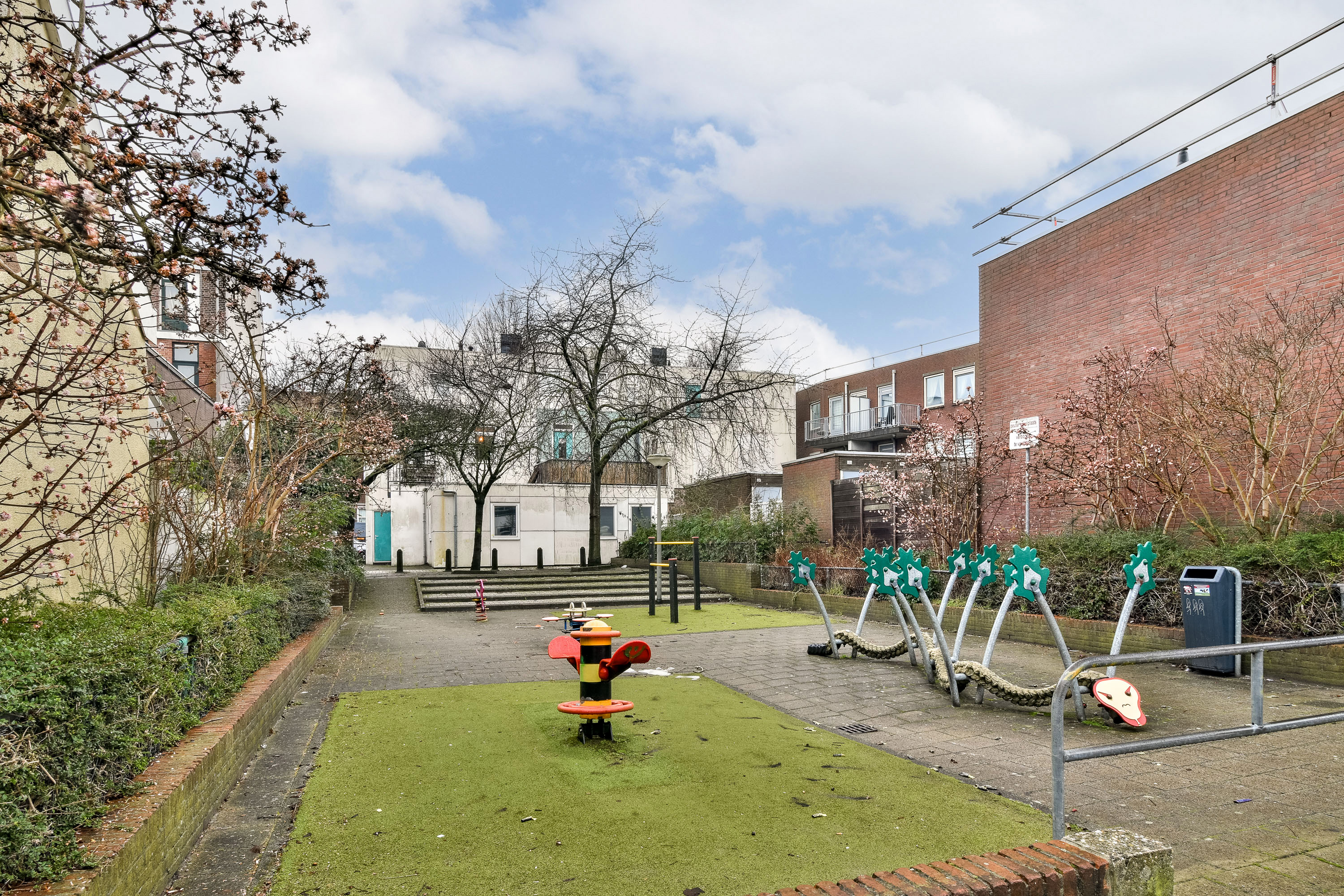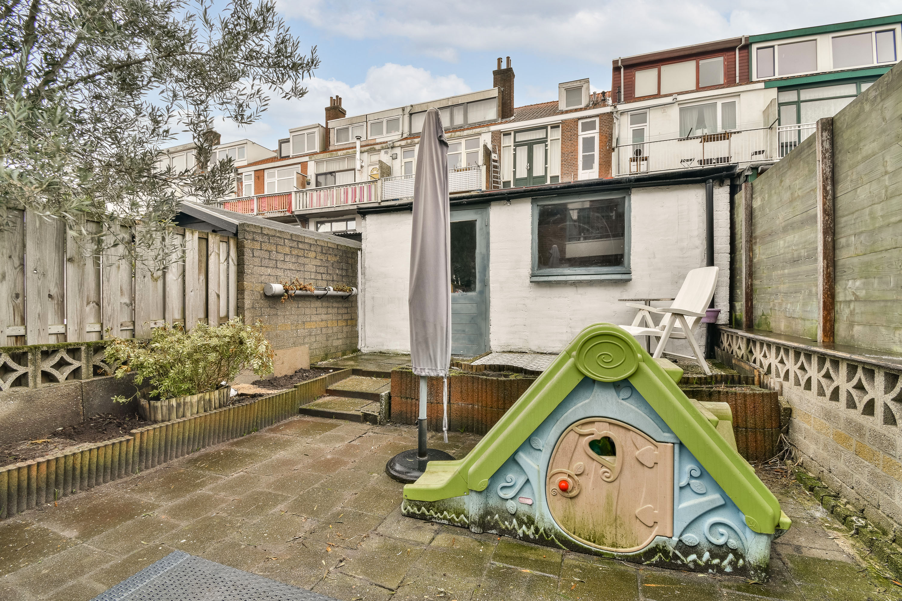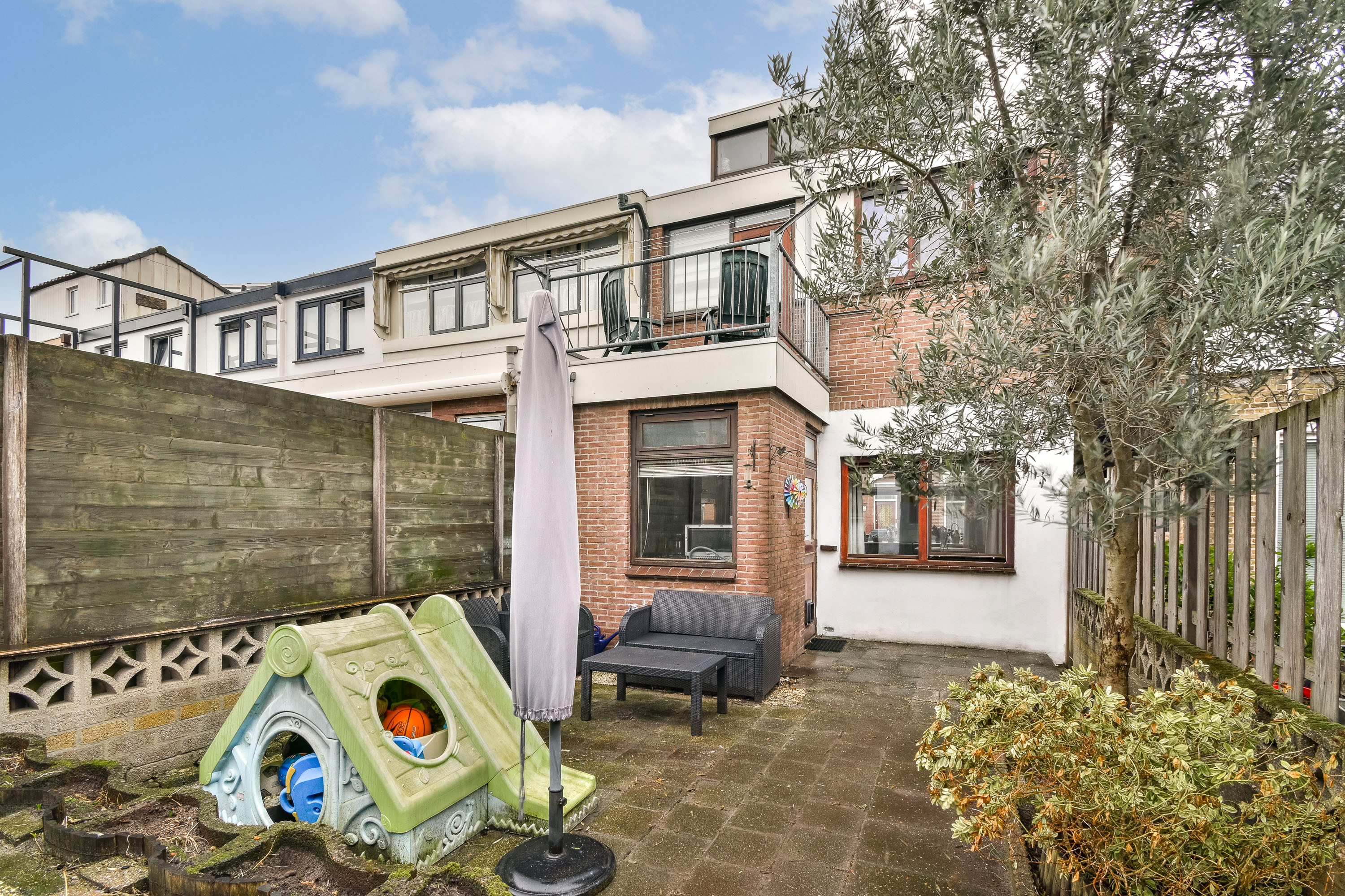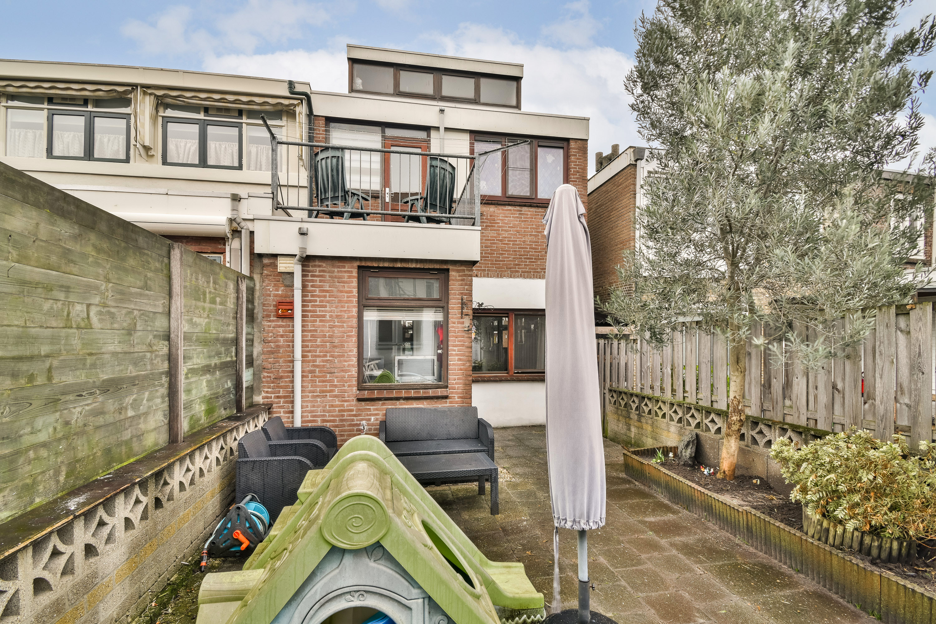 De zonnige achtertuin is gelegen op het zuidwesten en beschikt over een ruime stenen berging, ideaal voor fietsen en tuinbenodigdheden.
