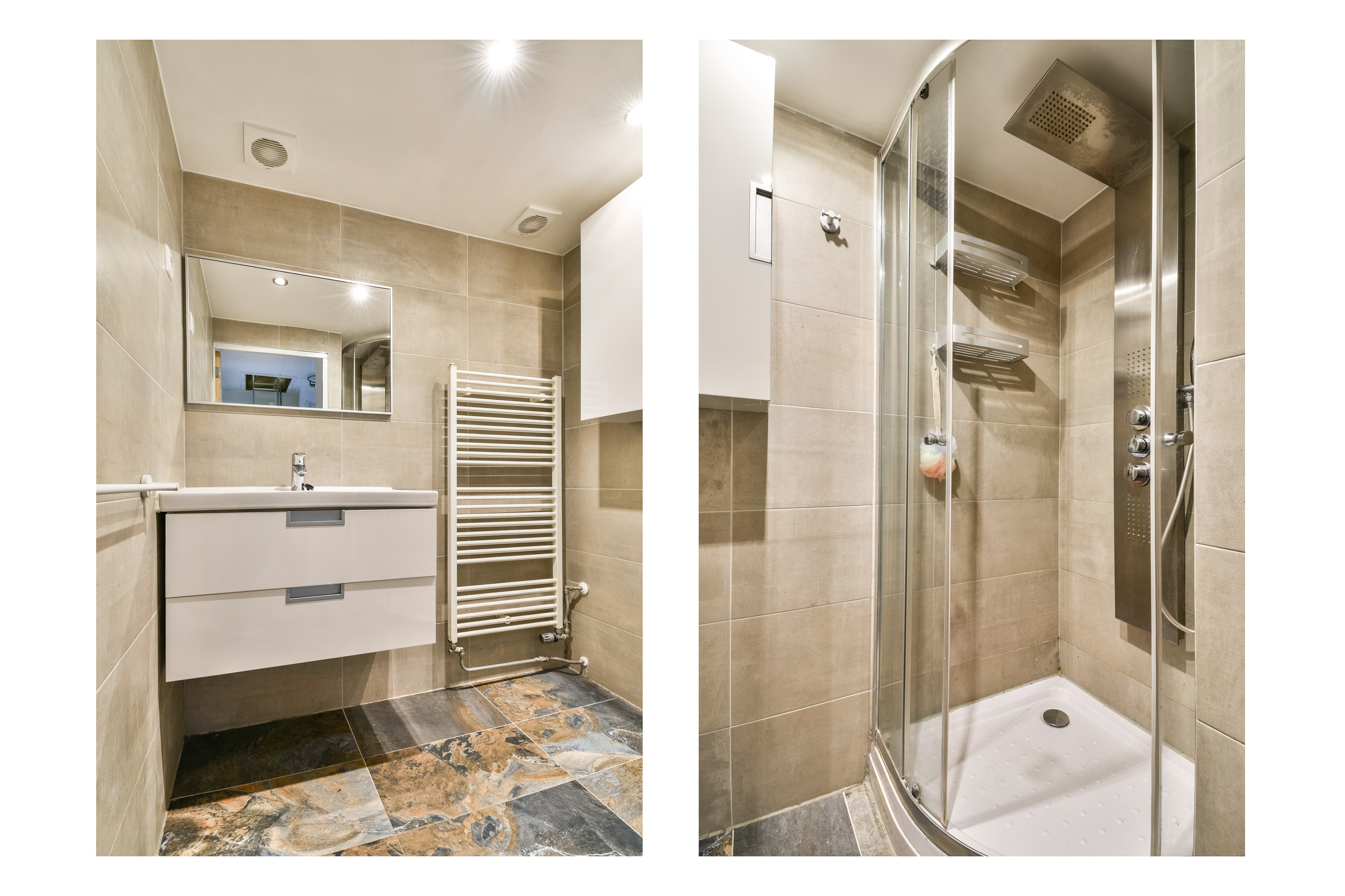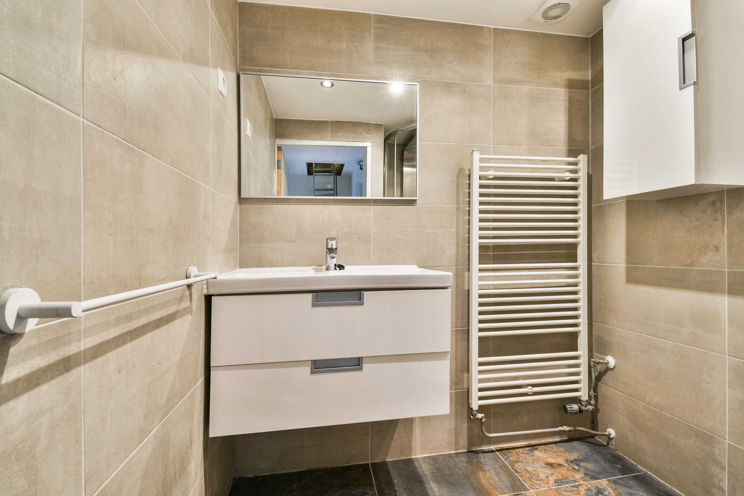 De keurige, geheel betegelde badkamer is uitgerust met een douchecabine, wastafelmeubel, handdoekenradiator en mechanische ventilatie.