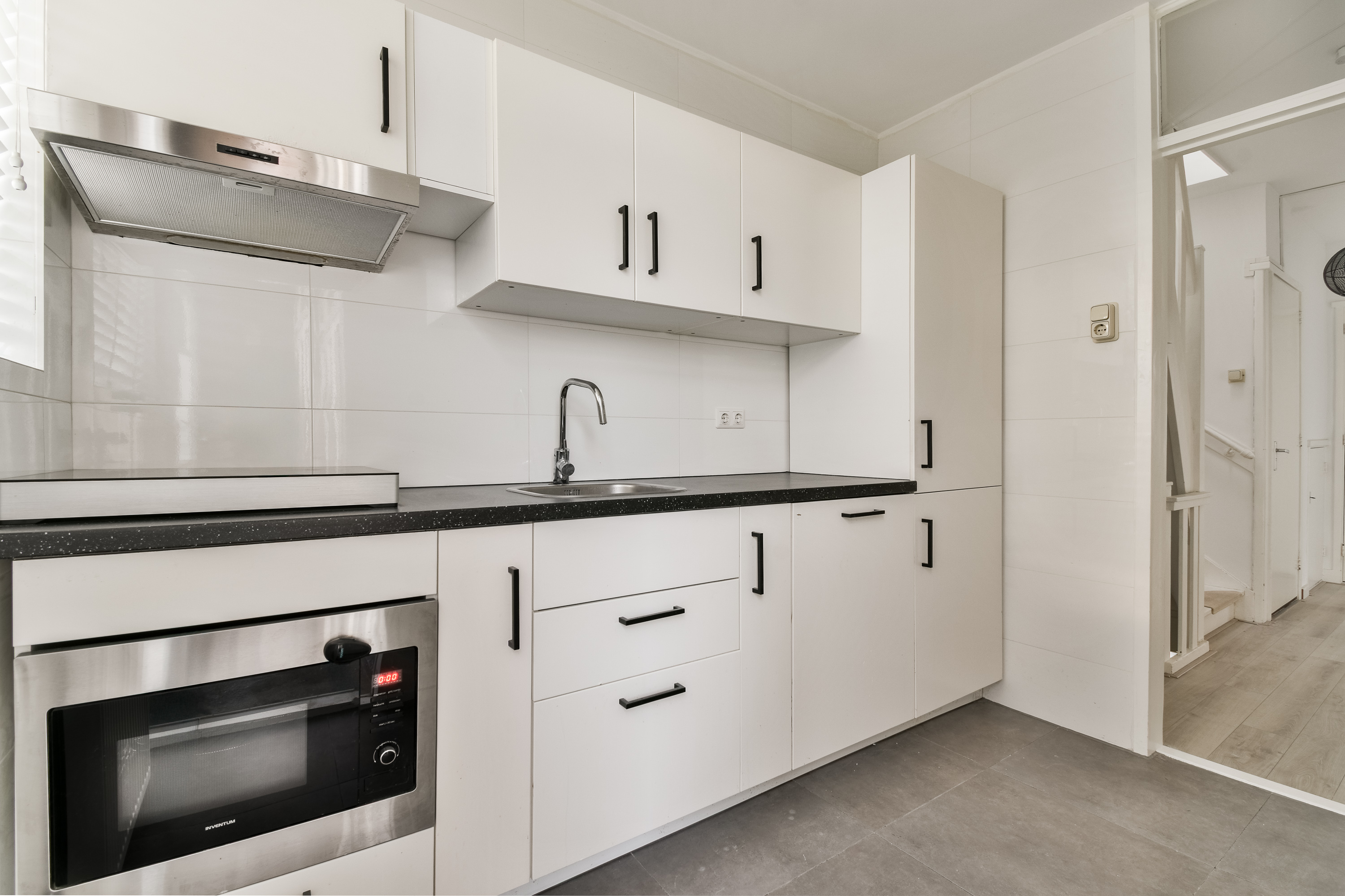 De dichte keuken bevindt zich eveneens aan de achterzijde en is voorzien van inbouwapparatuur, waaronder een inductiekookplaat, koel-/vriescombinatie, afzuigkap, vaatwasser en combimagnetron. Vanuit de keuken is er toegang tot het tweede balkon.