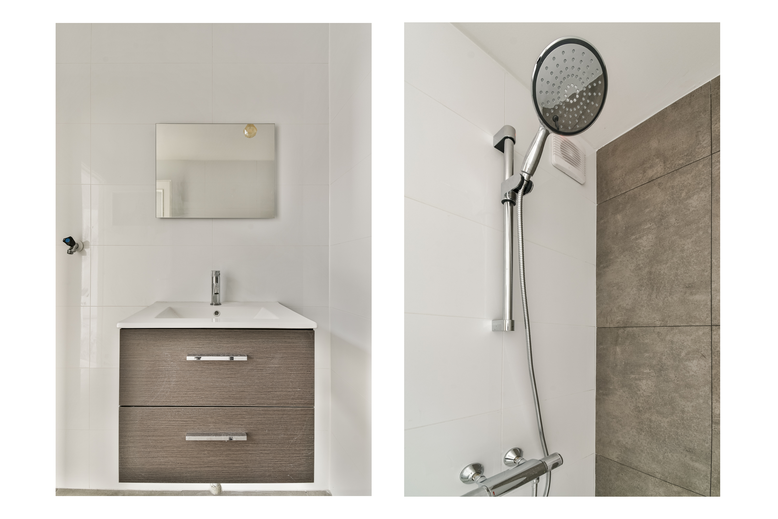 De badkamer is voorzien van een douchehoek, wastafelmeubel en wasmachineaansluiting.