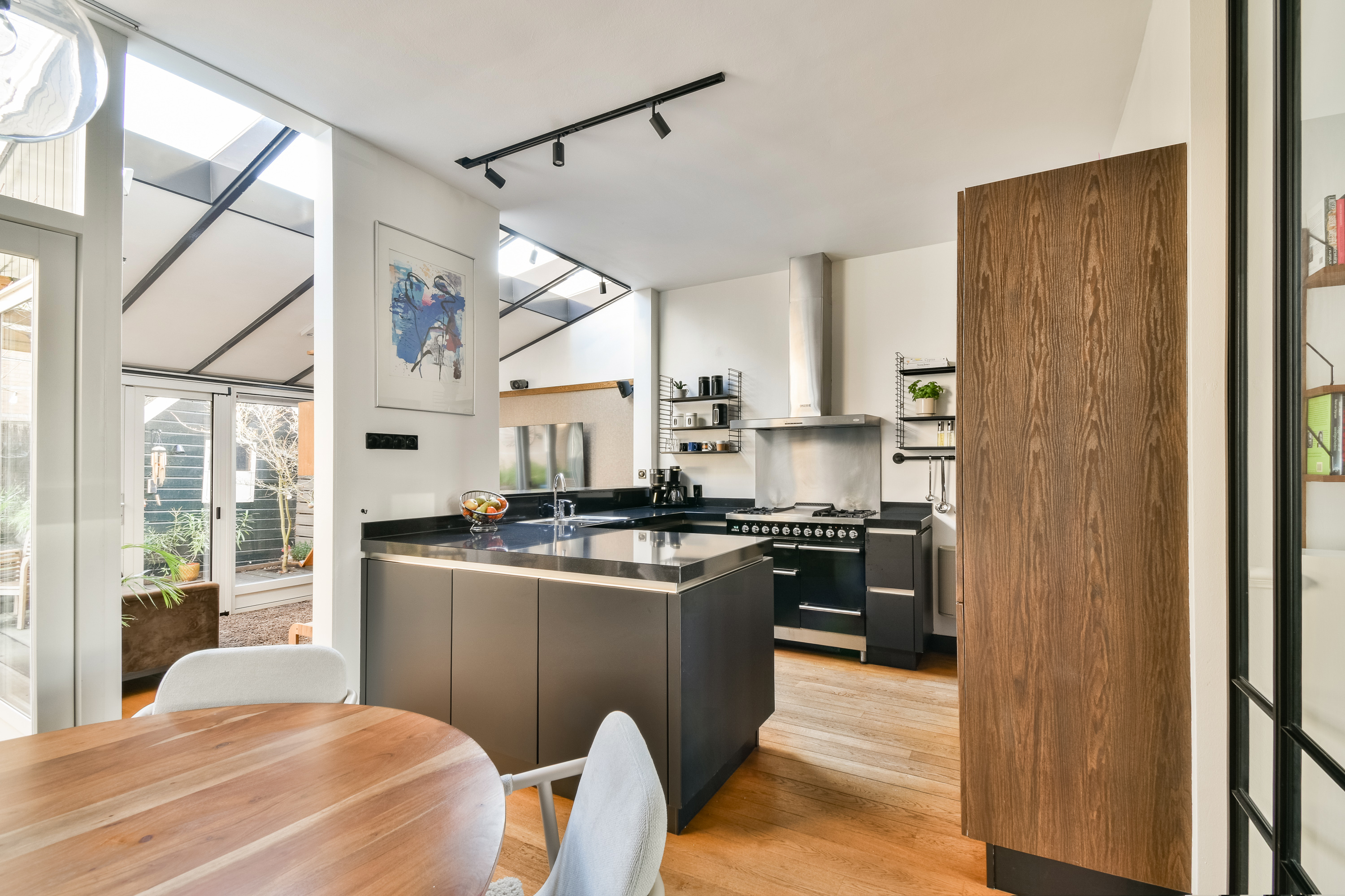 De royale woonkamer en woonkeuken met serre vormen een lichte en ruimtelijke leefomgeving. Vanuit de woonkeuken én serre is er directe toegang tot de tuin.
