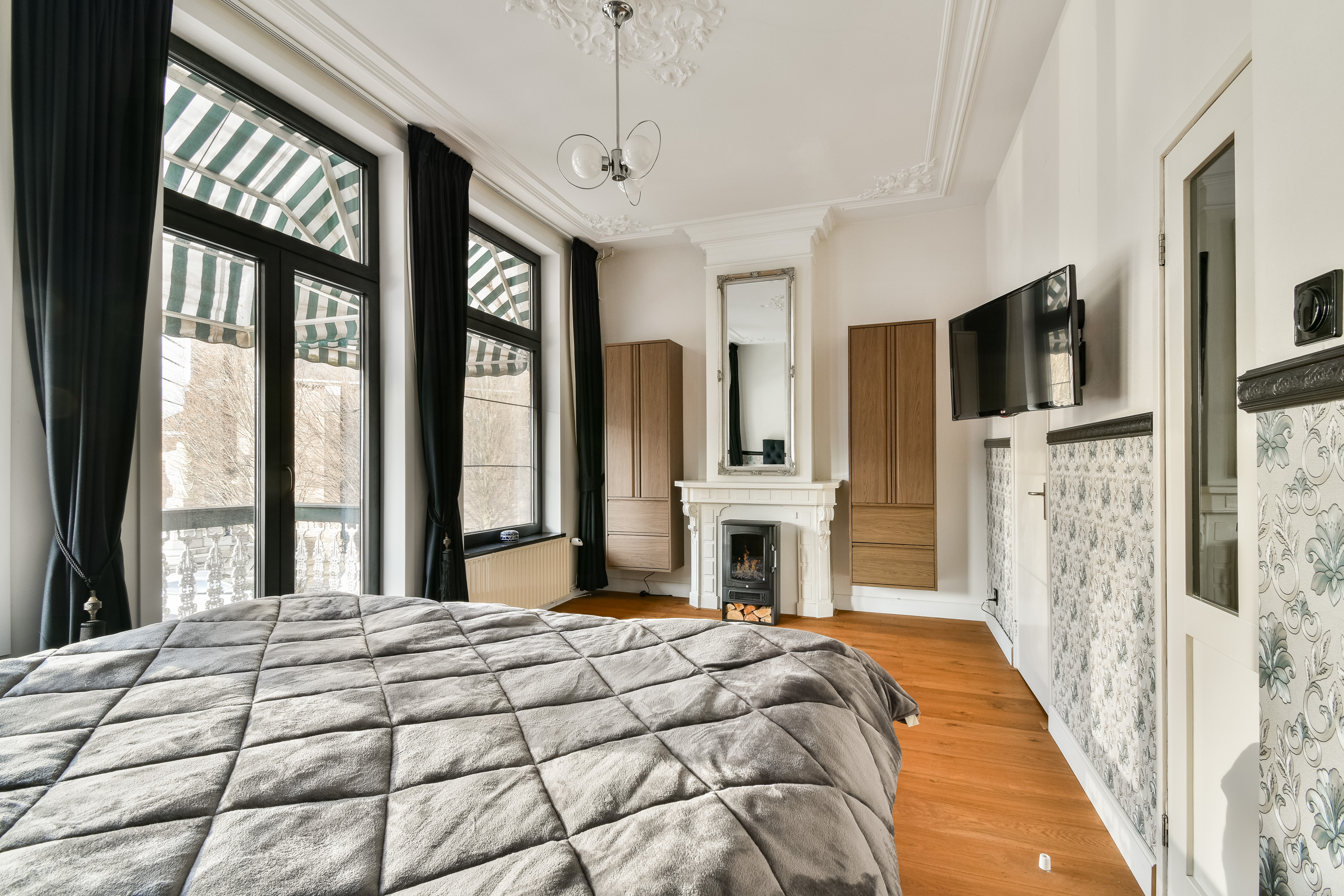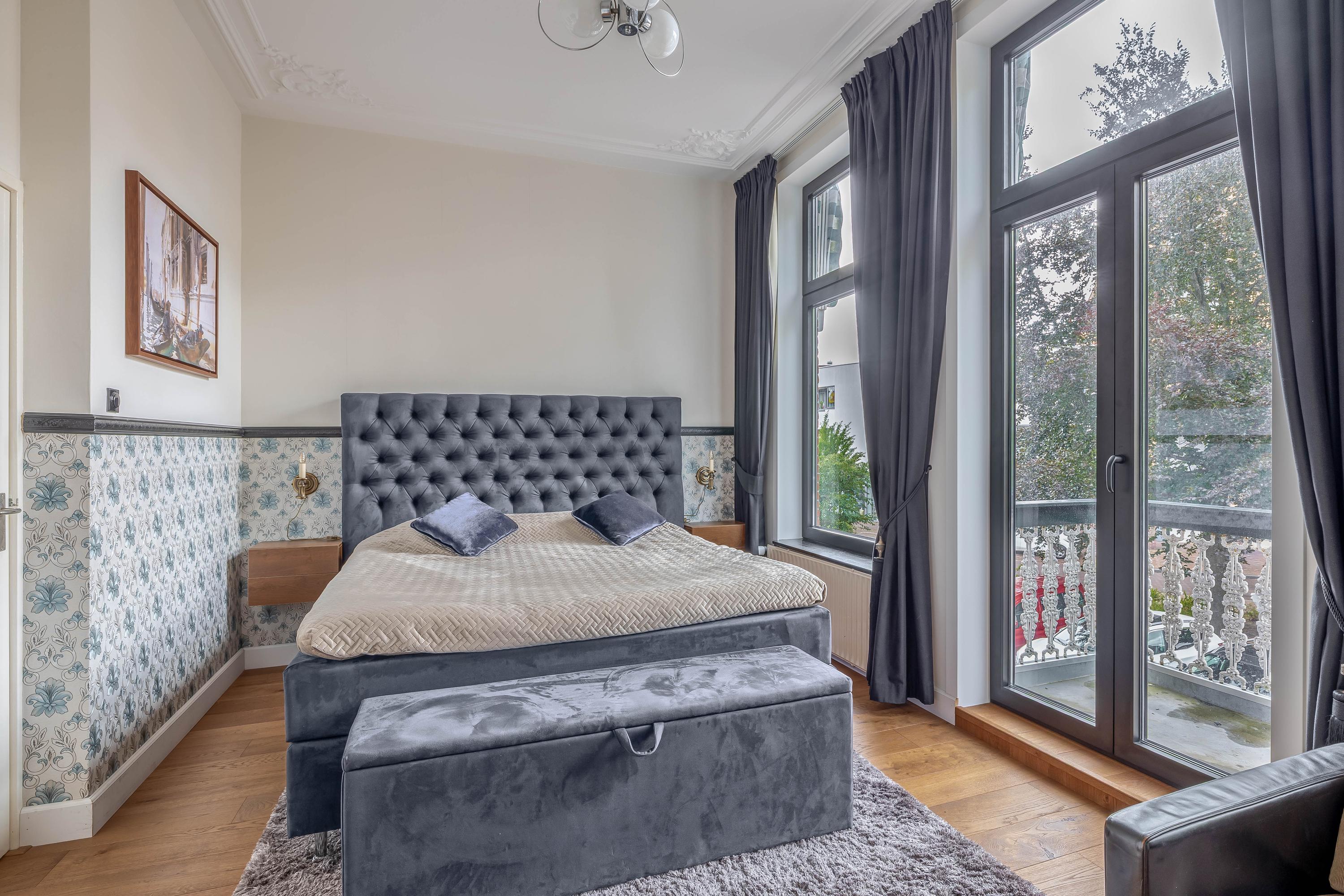 De royale slaapkamer aan de voorzijde beschikt over een authentieke schouw, een fraai ornamentenplafond en openslaande deuren naar het balkon. Daarnaast is er een tweede kamer aanwezig, geschikt als slaap- of werkkamer. De gehele verdieping is voorzien van markiezen aan de voor- en achterzijde.