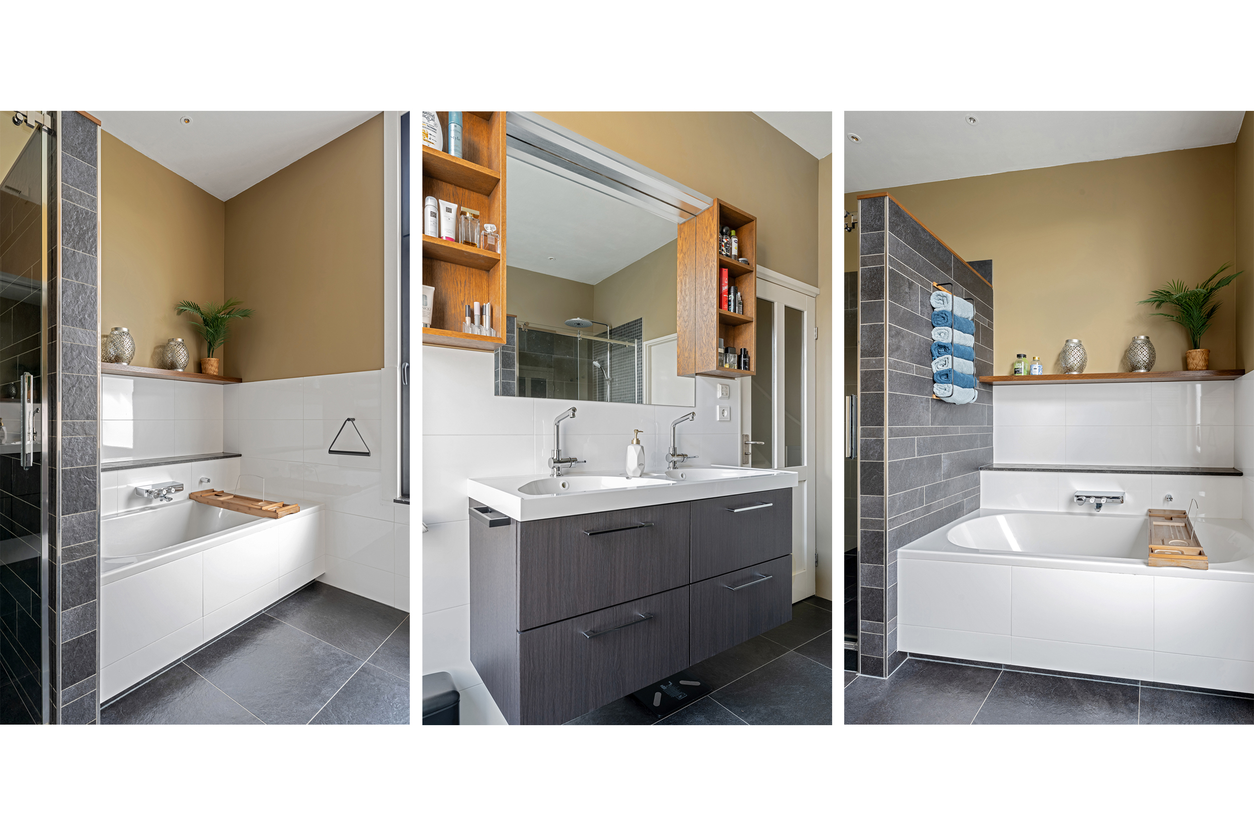 Vanaf de overloop bereikt u de hal met separaat toilet. De ruime en moderne badkamer is voorzien van een dubbele wastafel, ligbad, inloopdouche en vloerverwarming. Aangrenzend bevindt zich een inloopkledingkast.