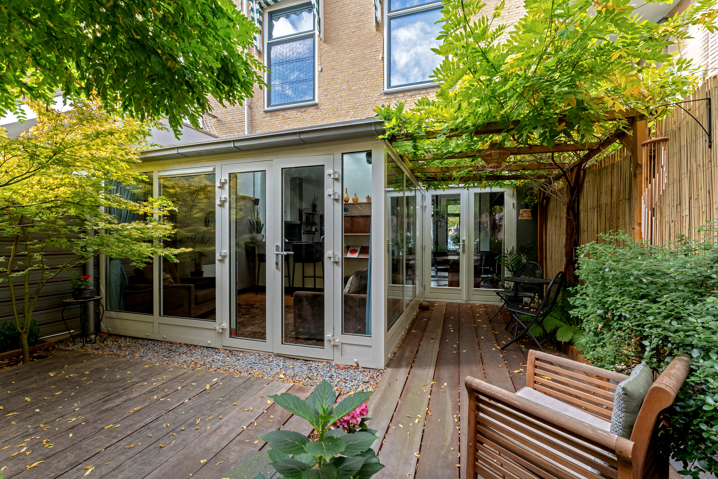 De zonnige stadstuin is gelegen op het zuidoosten en biedt veel privacy dankzij de beschutte ligging. Een heerlijke plek om in alle rust te genieten, midden in de stad. De tuin beschikt over een achterom en een houten berging.