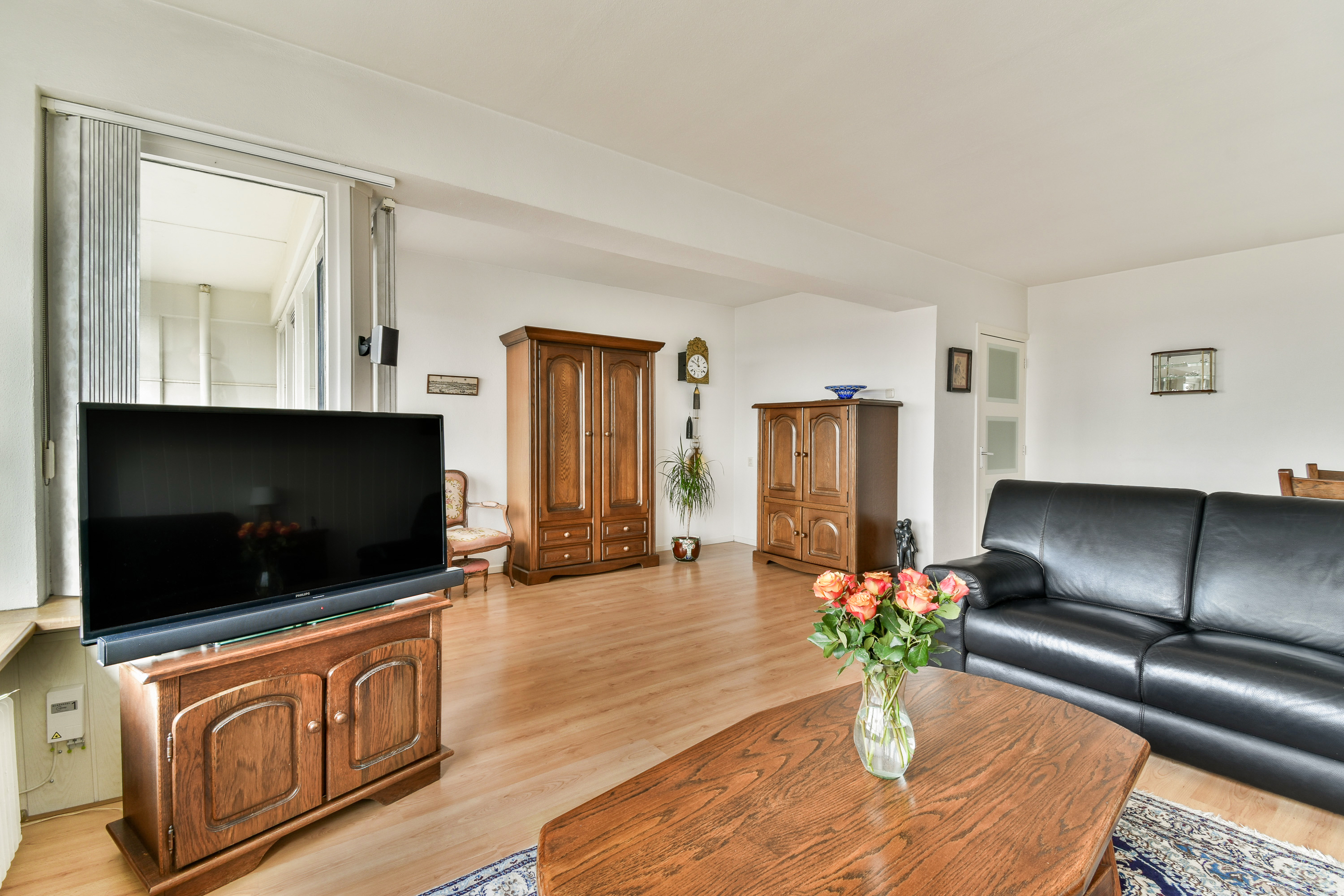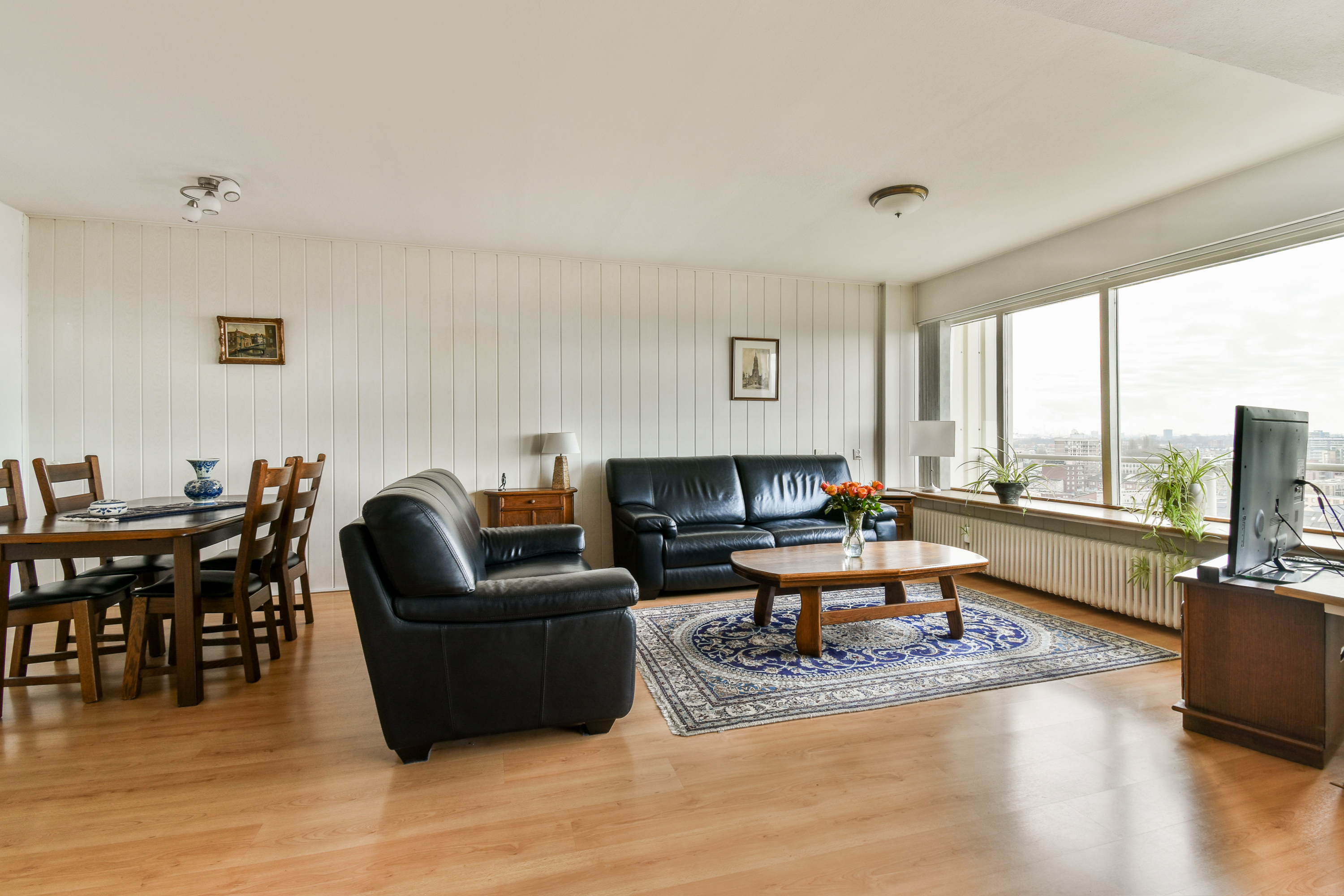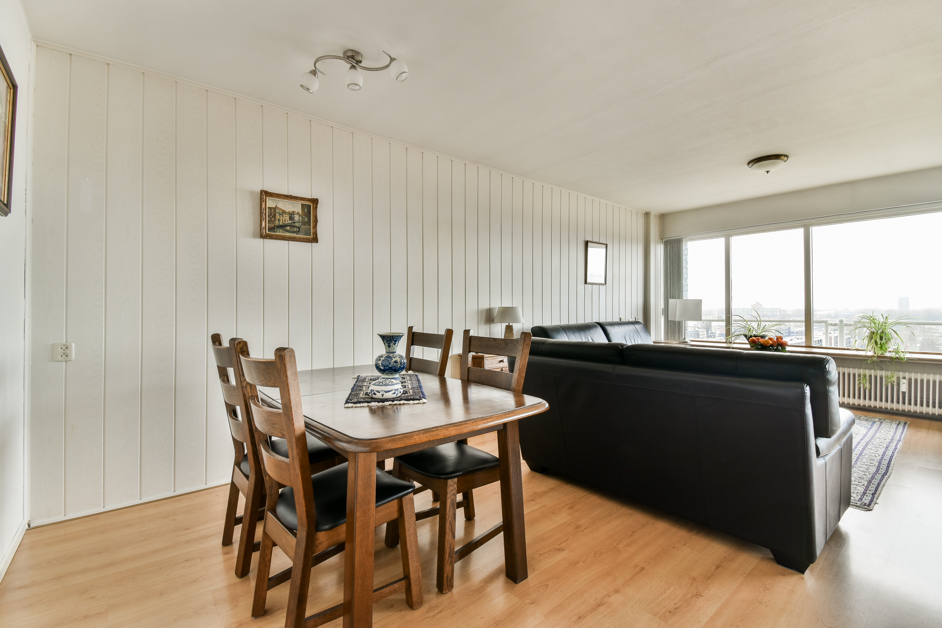 Via de entree kom je in de ruime hal, die toegang biedt tot vrijwel alle vertrekken van het appartement. In de hal bevinden zich een praktische wasruimte en een separate garderoberuimte, wat zorgt voor extra comfort en bergruimte. De dichte keuken is uitgevoerd in een nette wandopstelling en voorzien van een 5-pits gaskookplaat met afzuigkap, een losse vaatwasser en een boiler. Dankzij de efficiënte indeling is er voldoende werk- en kastruimte aanwezig. Het toilet is separaat en uitgevoerd met een fonteintje. De badkamer is functioneel ingericht en beschikt over een wastafelmeubel en een douche. Het appartement telt twee slaapkamers. Slaapkamer 1 is van goed formaat en biedt diverse indelingsmogelijkheden. Slaapkamer 2 onderscheidt zich door het bijzondere uitzicht over de iconische molens van Schiedam, wat elke dag een uniek en typisch Hollands decor oplevert. De zeer royale en lichte woonkamer vormt het hart van het appartement. Door de grote raampartijen geniet je hier van een indrukwekkend weids uitzicht over de omgeving. Vanuit de woonkamer is er directe toegang tot het ruime balkon op het westen, waar je tot in de avonduren kunt genieten van de zon en adembenemende zonsondergangen. Een heerlijke plek om tot rust te komen en te genieten van het uitzicht op hoogte.