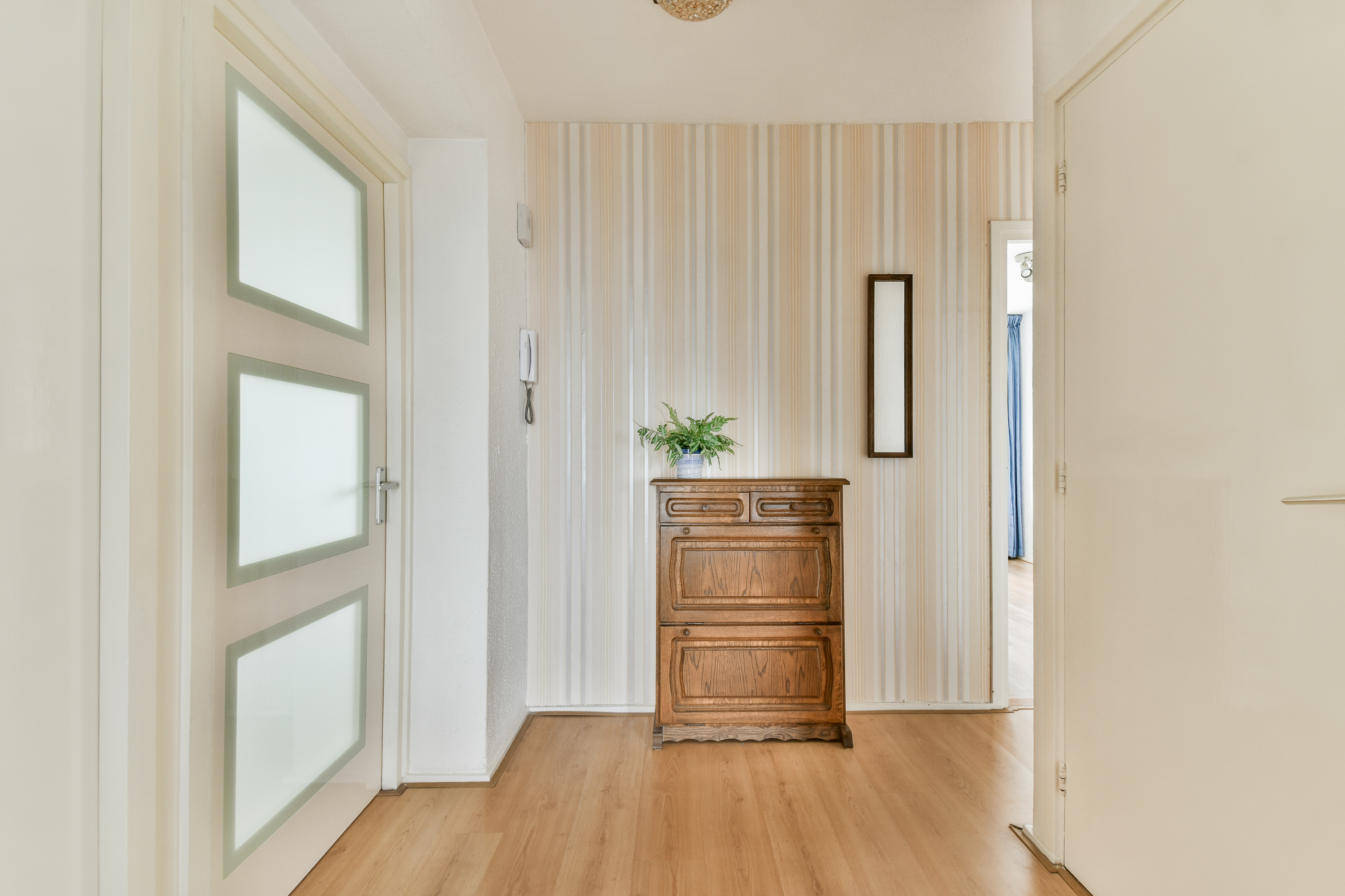 Afgesloten entree met bellentableau, brievenbussen, intercom, liftinstallatie en bergingen.