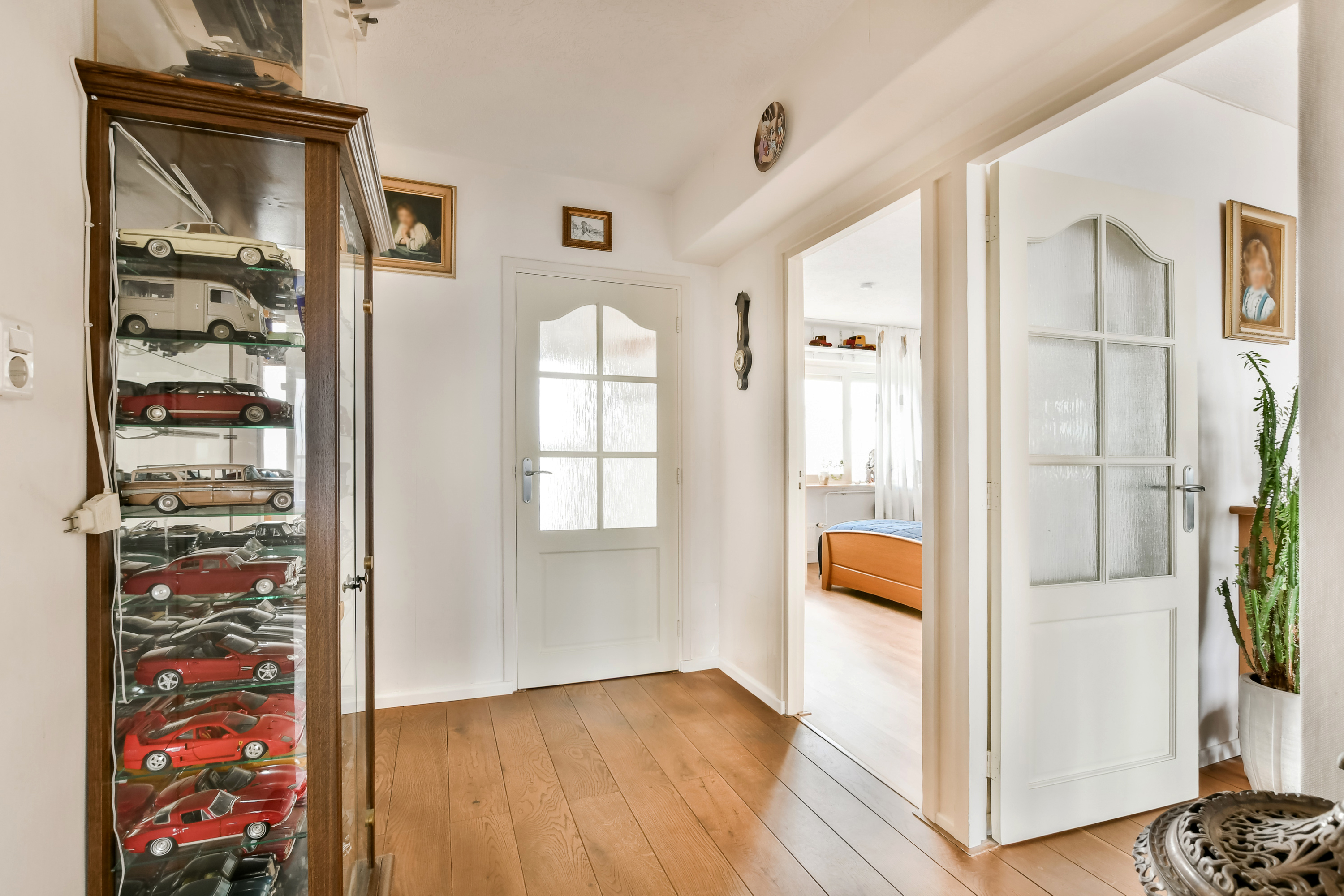 Entree met intercom en ontvangsthal met vaste kast waarin de elektrische boiler is geplaatst. Vanuit de centrale hal zijn alle vertrekken toegankelijk.