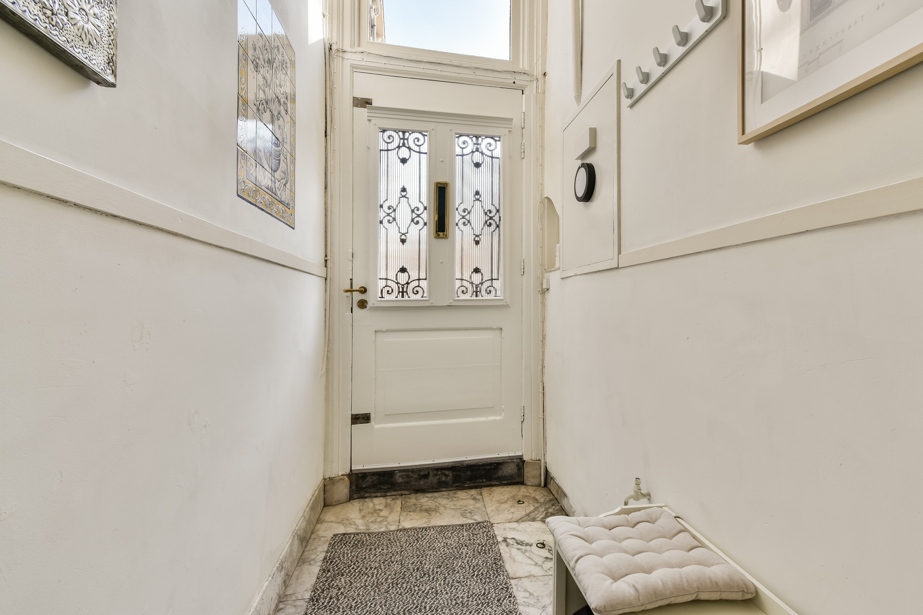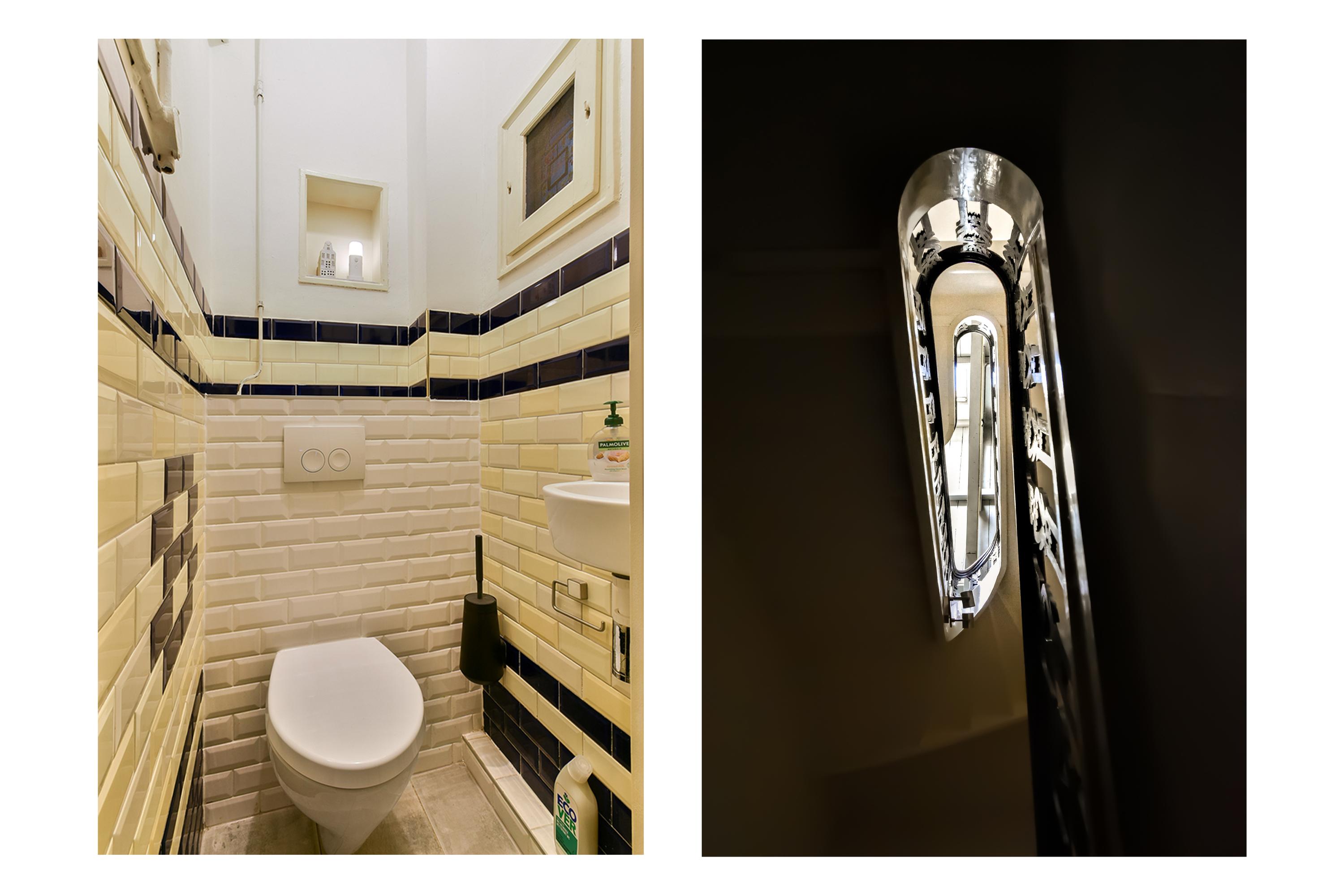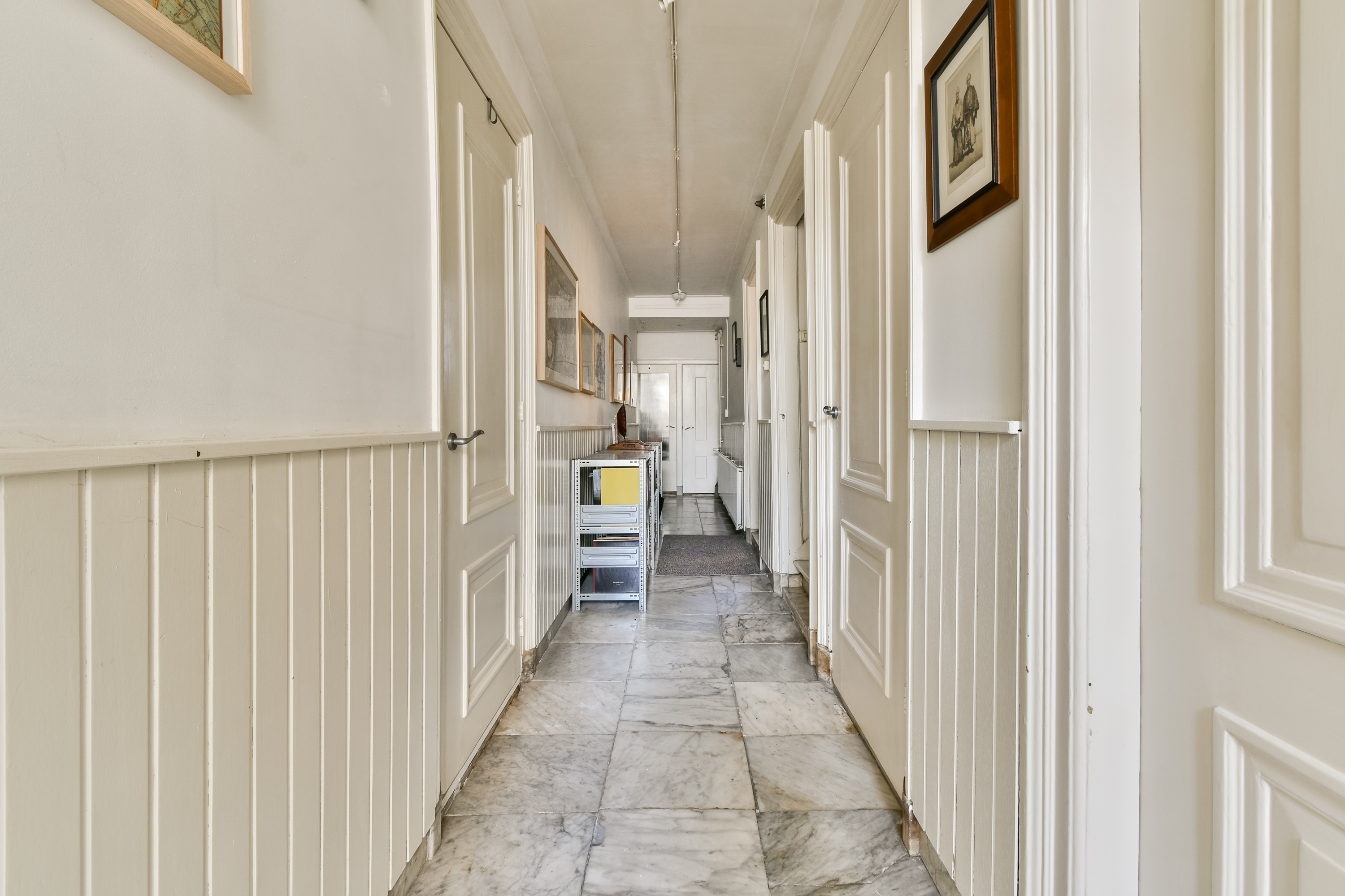 Entree. Via het prachtige tochtportaal betreedt u de diepe, statige gang met marmeren vloer. Hier bevinden zich de toiletruimte, toegang tot de provisiekelder, de bijkeuken, het trappenhuis en de woonvertrekken. De voorkamer of eerste slaapkamer is een indrukwekkende leefruimte met ornamentenplafond en Portugese tegelvloer. Dankzij de royale afmetingen biedt deze kamer talloze indelingsmogelijkheden. De tussenkamer staat in open verbinding met de voor- en achterkamer. Ideaal als werkplek, bibliotheek, tv-kamer of speelhoek voor de kinderen. De sfeervolle woonkeuken vormt het hart van de woning. Voorzien van kookeiland en inbouwapparatuur, onder andere een 6-pits gasfornuis, afzuigkap, vaatwasser, losse koel-/vriescombinatie en een granieten werkblad, vaste kasten, schouw en een karakteristiek ornamentenplafond. De Portugese tegelvloer geeft de ruimte extra charme. Aan de achterzijde is een tweede slaapkamer of werkruimte gecreëerd. Tevens geeft deze ruimte toegang tot de achterplaats.