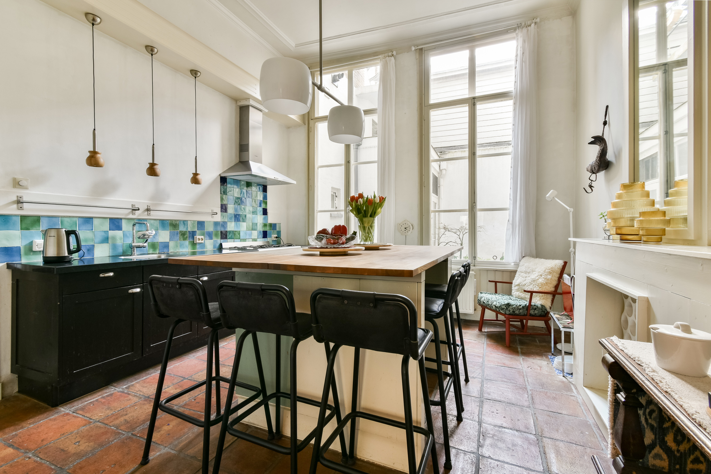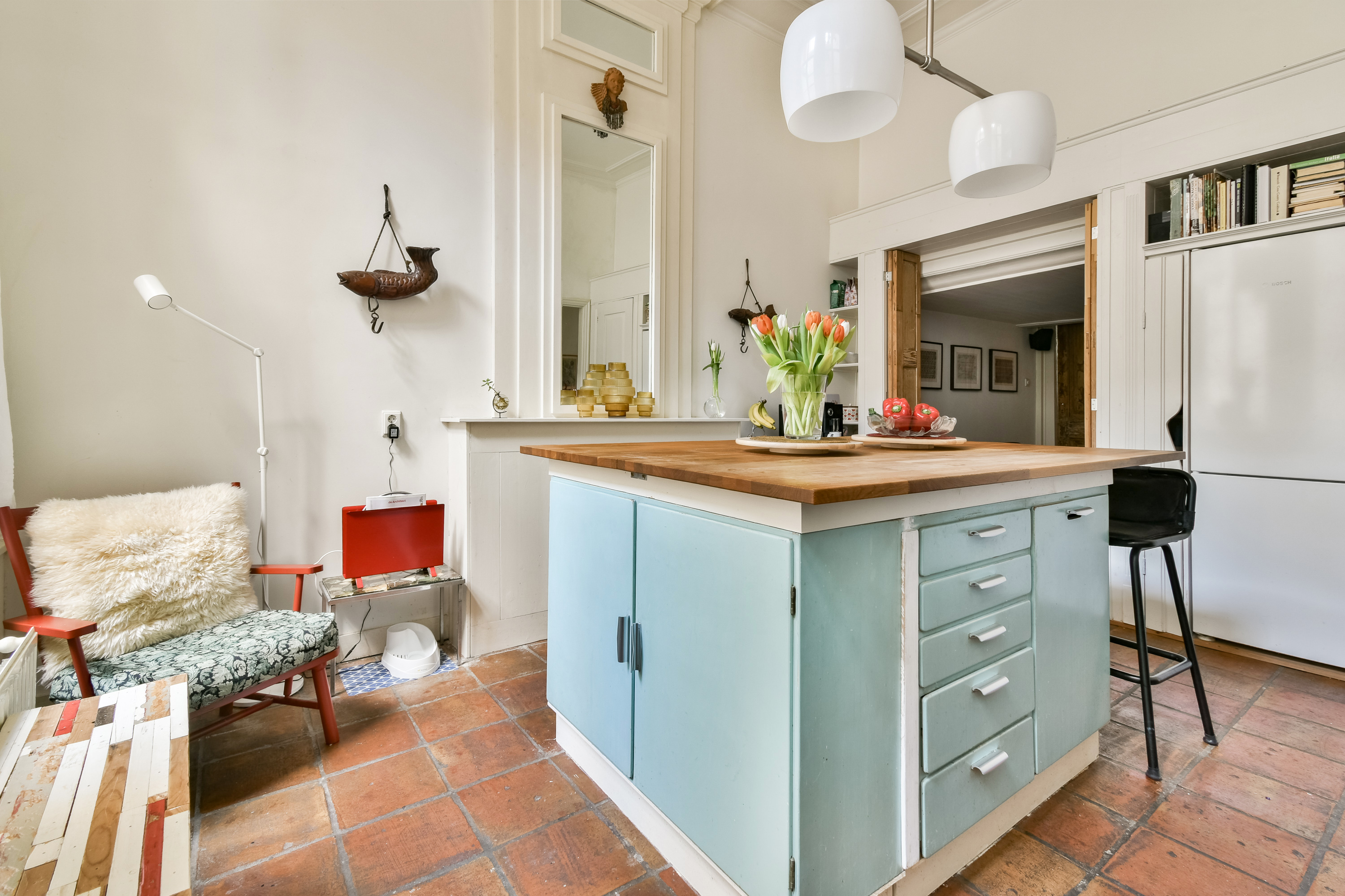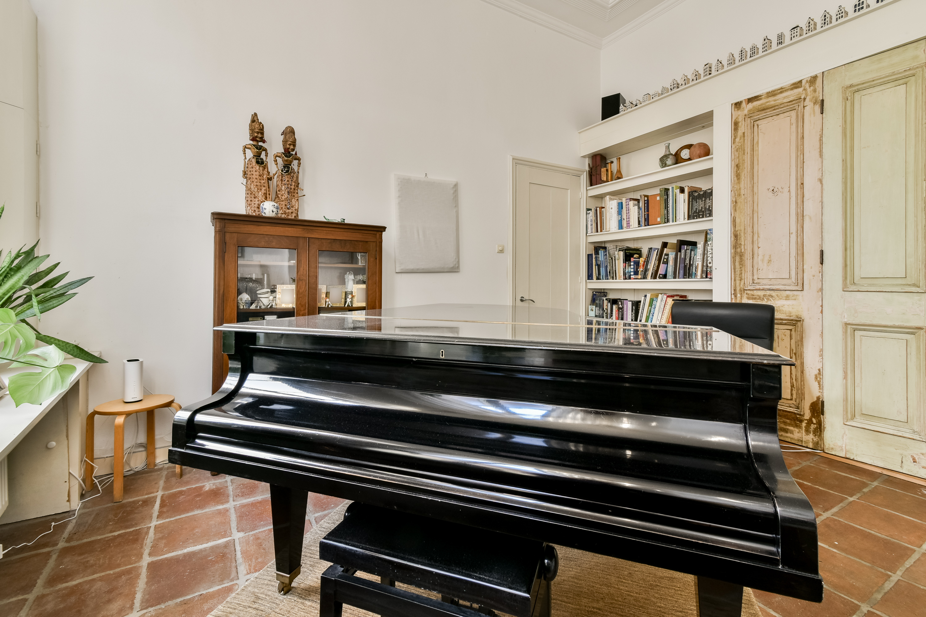 Entree. Via het prachtige tochtportaal betreedt u de diepe, statige gang met marmeren vloer. Hier bevinden zich de toiletruimte, toegang tot de provisiekelder, de bijkeuken, het trappenhuis en de woonvertrekken. De voorkamer of eerste slaapkamer is een indrukwekkende leefruimte met ornamentenplafond en Portugese tegelvloer. Dankzij de royale afmetingen biedt deze kamer talloze indelingsmogelijkheden. De tussenkamer staat in open verbinding met de voor- en achterkamer. Ideaal als werkplek, bibliotheek, tv-kamer of speelhoek voor de kinderen. De sfeervolle woonkeuken vormt het hart van de woning. Voorzien van kookeiland en inbouwapparatuur, onder andere een 6-pits gasfornuis, afzuigkap, vaatwasser, losse koel-/vriescombinatie en een granieten werkblad, vaste kasten, schouw en een karakteristiek ornamentenplafond. De Portugese tegelvloer geeft de ruimte extra charme. Aan de achterzijde is een tweede slaapkamer of werkruimte gecreëerd. Tevens geeft deze ruimte toegang tot de achterplaats.