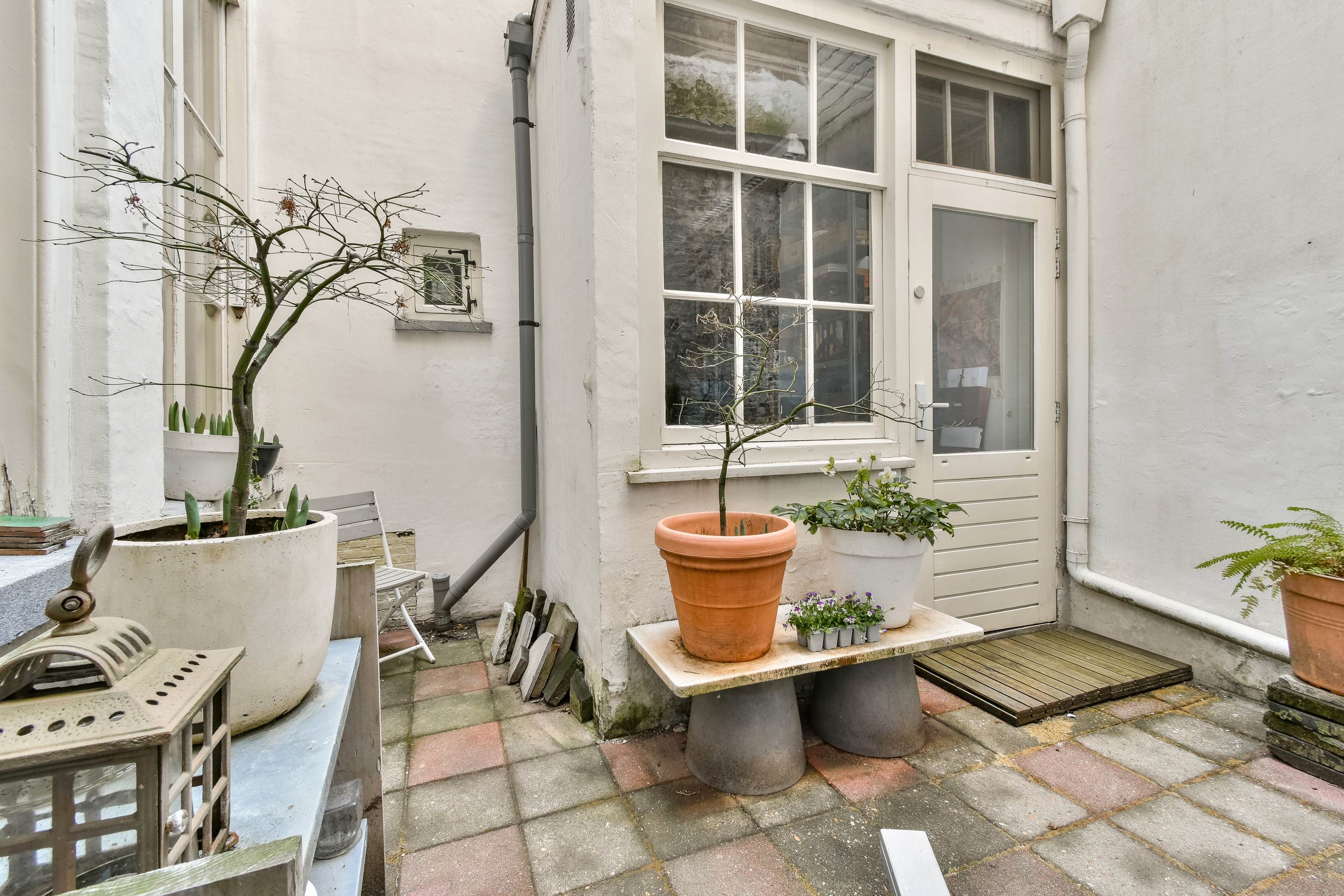De besloten achterplaats is gelegen op het noordwesten en vormt een heerlijke, onderhoudsvriendelijke plek om in alle rust te genieten van het buitenleven. Gelegen midden in het bruisende centrum, maar eenmaal op de binnenplaats valt alle stadse drukte volledig weg en ervaart u een oase van serene rust.