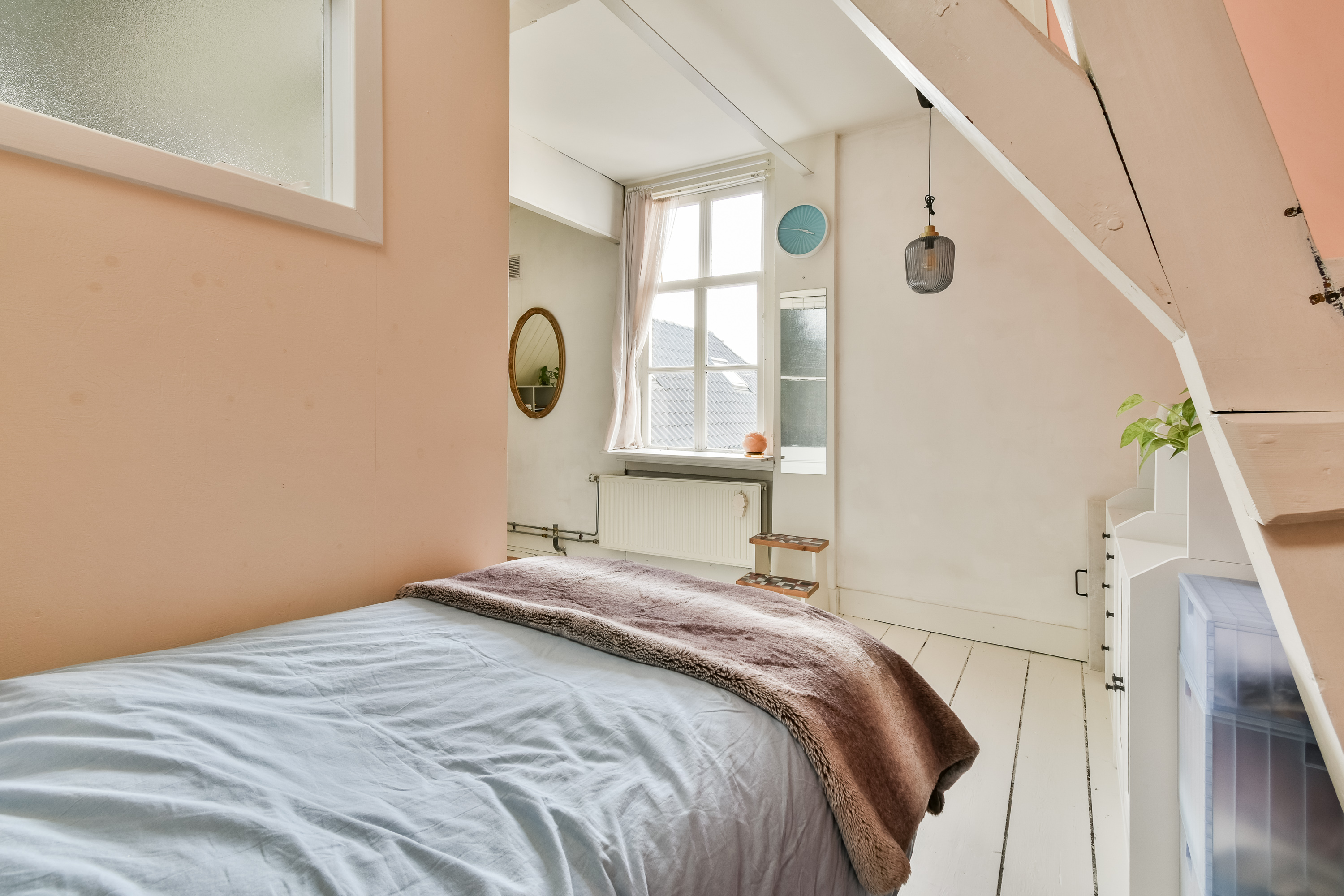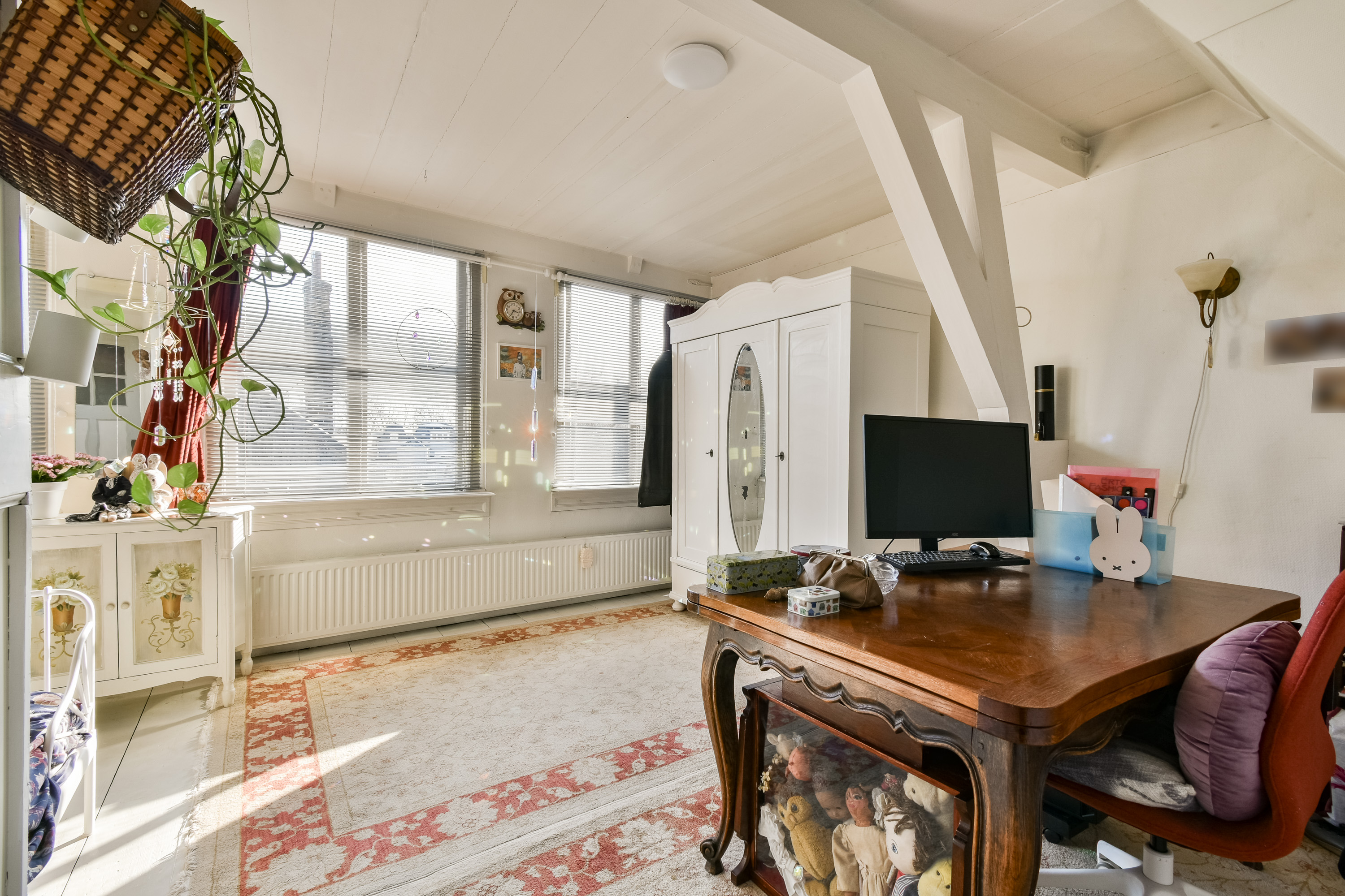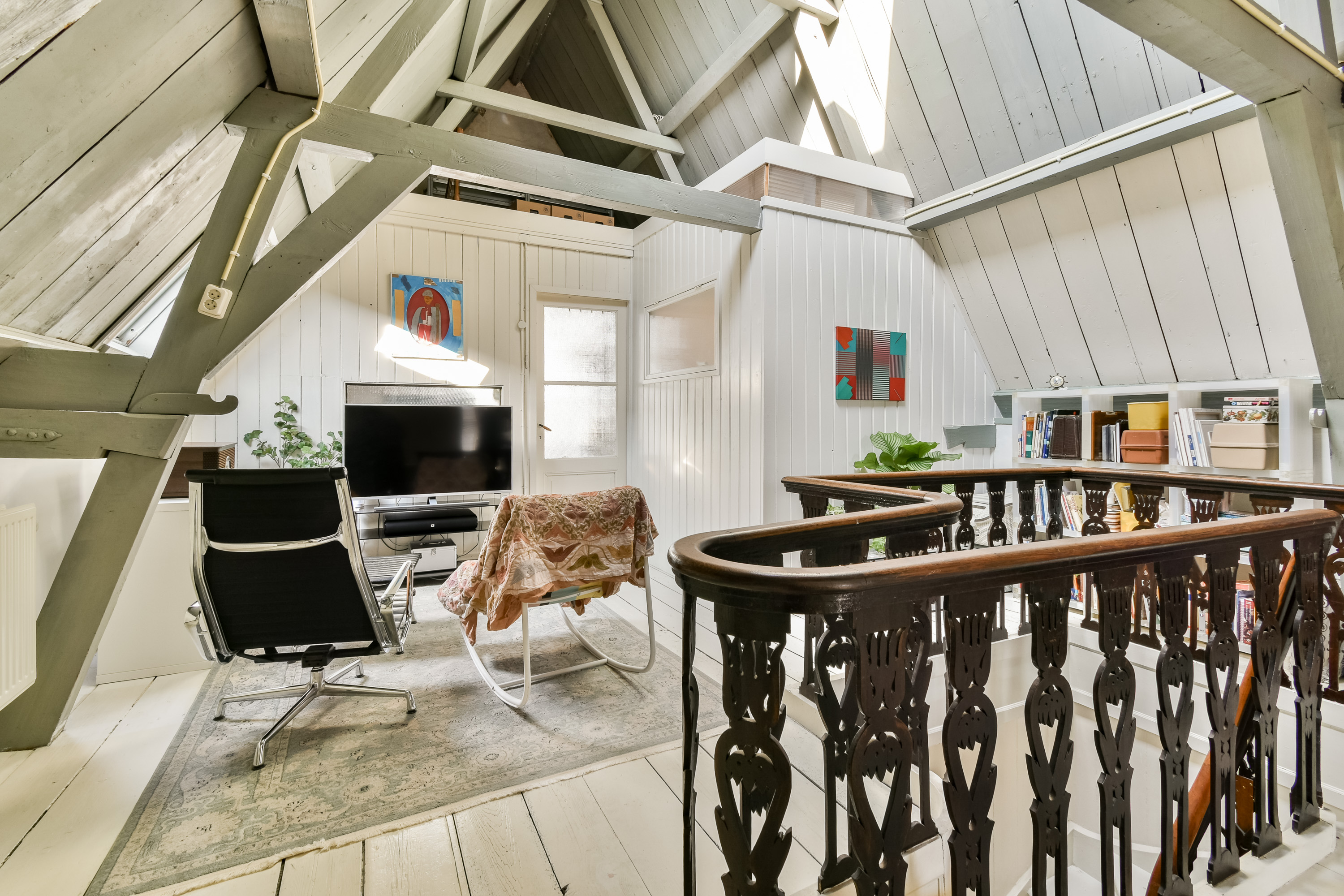Een zeer royale overloop/open zolderruimte met Velux dakraam. Ideaal als werkruimte, atelier of extra leefruimte. Tevens is er extra bergruimte aanwezig via de vide-bergingen bereikbaar met een ladder. Vanuit deze open ruimte is er toegang tot nog eens twee slaapkamers, gelegen aan de voor- en achterzijde van de woning. Beiden voorzien van een eikenhouten vloer.