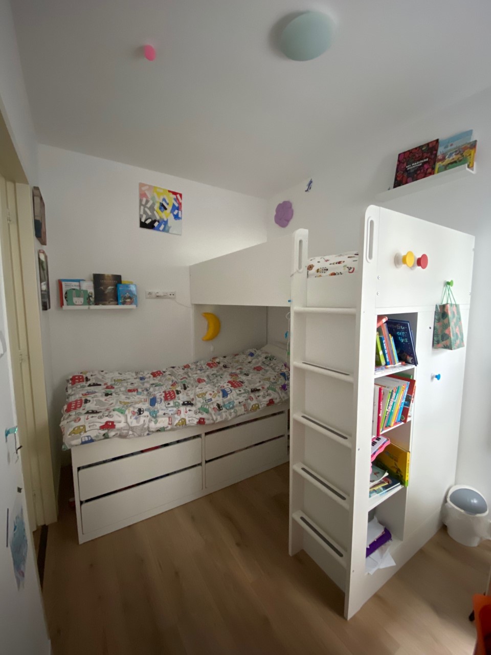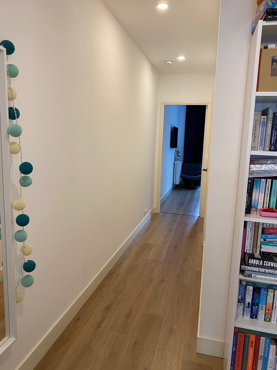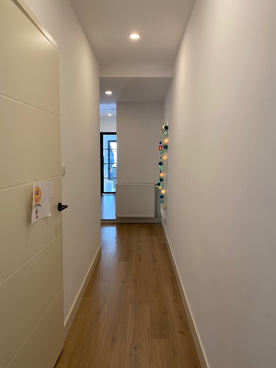 Via de hal bereikt u het zwevend toilet, de badkamer met regendouche en twee slaapkamers.