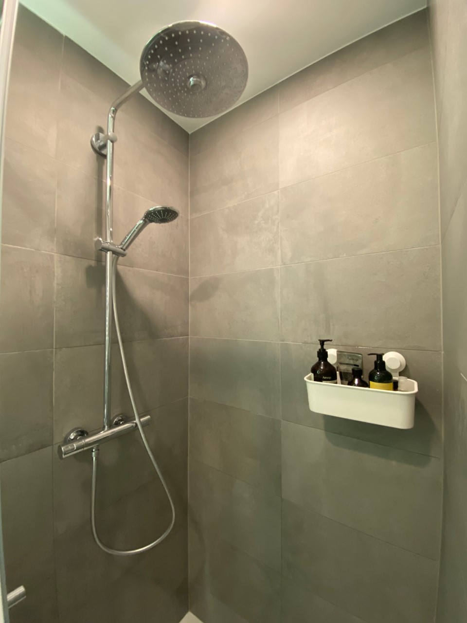 • Badkamer (ca. 1.00 x 2.00) met regendouche, badkamermeubel met verlichte spiegel en elektrische verwarming.