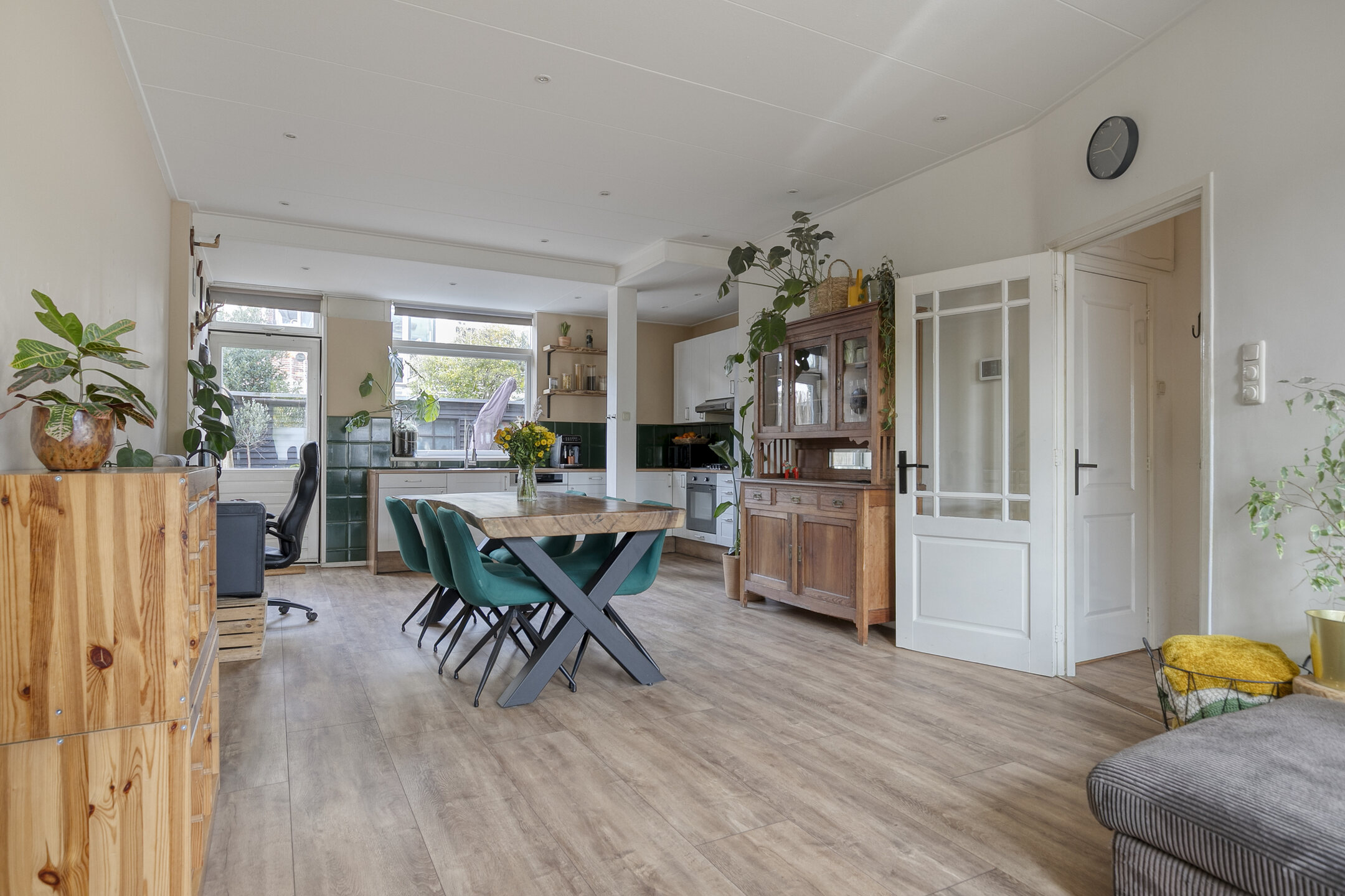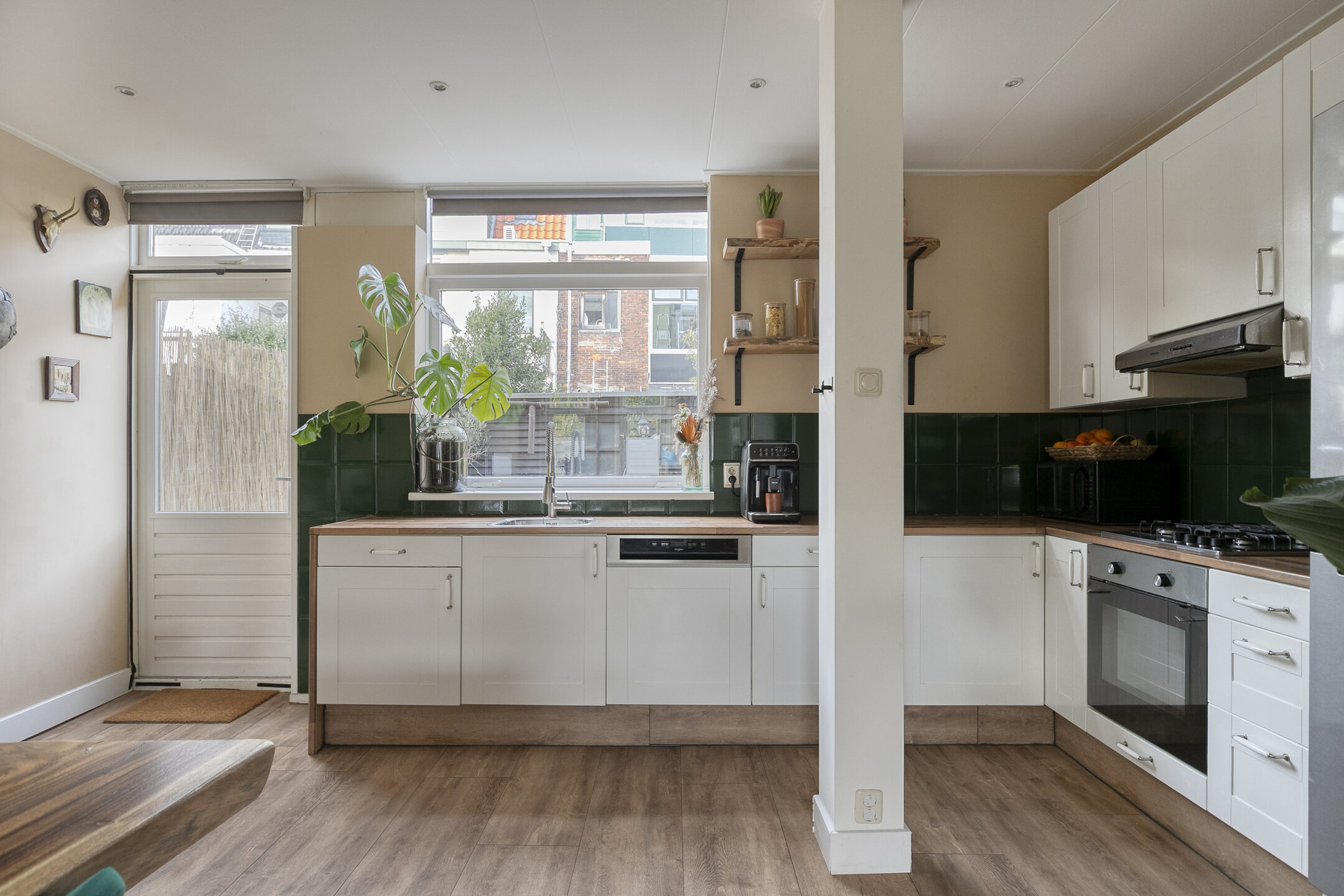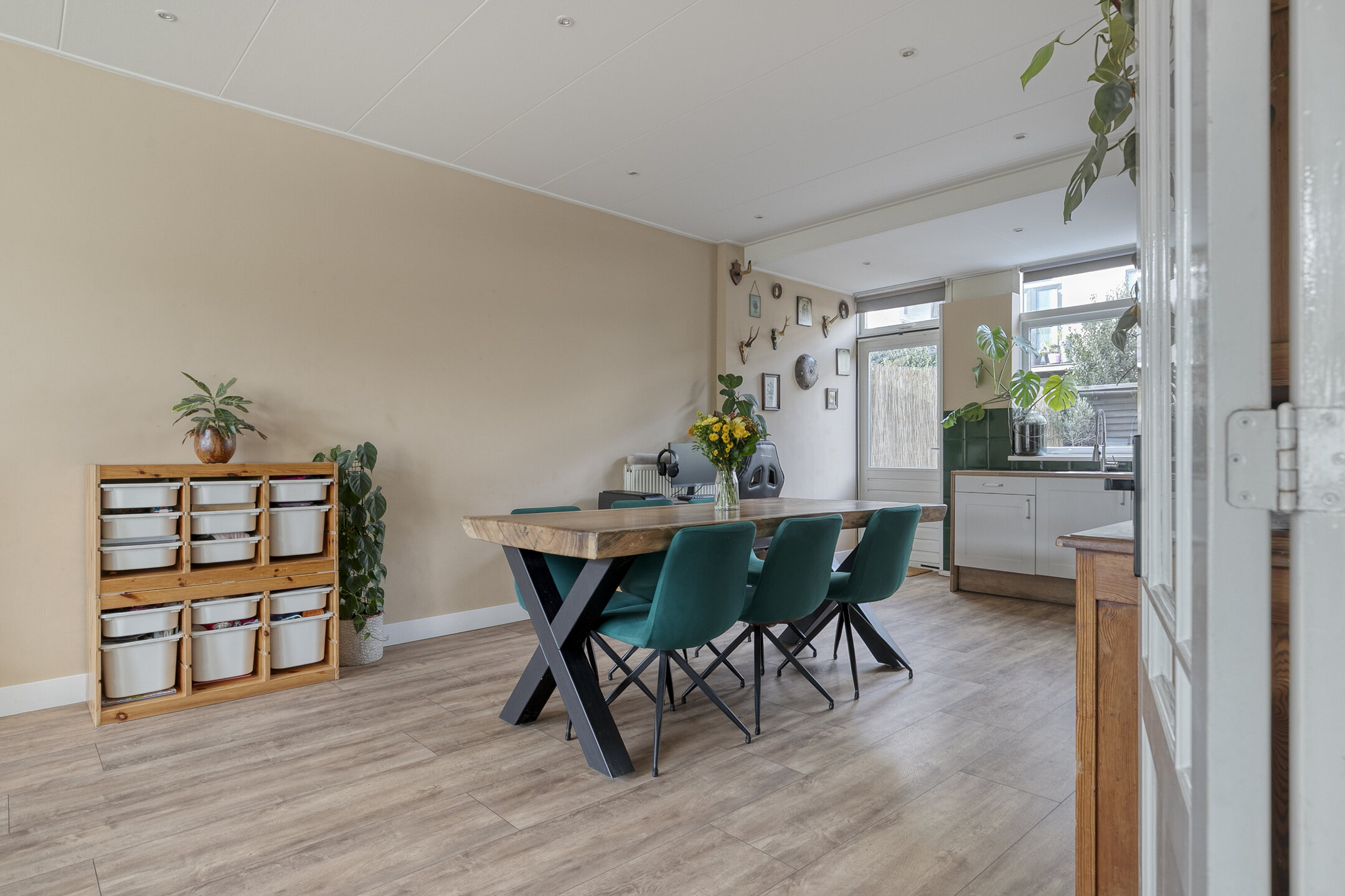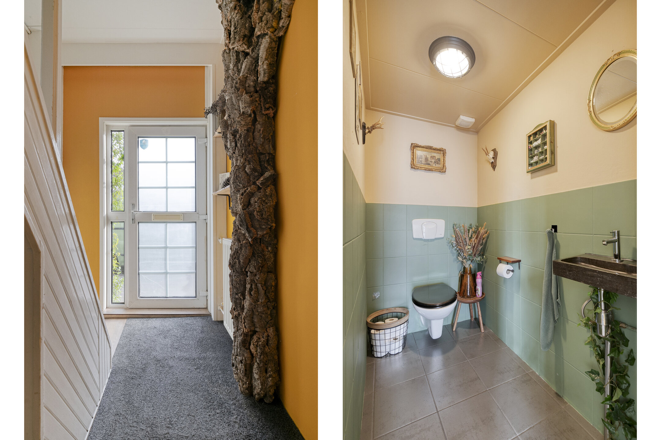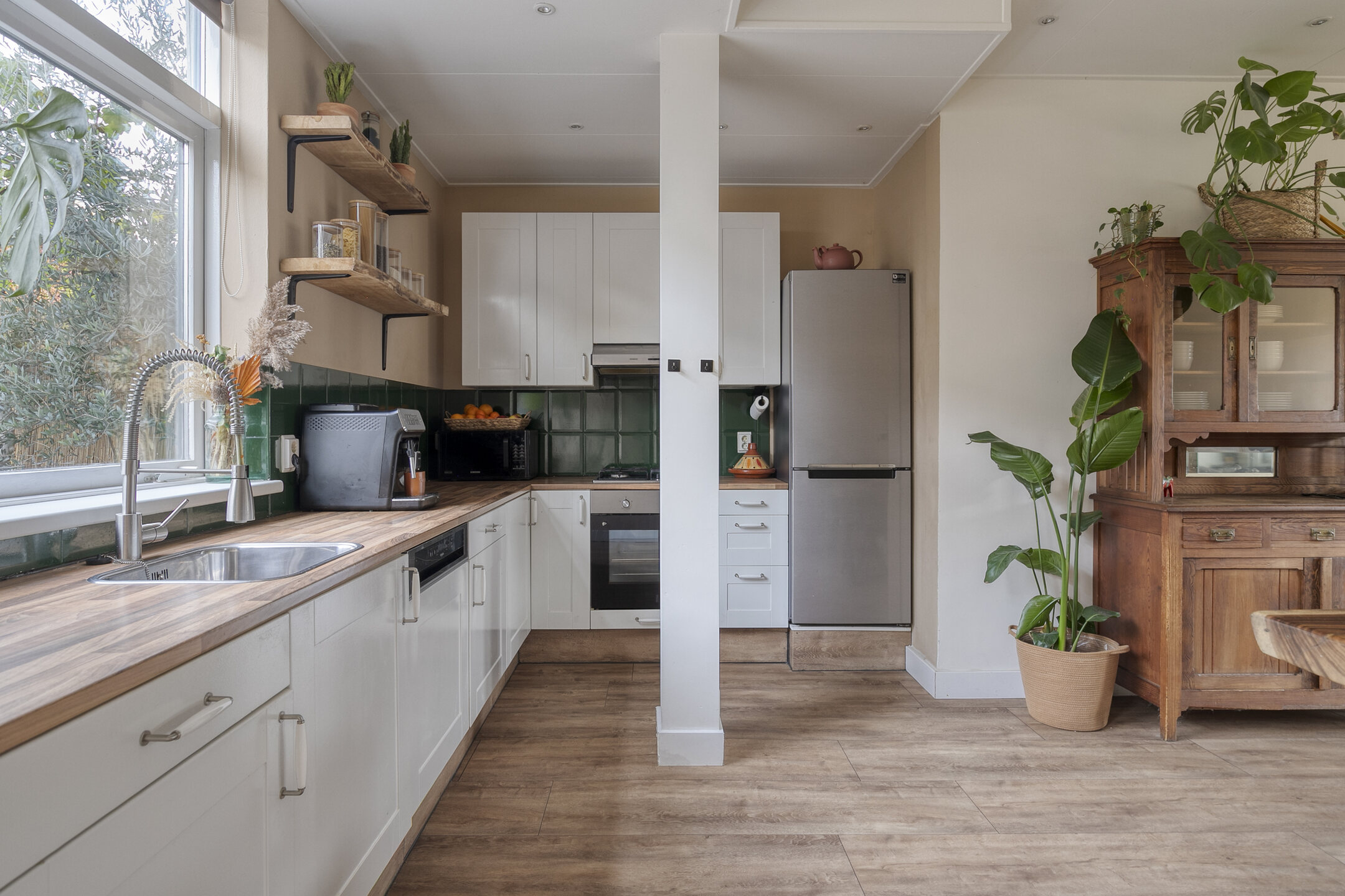 Entree met ruime hal, meterkast, schoenenkast onder de trap en extra bergruimte boven het toilet. Modern toilet met wandcloset en hardstenen fonteintje. De lichte en royale woonkamer staat in open verbinding met de keuken. De keuken, uitgevoerd in hoekopstelling, is voorzien van een 4-pits gaskookplaat, afzuigkap, oven en vaatwasser. Vanuit de woonkamer bereikt u de heerlijke achtertuin gelegen op het noordwesten, met houten berging voorzien van elektra.