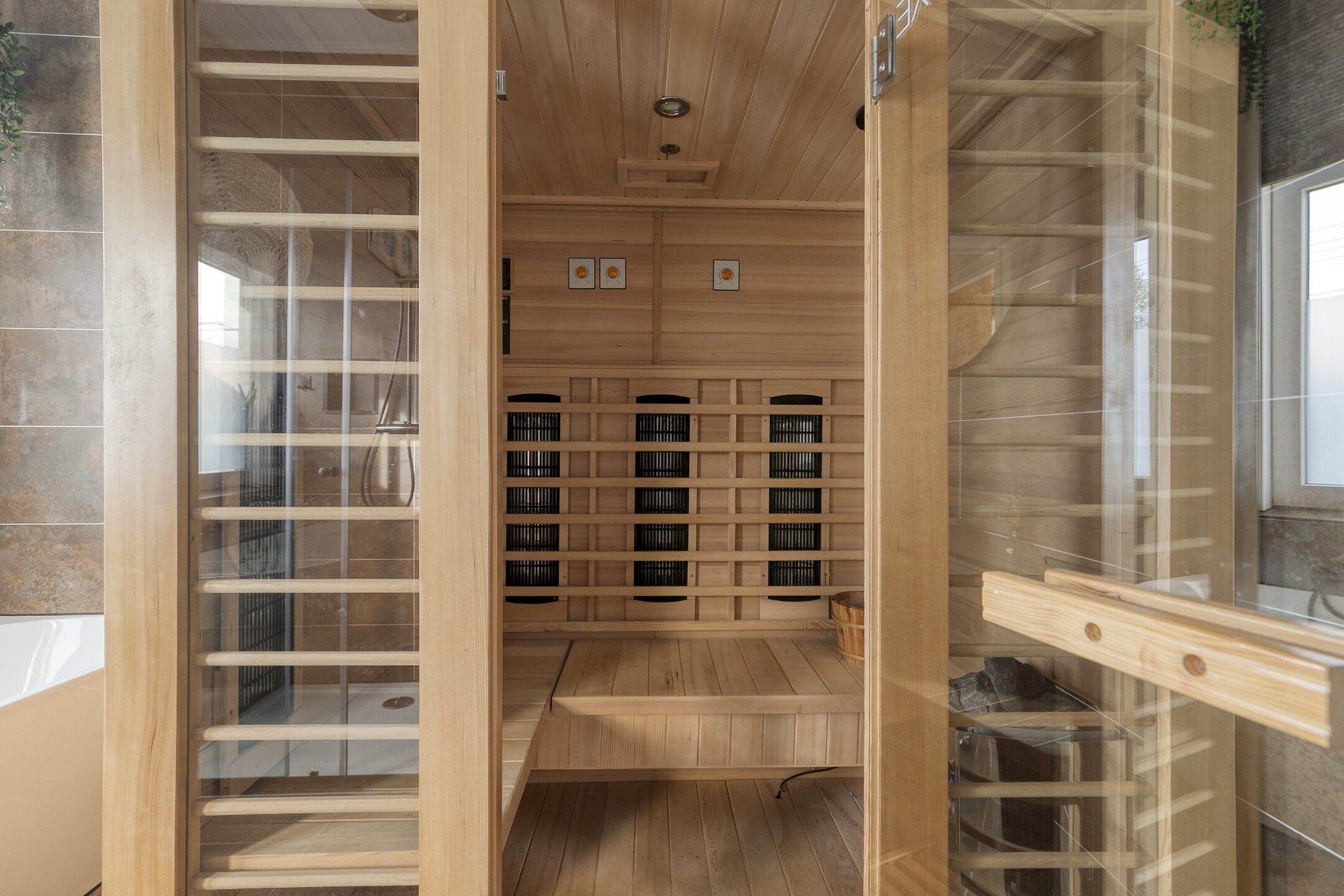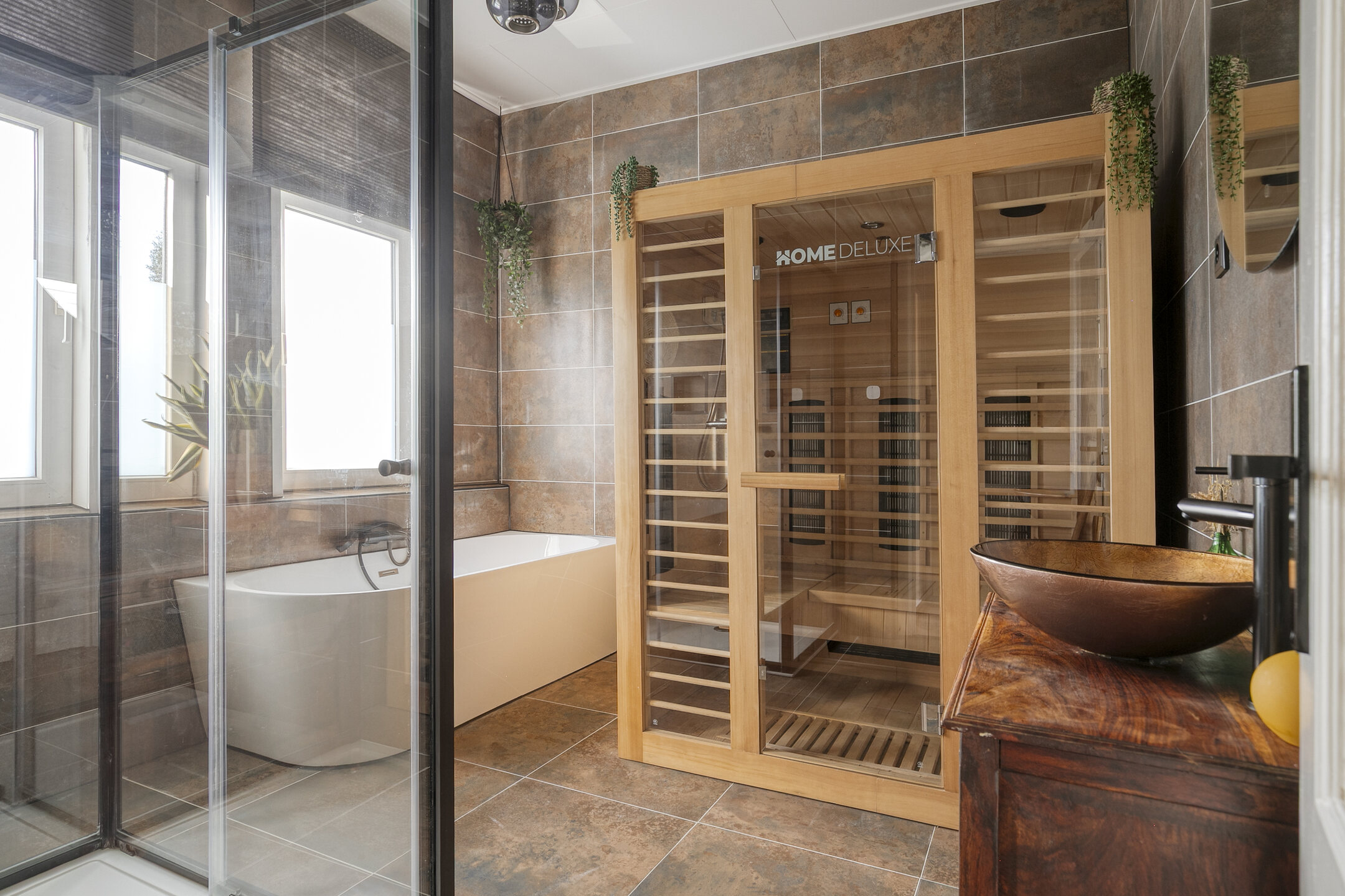 Overloop. Separate wasruimte met tweede wandcloset. De fraaie luxe badkamer (2024) is uitgerust met een Finse sauna (tevens infrarood), royaal ligbad, wastafelmeubel en ruime regendouche. De masterbedroom biedt toegang tot een extra ruimte/kamer/inloopkast met wastafel. Deze ruimte biedt ook weer toegang tot het balkon (noordwesten).